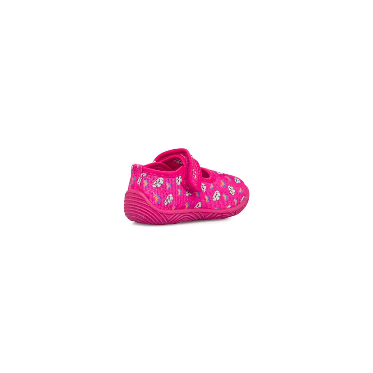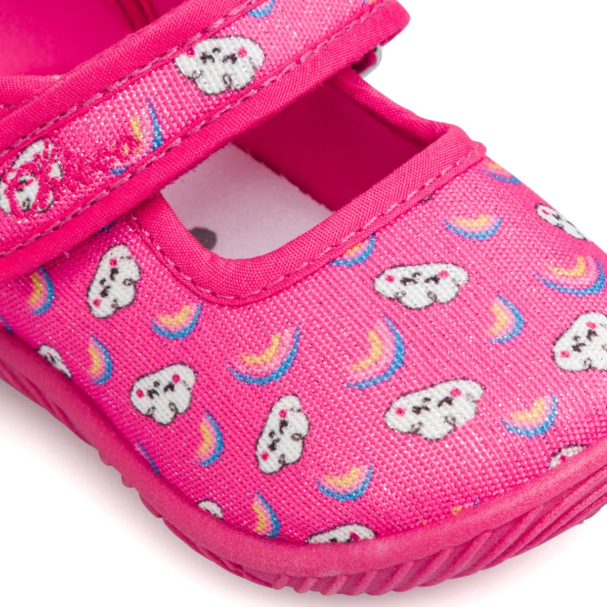 Pantofola/ballerina da bambina ad uso interno/esterno casa in tessuto glitter con stampa arcobaleno. Regolabile con velcro forma arrotondata. “Flex-zone” suola con linee di flessione per garantire la naturale flessibilità del piede.
