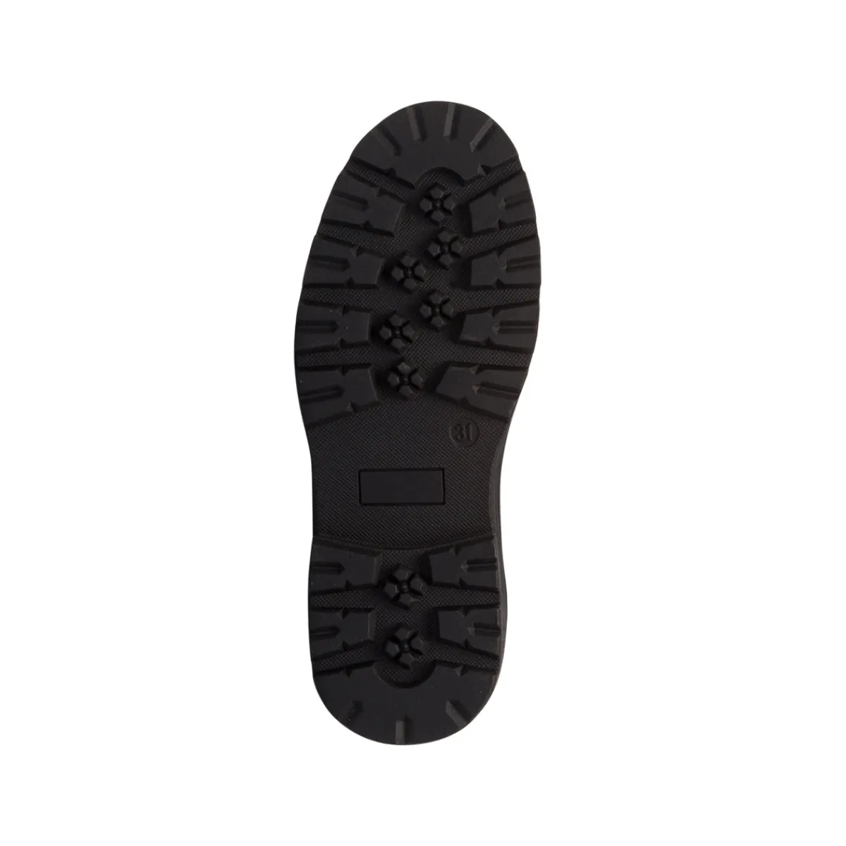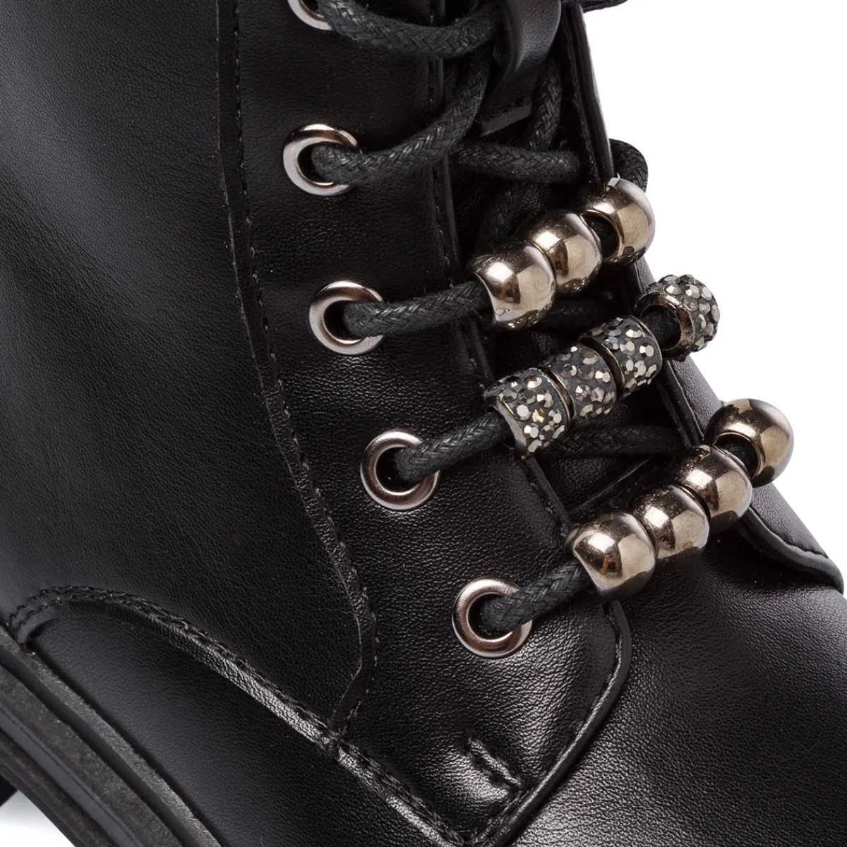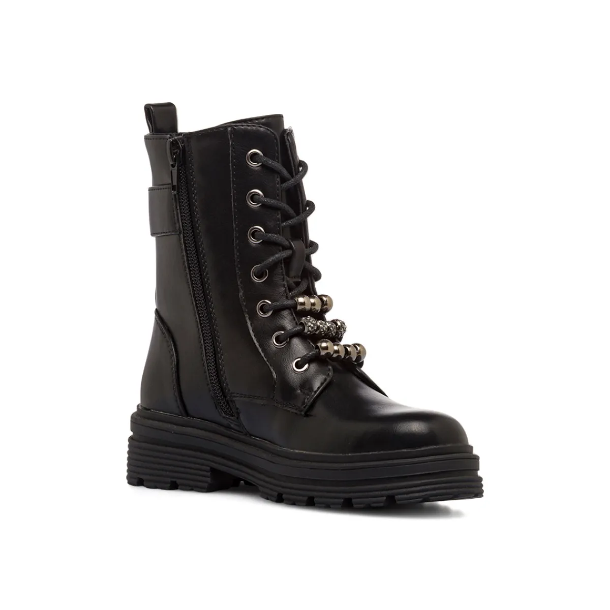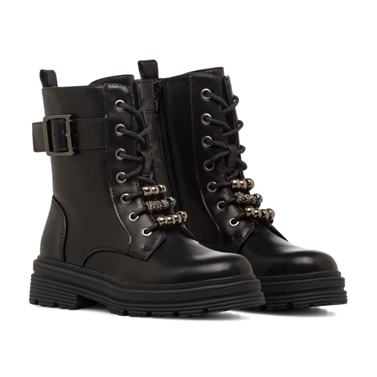Anfibi neri da ragazza del brand Dieci Baci, perfetti per un look grintoso e di tendenza. Realizzati in similpelle, presentano una chiusura con zip laterale, lacci decorati con dettagli in metallo e una fibbia regolabile sul gambale. La suola è in materiale sintetico. Ideali per affrontare ogni avventura con stile e comfort.