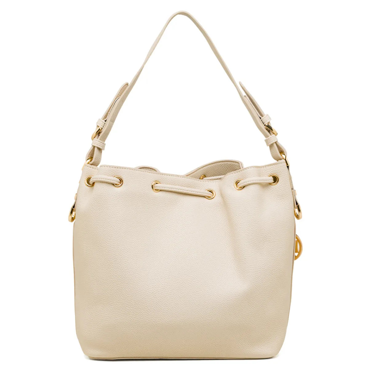 Borsa a secchiello bianca off-white da Donna, in similpelle con rifiniture color oro, manico con fibbia decorativa, chiusura con bottone automatico e cordoncino con passanti. Interno in similpelle colore arancione e comodo taschino.