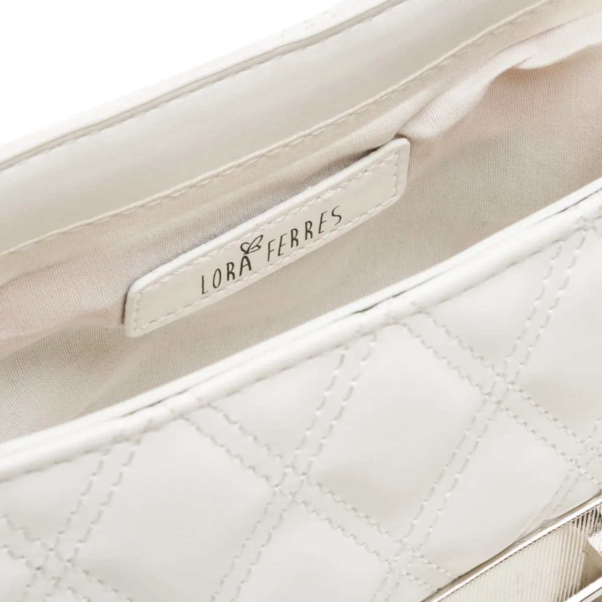 Elegante borsetta a tracolla bianca da donna Lora Ferres, caratterizzata da un effetto trapuntato a rombi. Realizzata con un materiale sintetico di alta qualità, questa borsa è perfetta per completare il tuo look quotidiano o per occasioni speciali. La chiusura con bottone magnetico e la tracolla a catena aggiungono un tocco di stile e praticità. Il rivestimento interno in materiale tessile assicura la protezione dei tuoi oggetti. Un accessorio chic e versatile per la donna moderna.