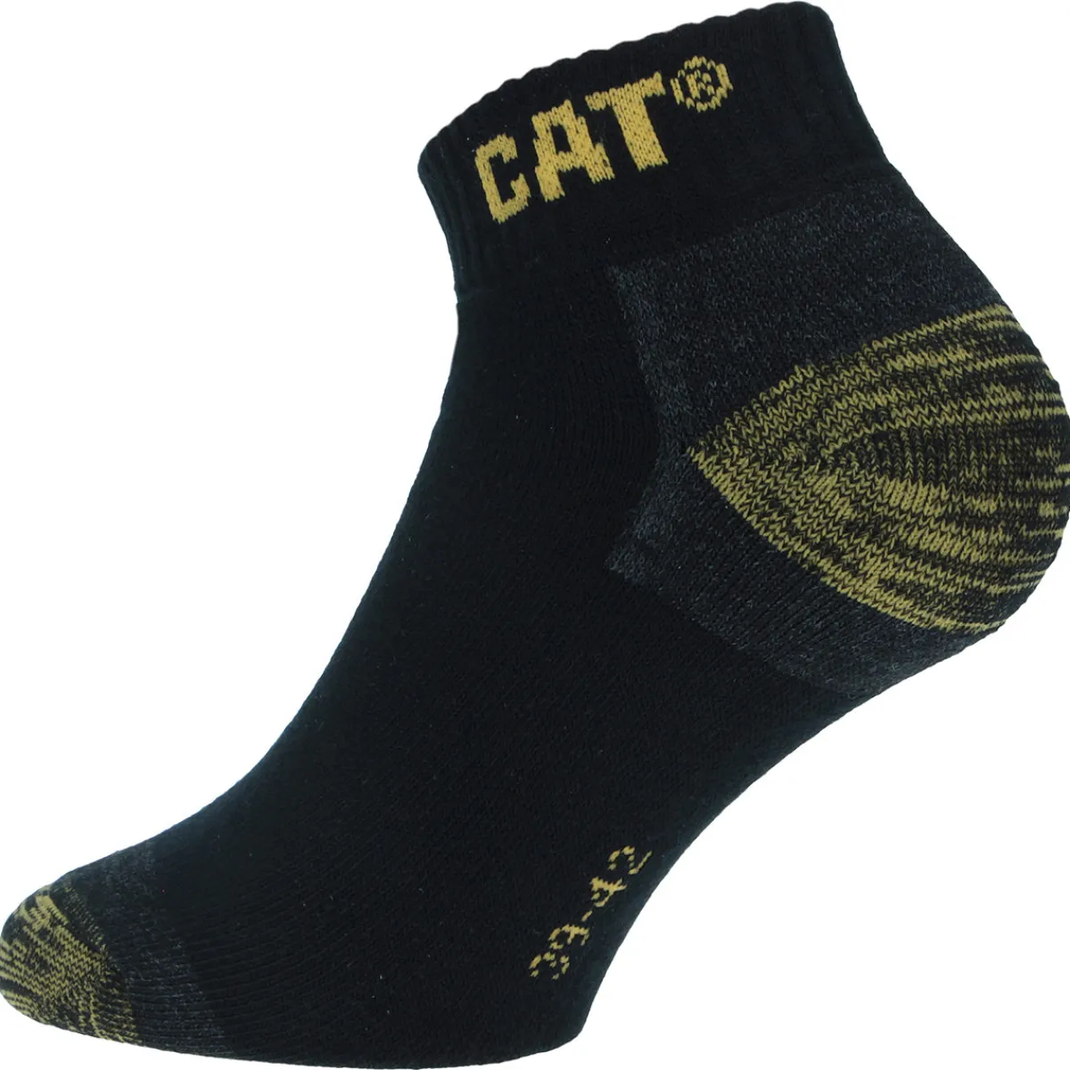 Calzini corti tecnici o da lavoro neri del brand Caterpillar in cotone. Rinforzati su punta e tallone, offrono resistenza comfort e traspirabilità per tutta la giornata. Perfetti con scarpe da trekking e antinfortunistiche. Ottimi per fare scarpinate in montagna ed anche per lavoratori edili, tecnici, meccanici, cuochi e altri professionisti. Set 3 paia di calzini.