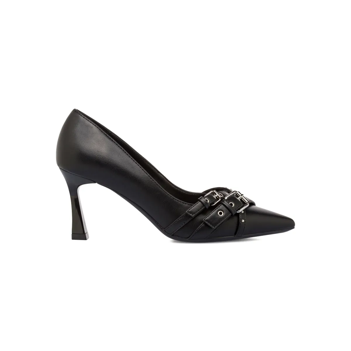 Eleganti décolleté nere da donna, perfette per occasioni speciali. Il design raffinato presenta fibbie e borchie metalliche, aggiungendo un tocco di stile. Il tacco a rocchetto da 7,5 cm dona slancio ed eleganza. Tomaia in similpelle. Ideali per serate eleganti o eventi formali.