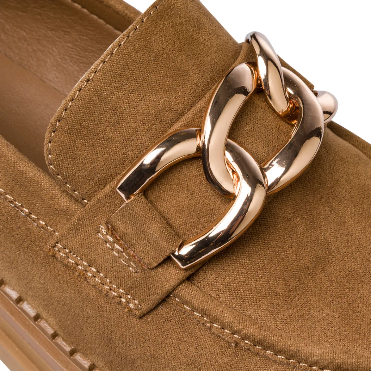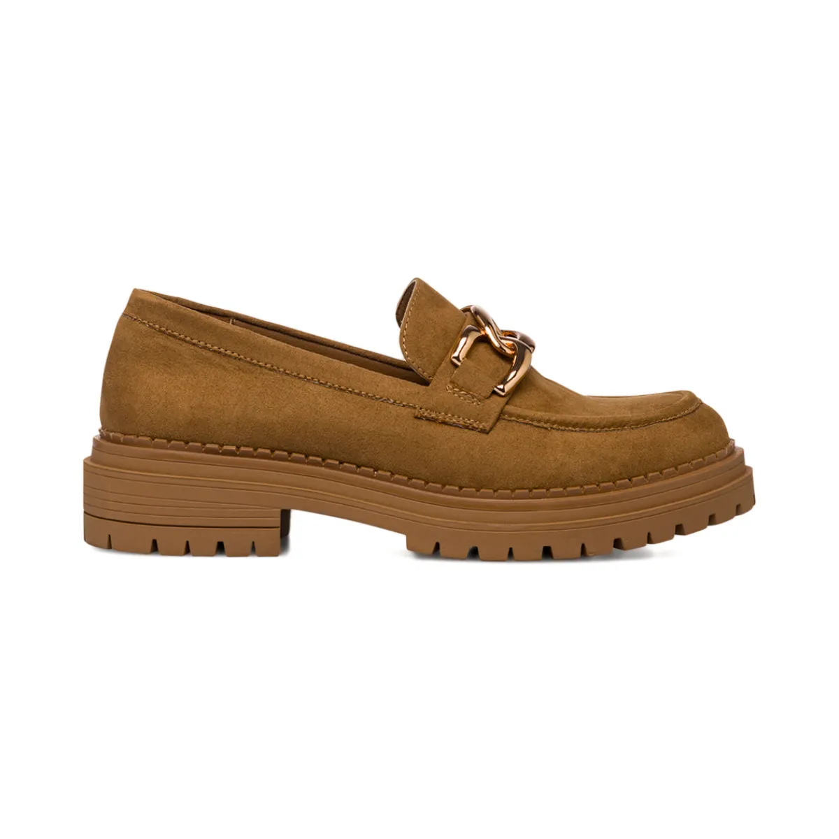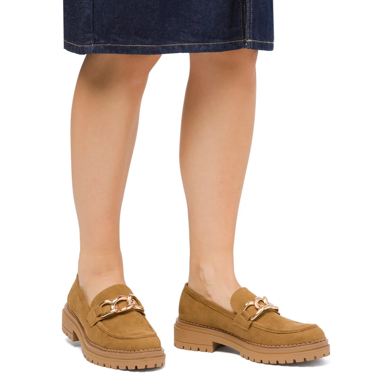Mocassini da donna marroni Swish Jeans con fibbia e suola chunky. La tomaia è in materiale sintetico effetto scamosciato. La suola è in gomma e la soletta è in sintetico. I dettagli della fibbia argentata rendono questo modello unico e versatile. Perfetti per un look casual chic.