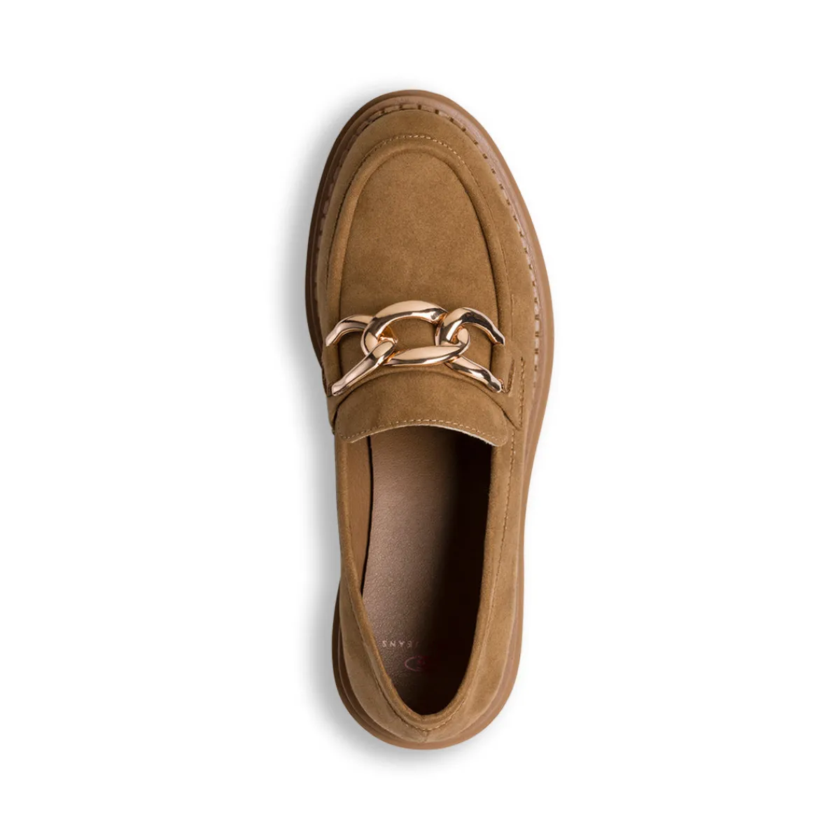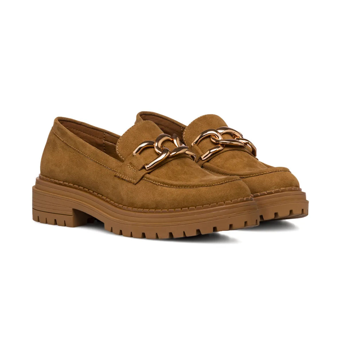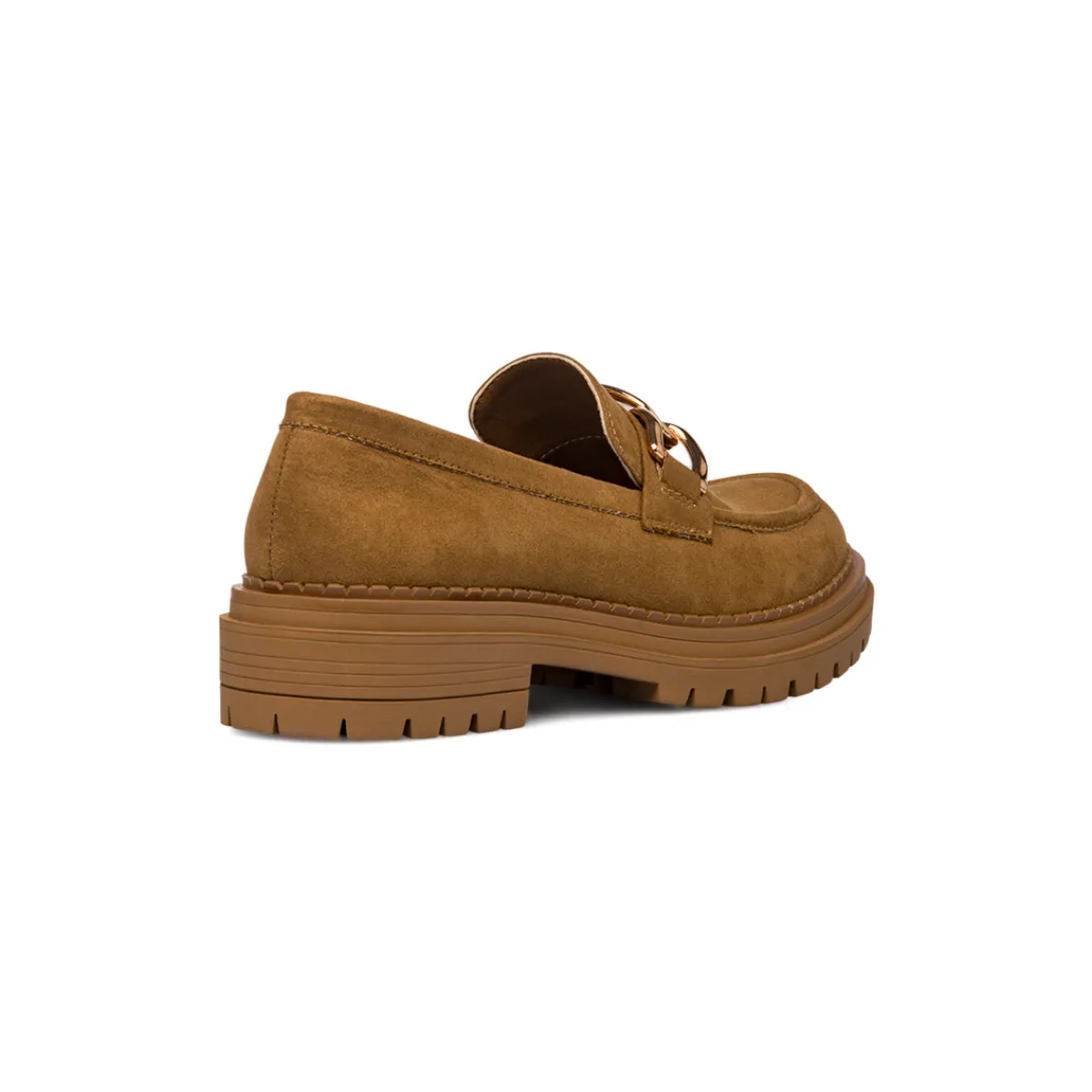 Mocassini da donna marroni Swish Jeans con fibbia e suola chunky. La tomaia è in materiale sintetico effetto scamosciato. La suola è in gomma e la soletta è in sintetico. I dettagli della fibbia argentata rendono questo modello unico e versatile. Perfetti per un look casual chic.