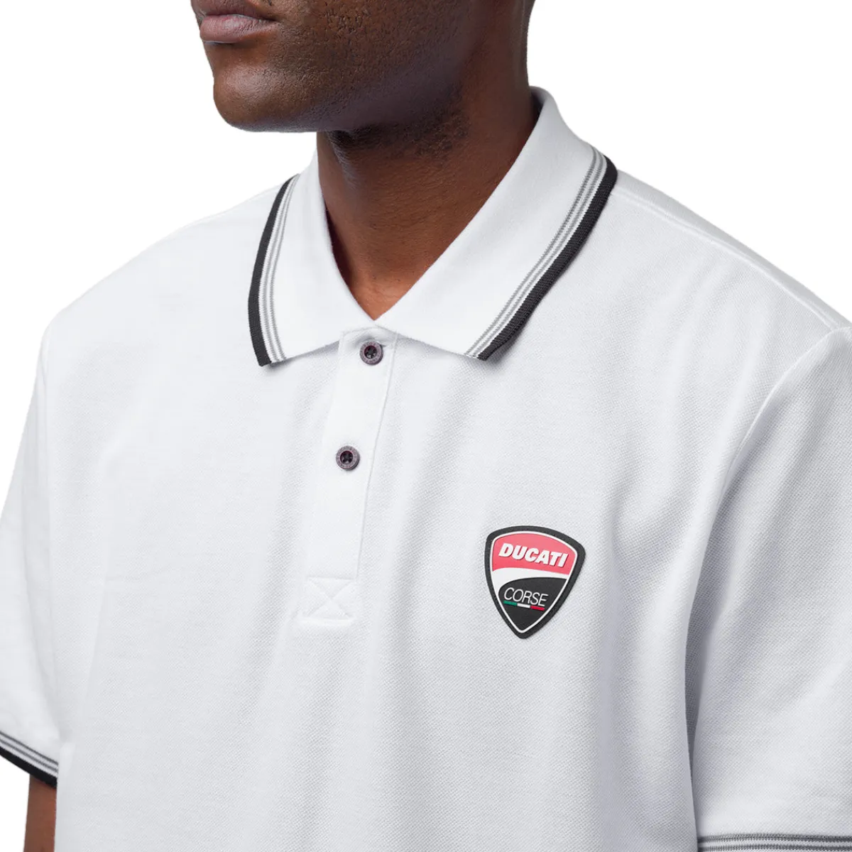 Polo da uomo bianca firmata Ducati Corse, in cotone con dettagli grigi e neri sul colletto, e logo in gomma sul petto.