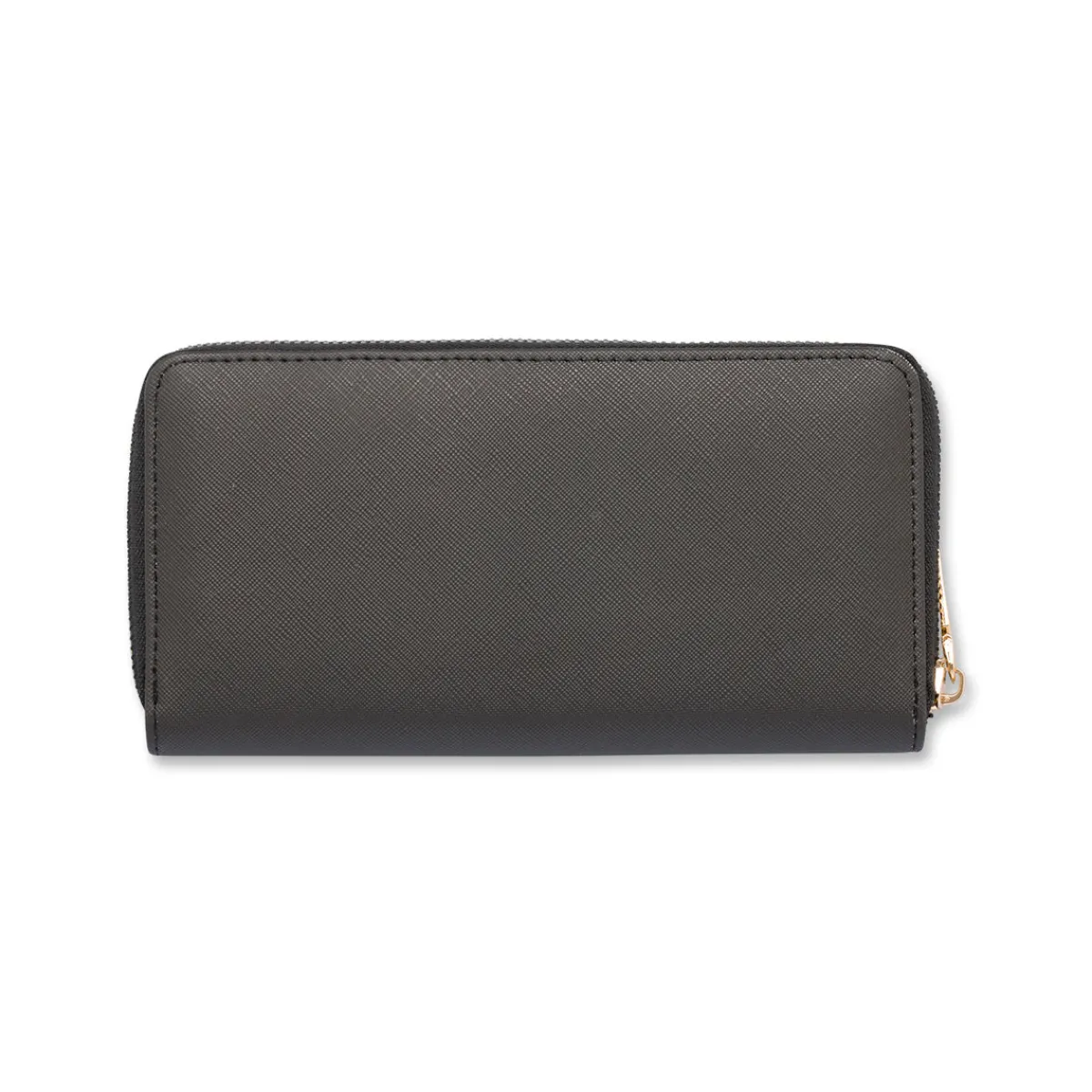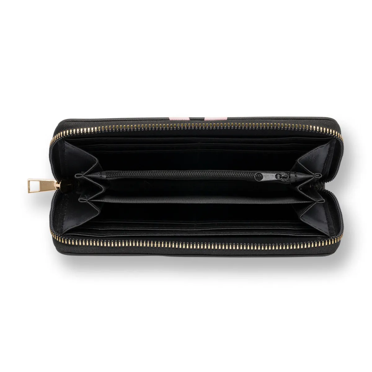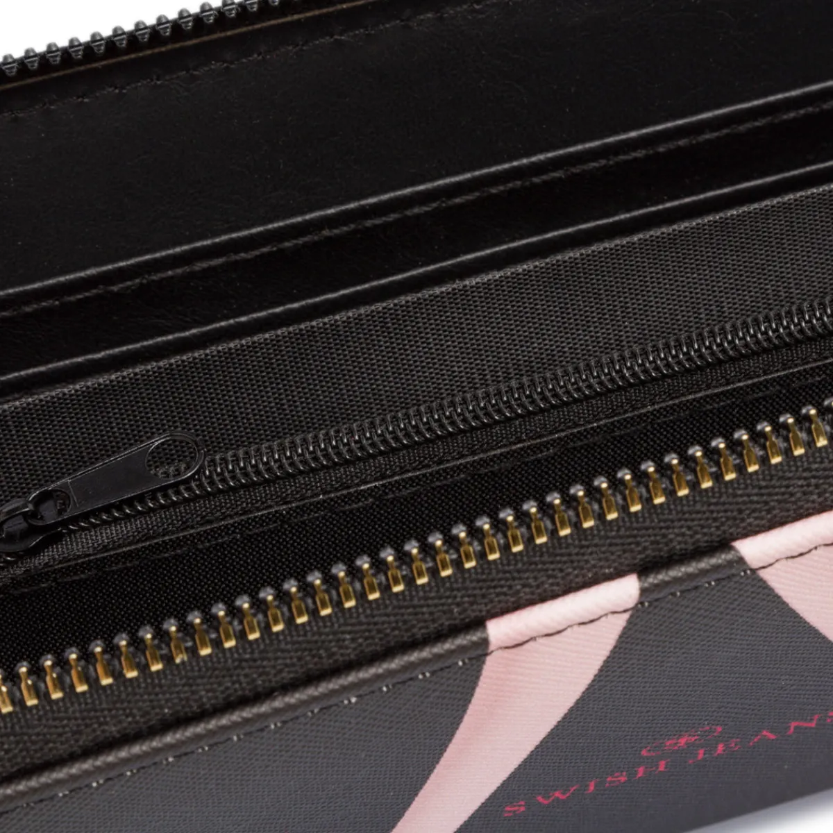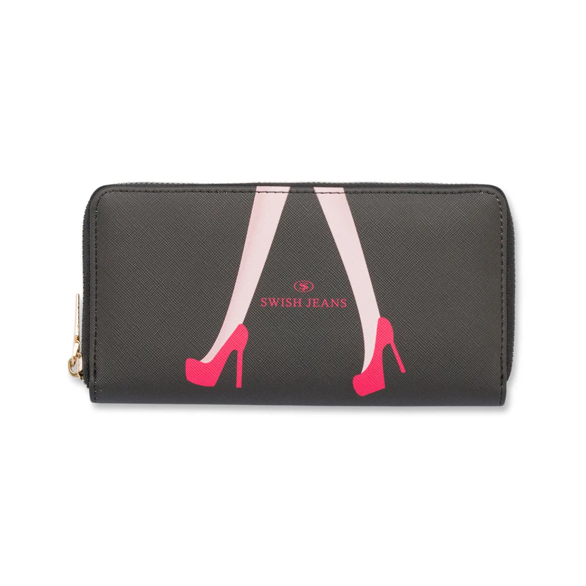 Portafoglio nero da donna Swish Jeans realizzato in similpelle con stampa gambe, dotato di tasca per monete e banconote e numerosi scomparti per carte di credito, chiusura con zip rifinita in color oro.