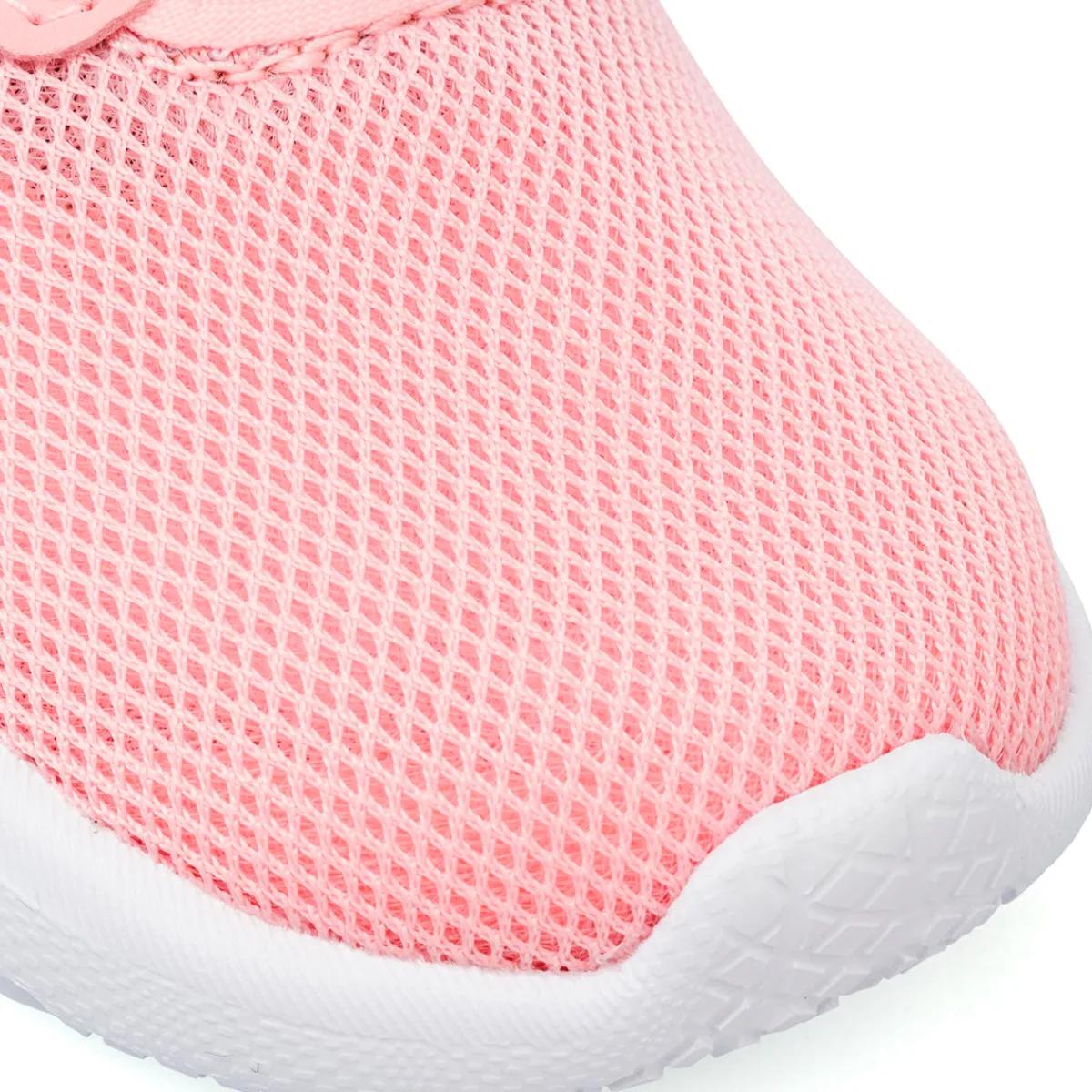 Sneakers da bambina primi passi in tessuto mesh colore rosa, logo a contrasto, lacci elastici e strappo in velcro. Doppio tirante per facilitare la calzata.