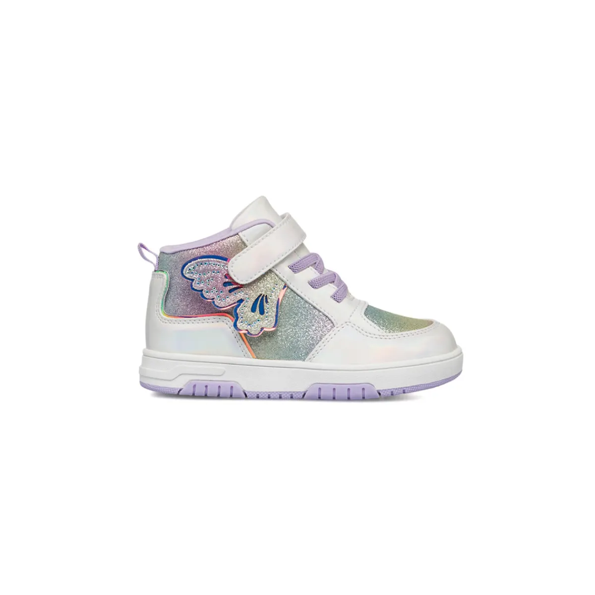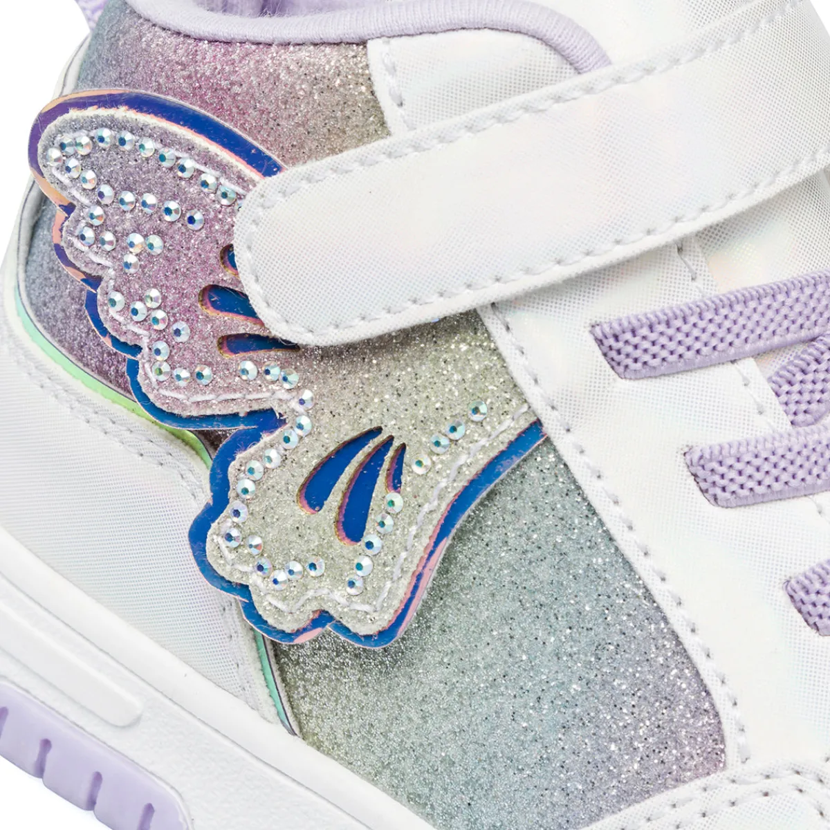 Sneakers da bambina Le scarpe di Alice in similpelle colore bianco, con inserti lilla e glitter, dettaglio farfalla laterale, lacci elastici e chiusura con strappo in velcro.