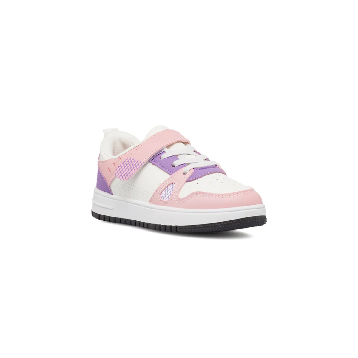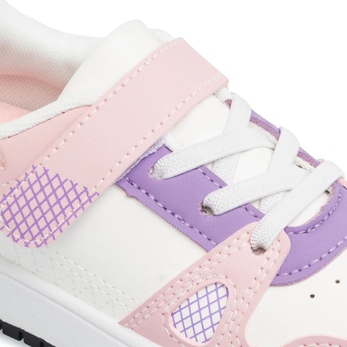Sneakers da bambina Le Scarpe di Alice in similpelle bianche con dettagli rosa e lilla, lacci elastici tono su tono, chiusura a strappo in velcro, dettagli traforati e tirante sul retro