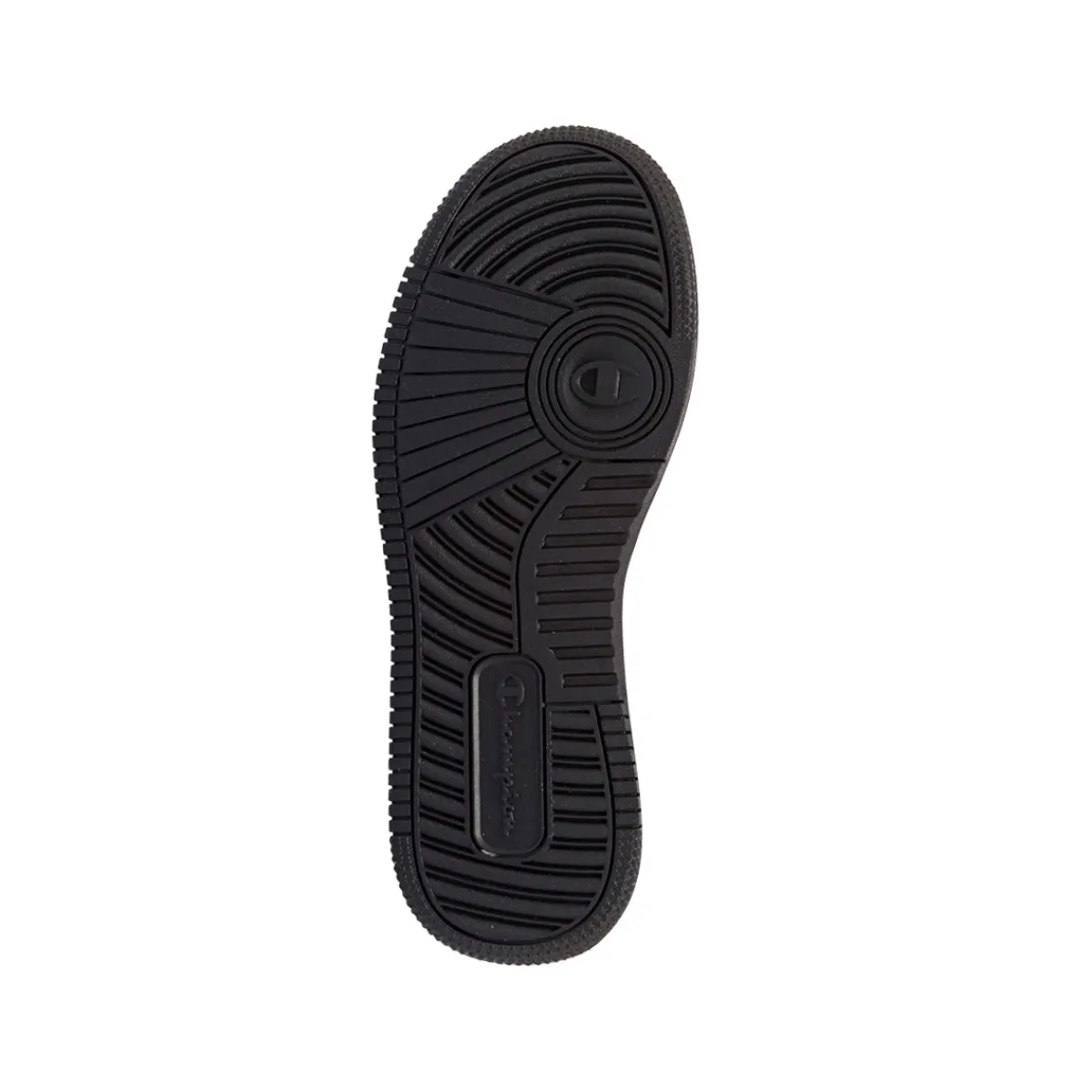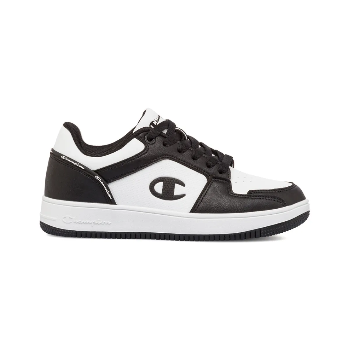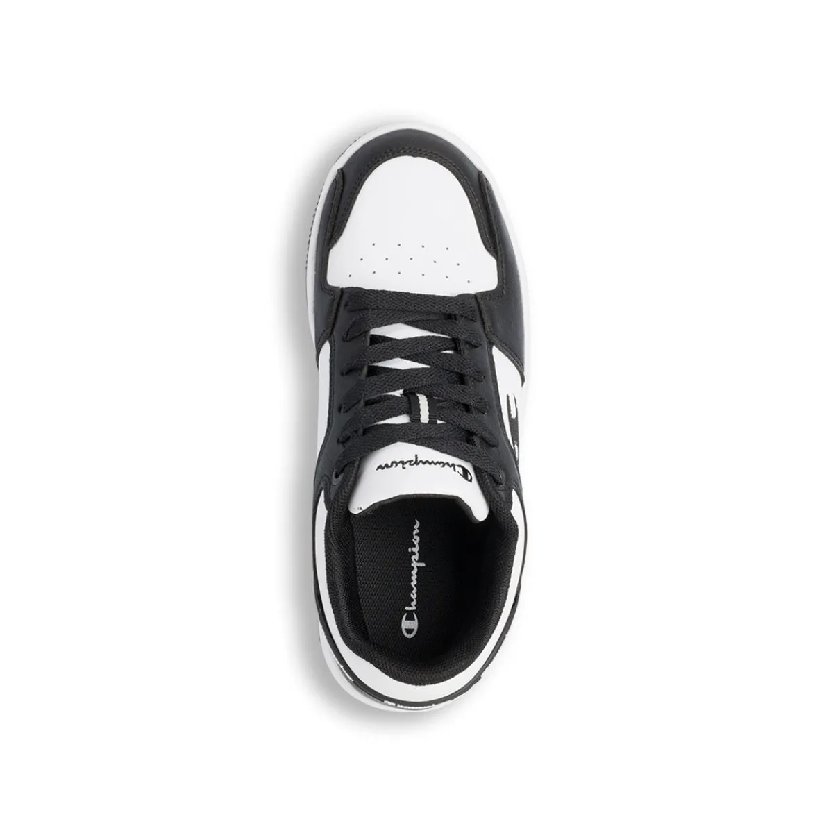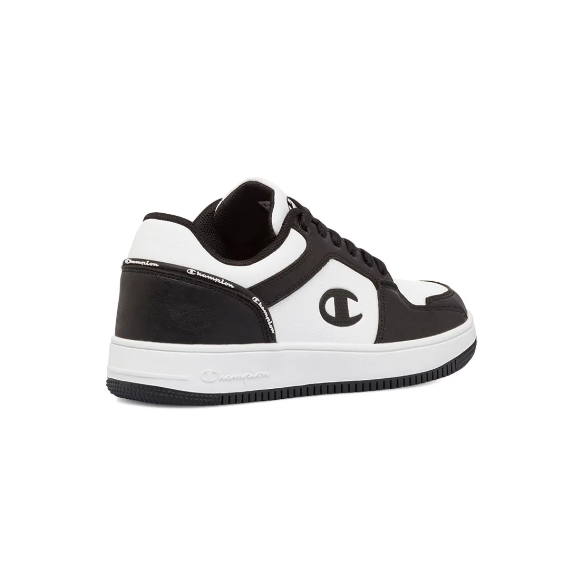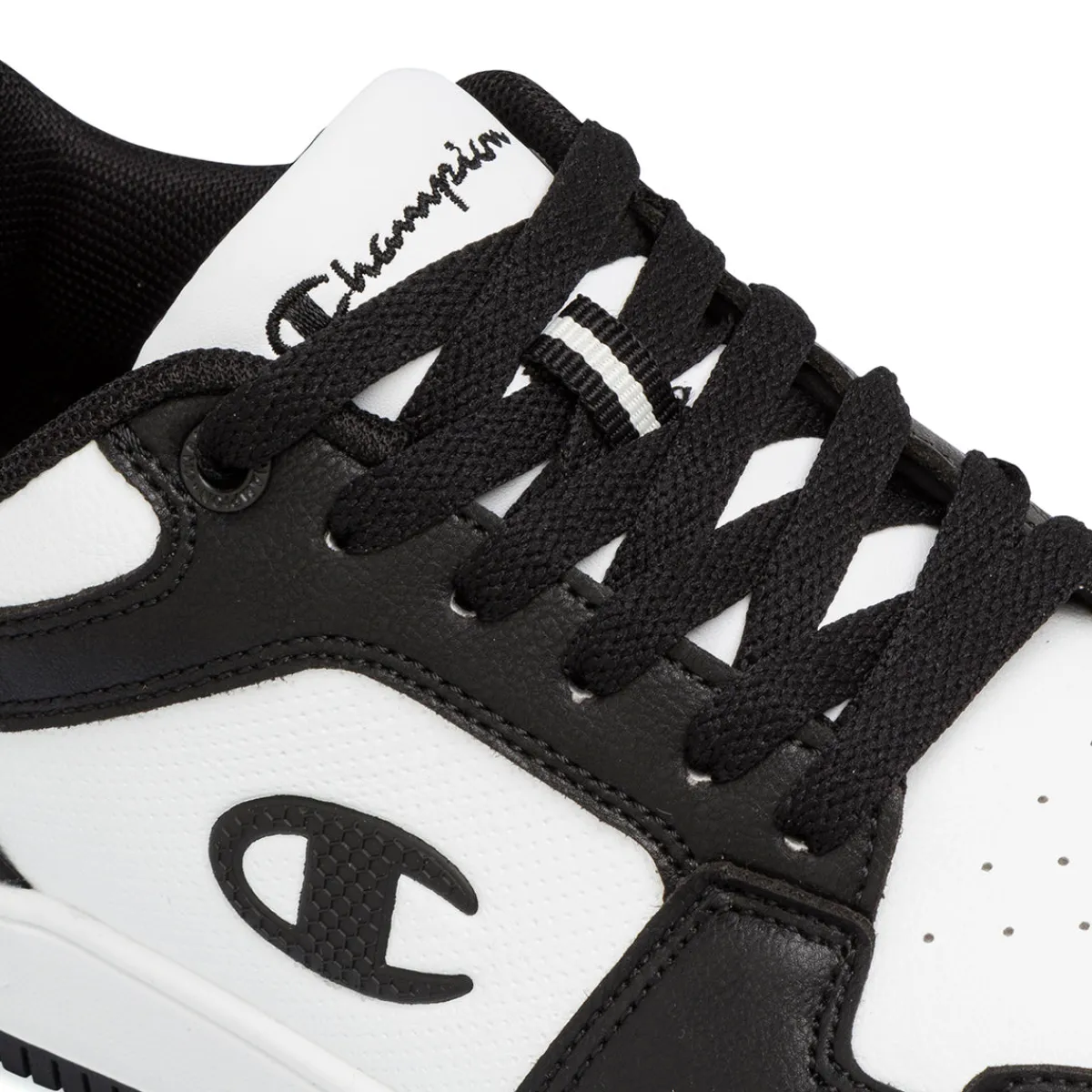 Sneakers da ragazzo Champion RD18 2.0 low, in similpelle colore bianco e nero, dettagli traforati, lacci a contrasto, logo sulla linguetta, laterale, suola e tallone.