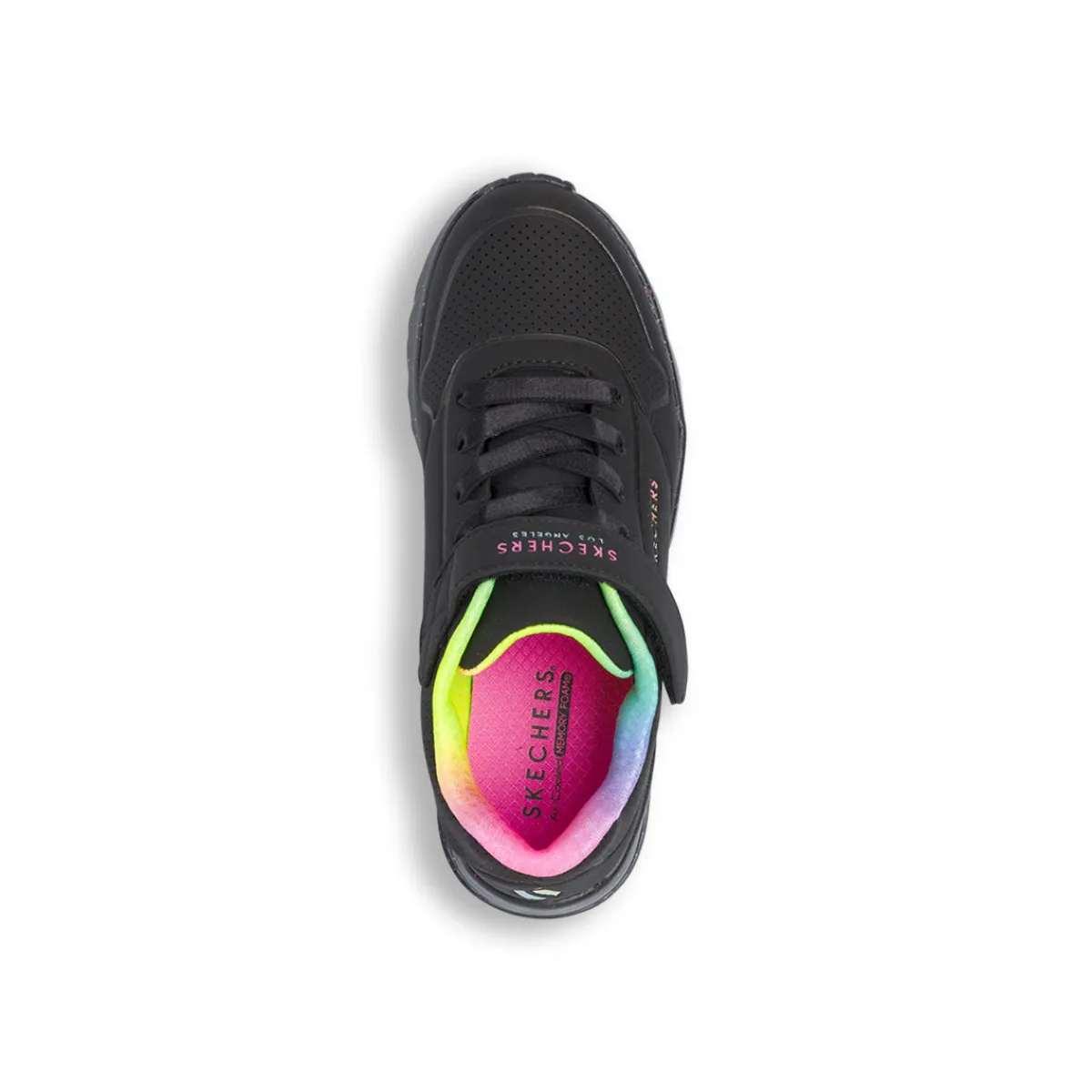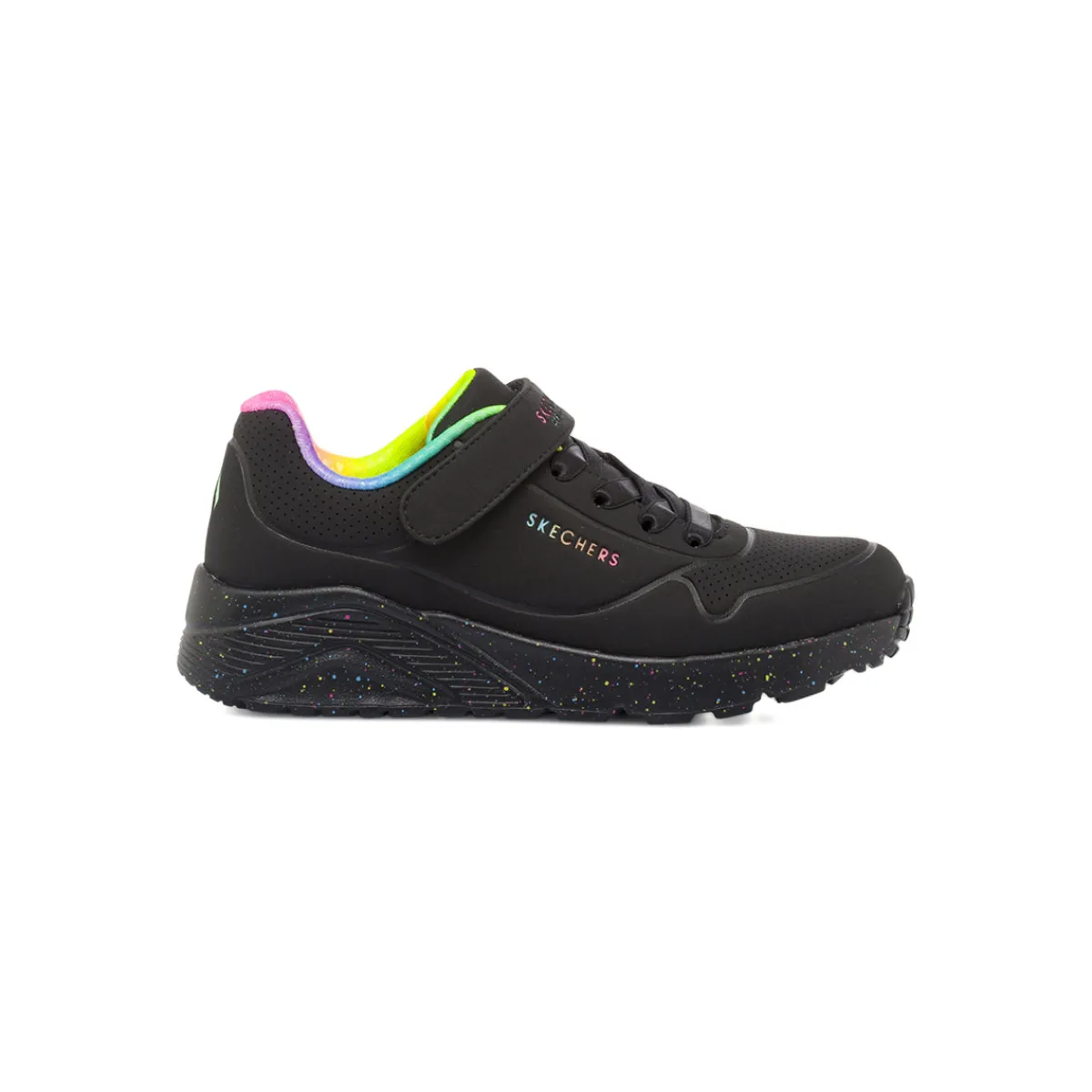 Illumina ogni passo con le Skechers Street Uno Lite da bambina, sneakers dal look moderno e super trendy. La tomaia in materiale sintetico nero opaco con dettagli forati assicura resistenza e comfort, mentre la chiusura a strappo con lacci elasticizzati garantisce una calzata facile e sicura. Il design total black si accende grazie all’interno arcobaleno e alla suola con luci integrate e dettagli glitterati che regalano un tocco di magia e originalità. L’intersuola ammortizzata offre comfort durante tutta la giornata, perfetta per la scuola, il tempo libero o le uscite con le amiche. Queste sneakers uniscono lo stile urban di Skechers alla funzionalità delle luci, per un look che non passa inosservato.