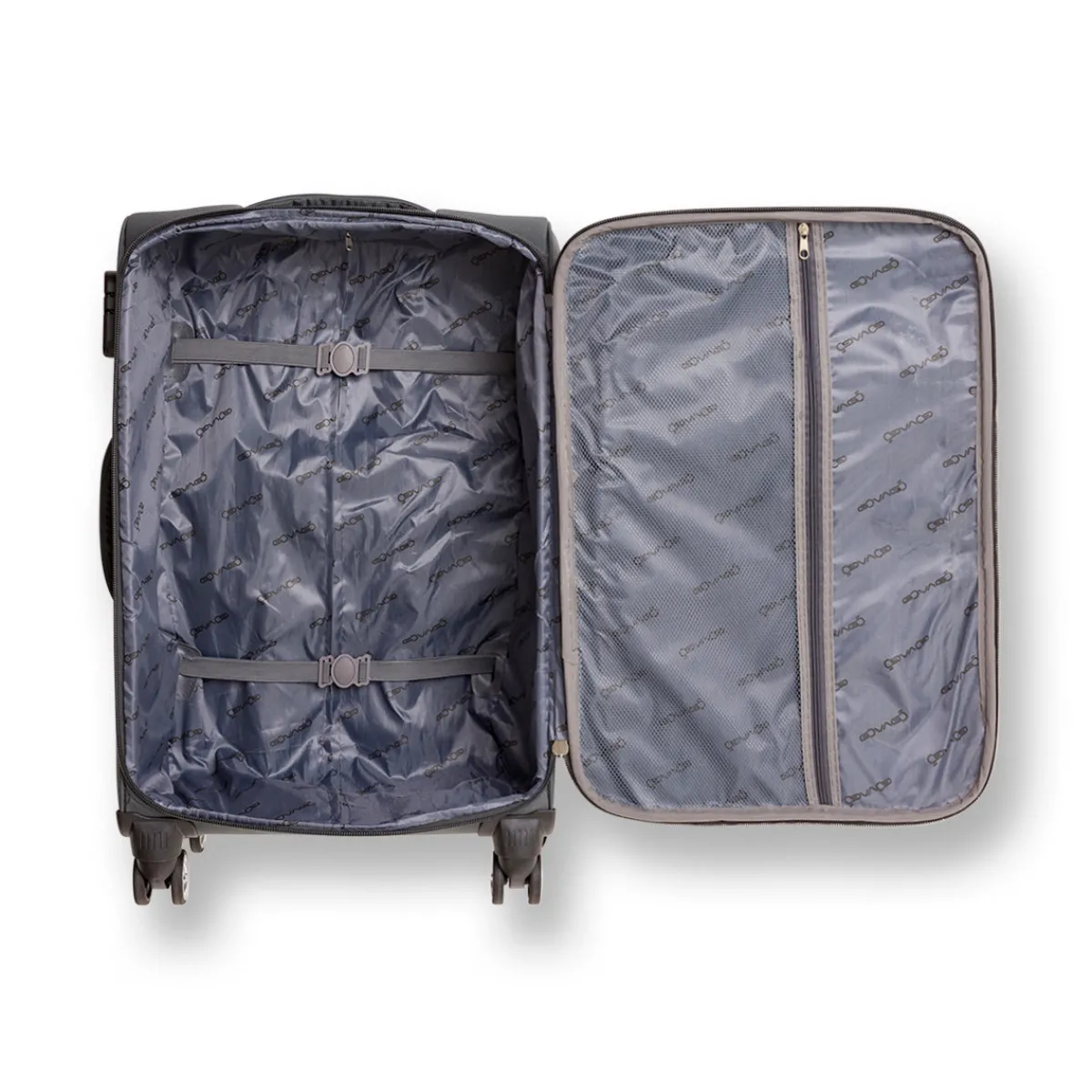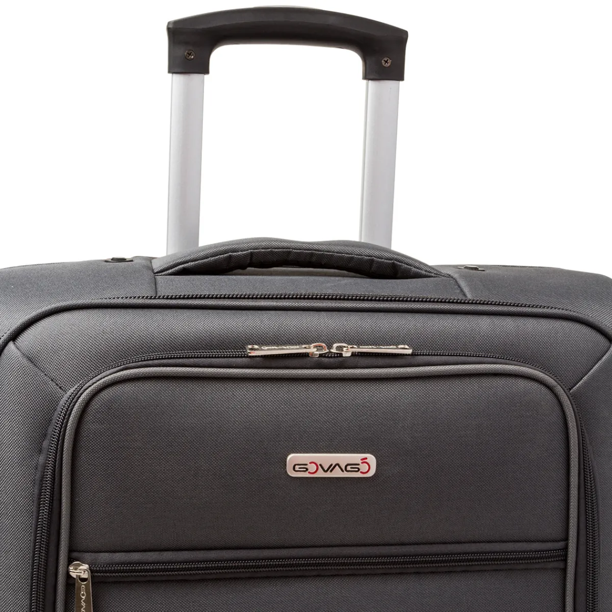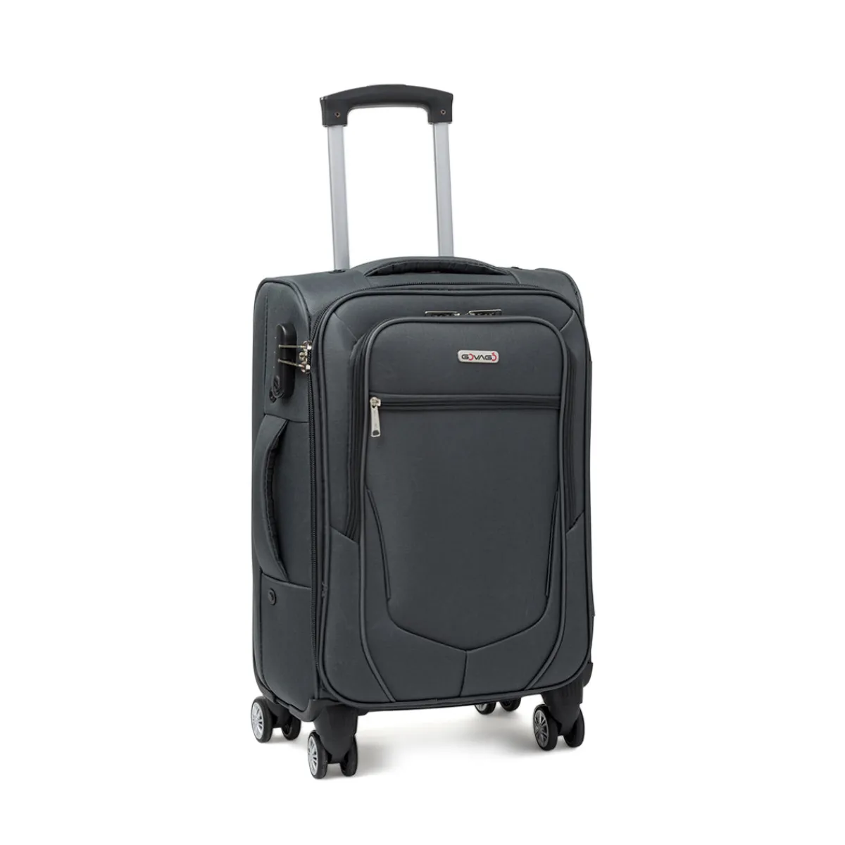 Trolley Bagaglio a mano Govago in tessuto colore grigio antracite, 4 ruote bidirezionali, manico retrattile, chiusura con zip a combinazione, maniglia superiore e laterale integrata, interno foderato, scomparto principale con fasce ferma abiti e tasche esterne con dettaglio a contrasto.