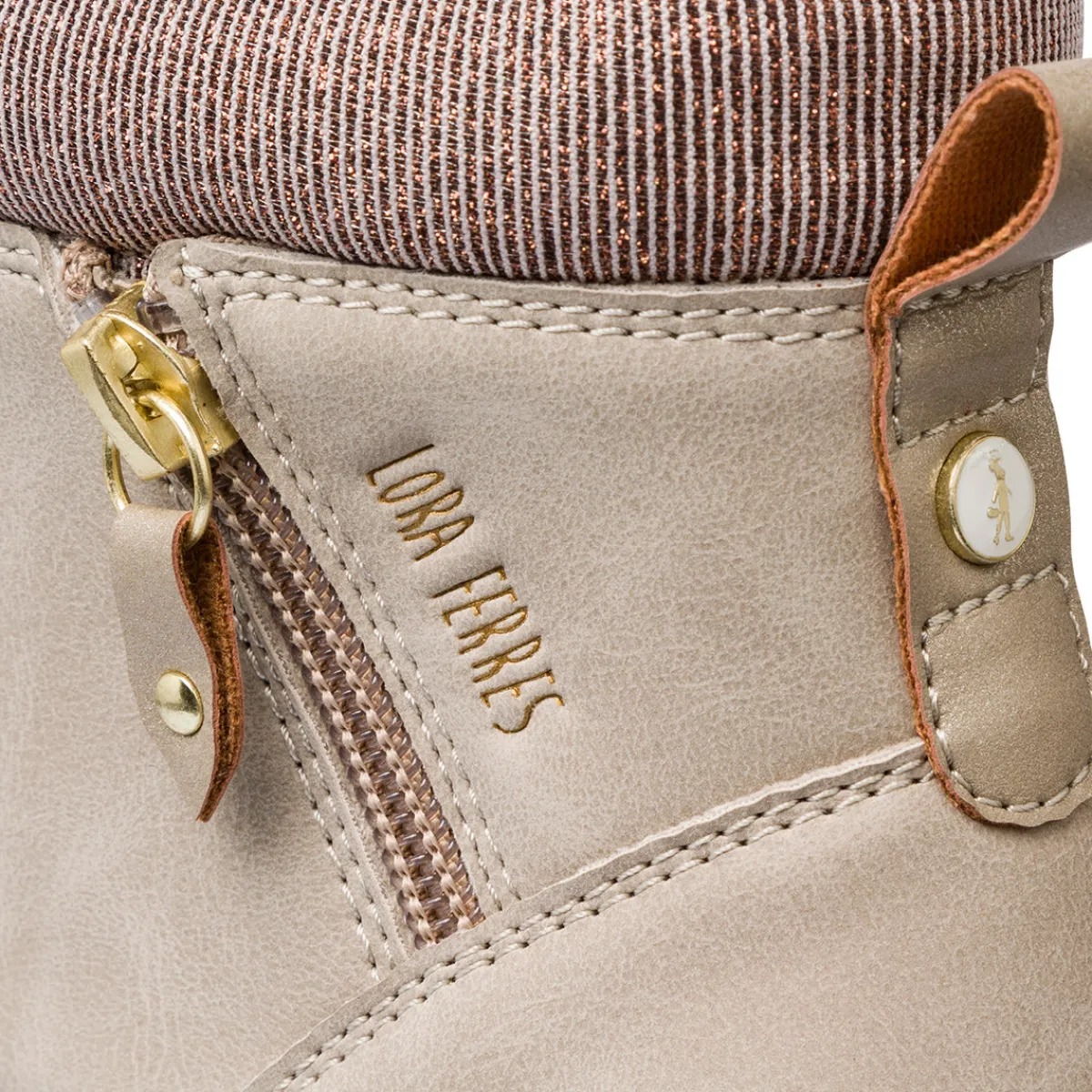 Scopri gli Anfibi beige da Donna con zip laterale di Lora Ferres, perfetti per un look casual e grintoso. Realizzati in similpelle, con fodera in similpelle e materiale tessile, questi anfibi sono comodi e alla moda. La suola in materiale sintetico garantisce un’ottima aderenza al terreno. Ideali per le giornate fredde e umide, questi anfibi sono un must-have per ogni guardaroba femminile. Il colletto imbottito presenta dettagli glitter.