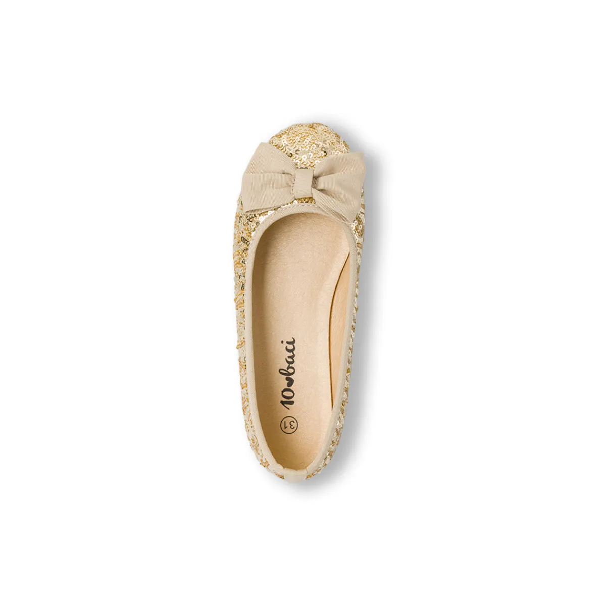 Queste ballerine oro da Ragazza del marchio Dieci Baci sono perfette per occasioni speciali! Realizzate con una tomaia scintillante di paillettes oro, queste scarpe sono decorate con un elegante fiocco sul davanti. La soletta in materiale tessile garantisce comfort, mentre la suola in materiale sintetico assicura una buona aderenza. Un tocco di magia per i piedi della tua bambina. Ideali per feste, cerimonie o per rendere speciale ogni giorno.