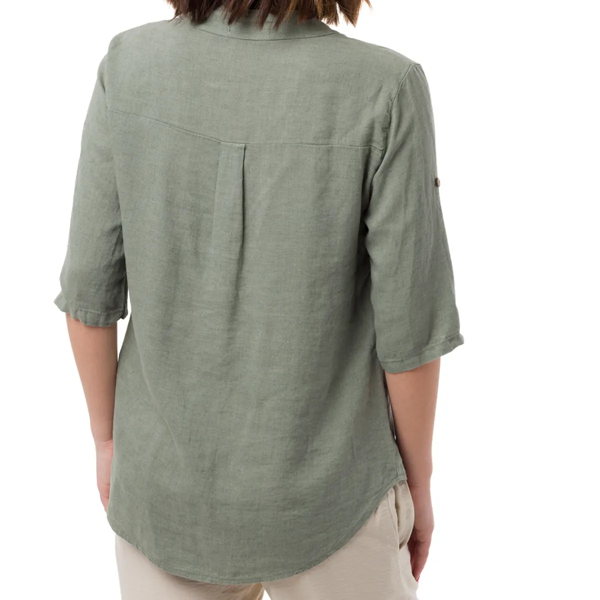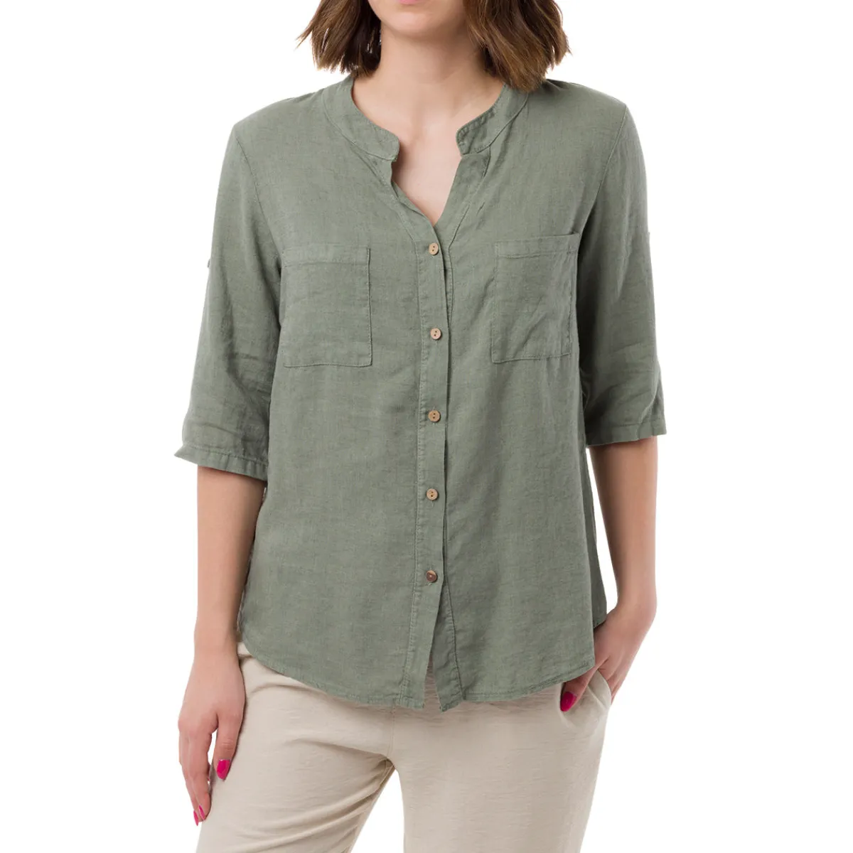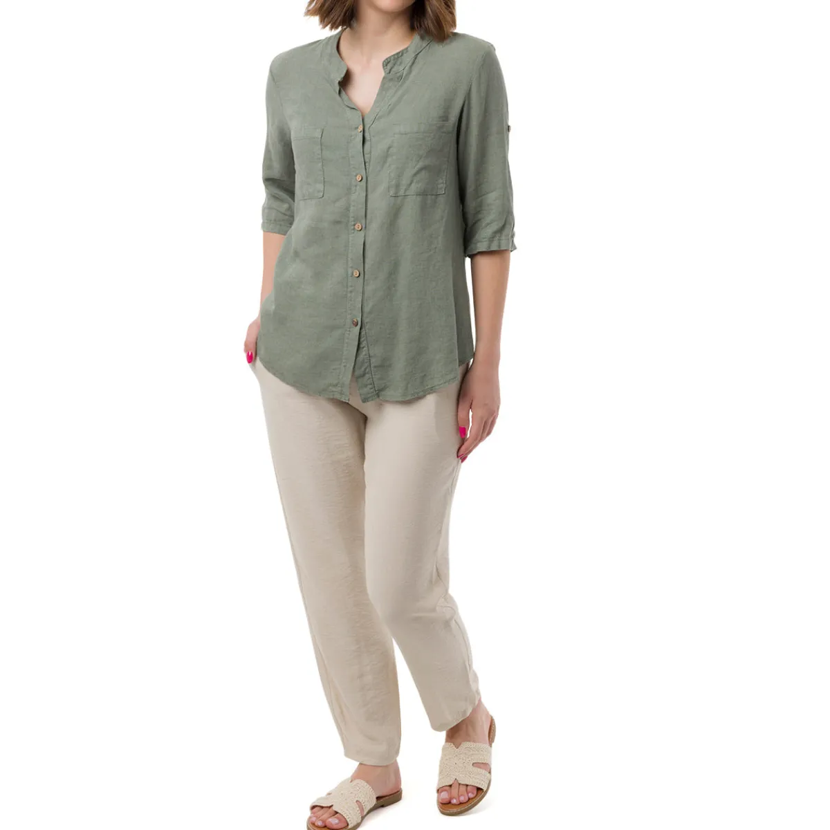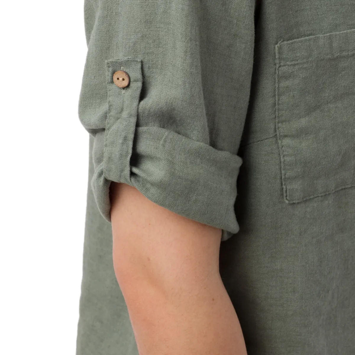 Fresca, pratica e super chic: la camicia verde da donna Swish Jeans in misto lino è perfetta per i look estivi. Il collo alla coreana aggiunge un tocco moderno, mentre il cinturino con bottone ti permette di portare la manica anche a tre quarti. Le due taschine frontali a patta e i bottoni effetto legno completano lo stile con dettagli naturali. Il fondo leggermente svasato valorizza la silhouette. Ideale su jeans, pantaloni ampi o shorts per un outfit easy ma curato.