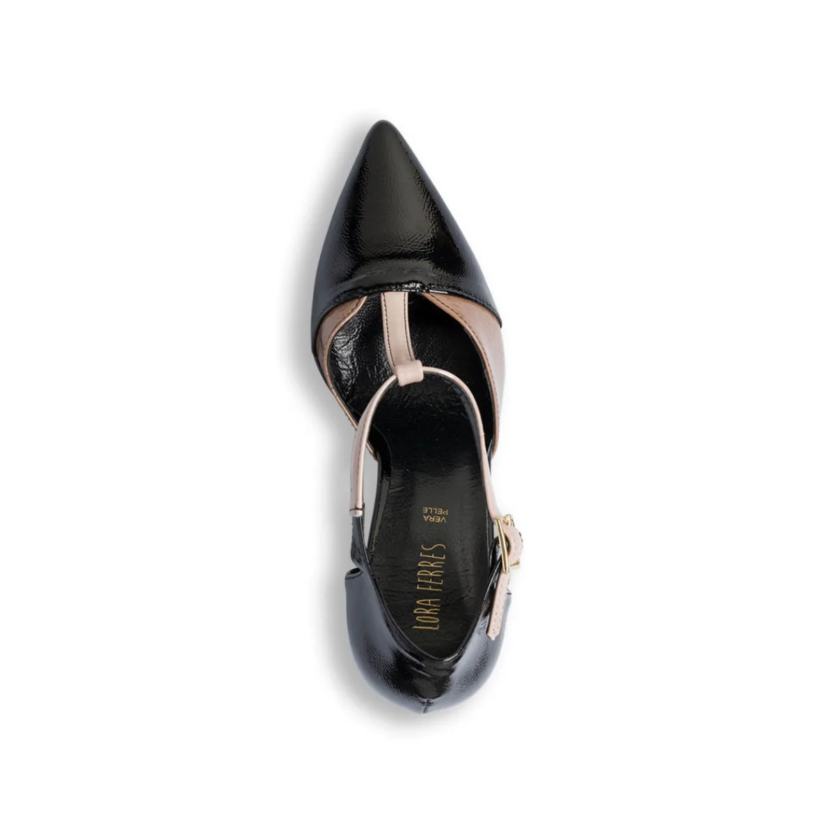 Décolleté da donna nere e beige effetto lucido Lora Ferres, con tacco alto a campana 9 cm e cinturino con fibbia. Un modello elegante e raffinato, perfetto per occasioni speciali. Realizzate in similpelle, queste décolleté sono ideali per un look femminile e sofisticato.
