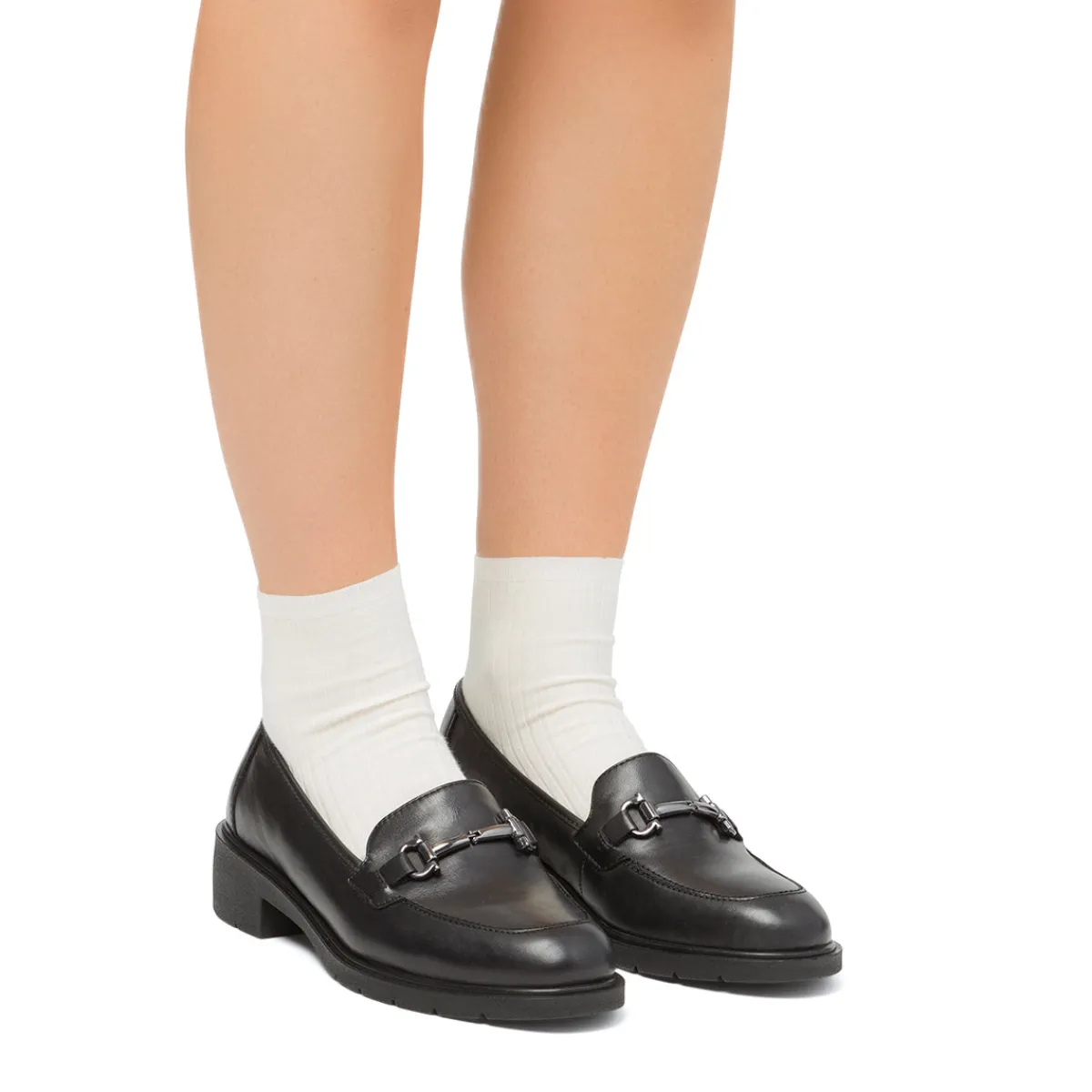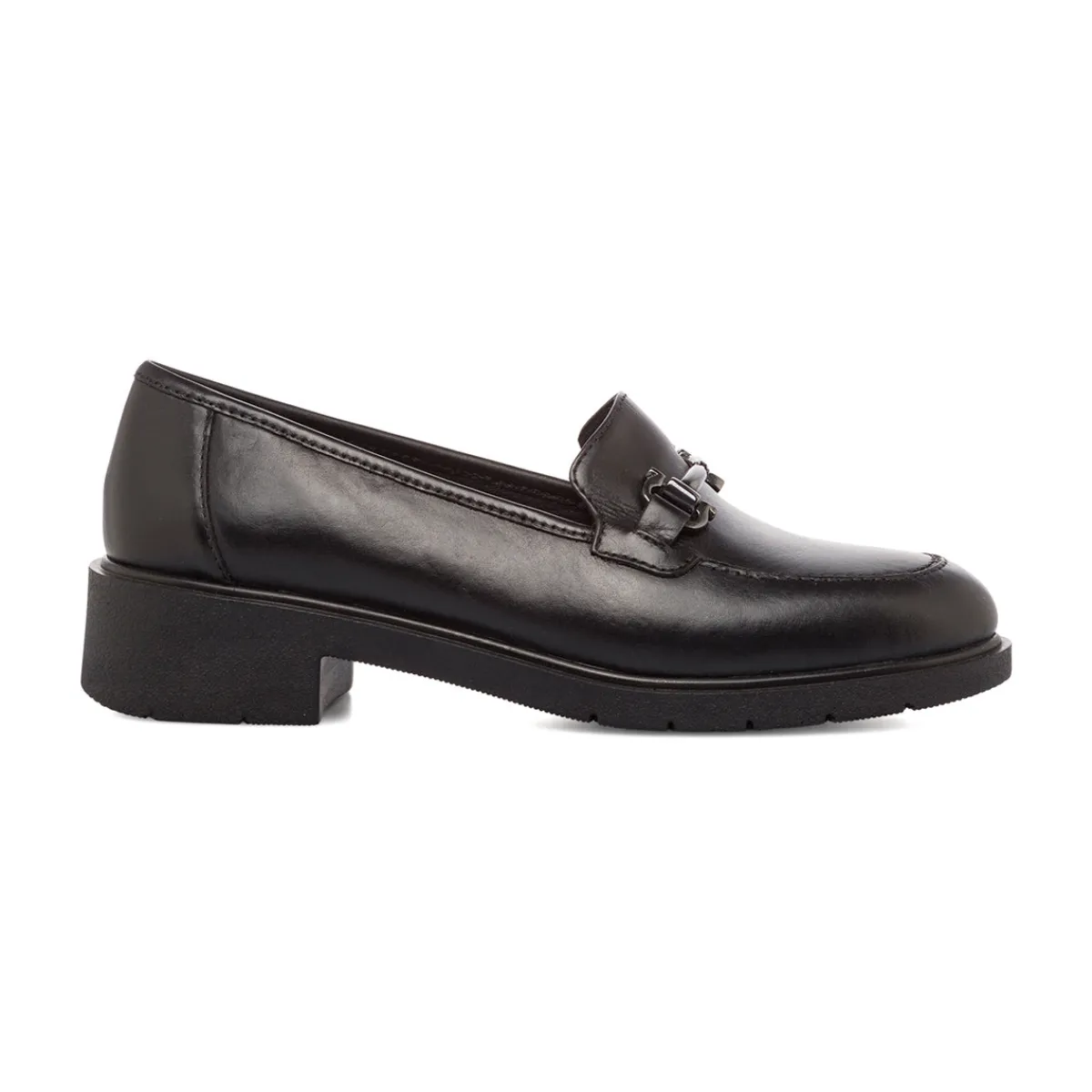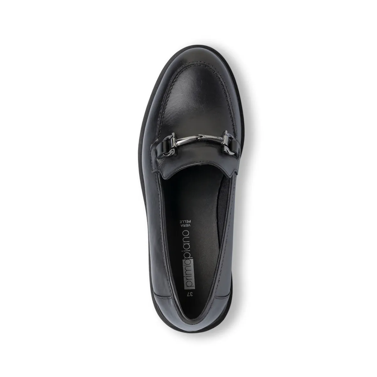 Mocassini da donna Primopiano con tomaia in pelle colore nero e morsetto in metallo.