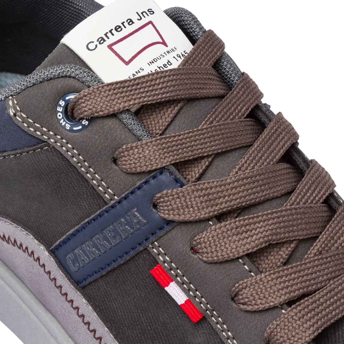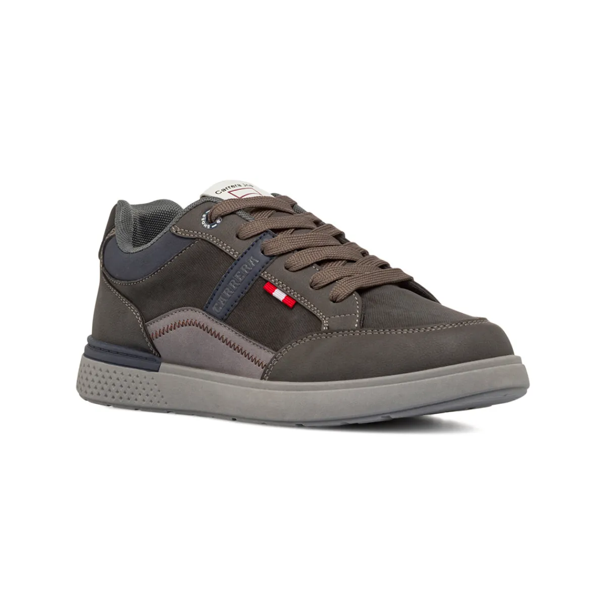 Sneakers grigio da Uomo Carrera Jns, perfette per un look casual e di tendenza. Realizzate in similpelle, queste sneakers presentano una tomaia bicolore grigio e blu navy, con dettagli in contrasto e lacci marroni. La suola in materiale sintetico garantisce comfort e aderenza. Ideali per completare il tuo outfit quotidiano con stile e praticità.