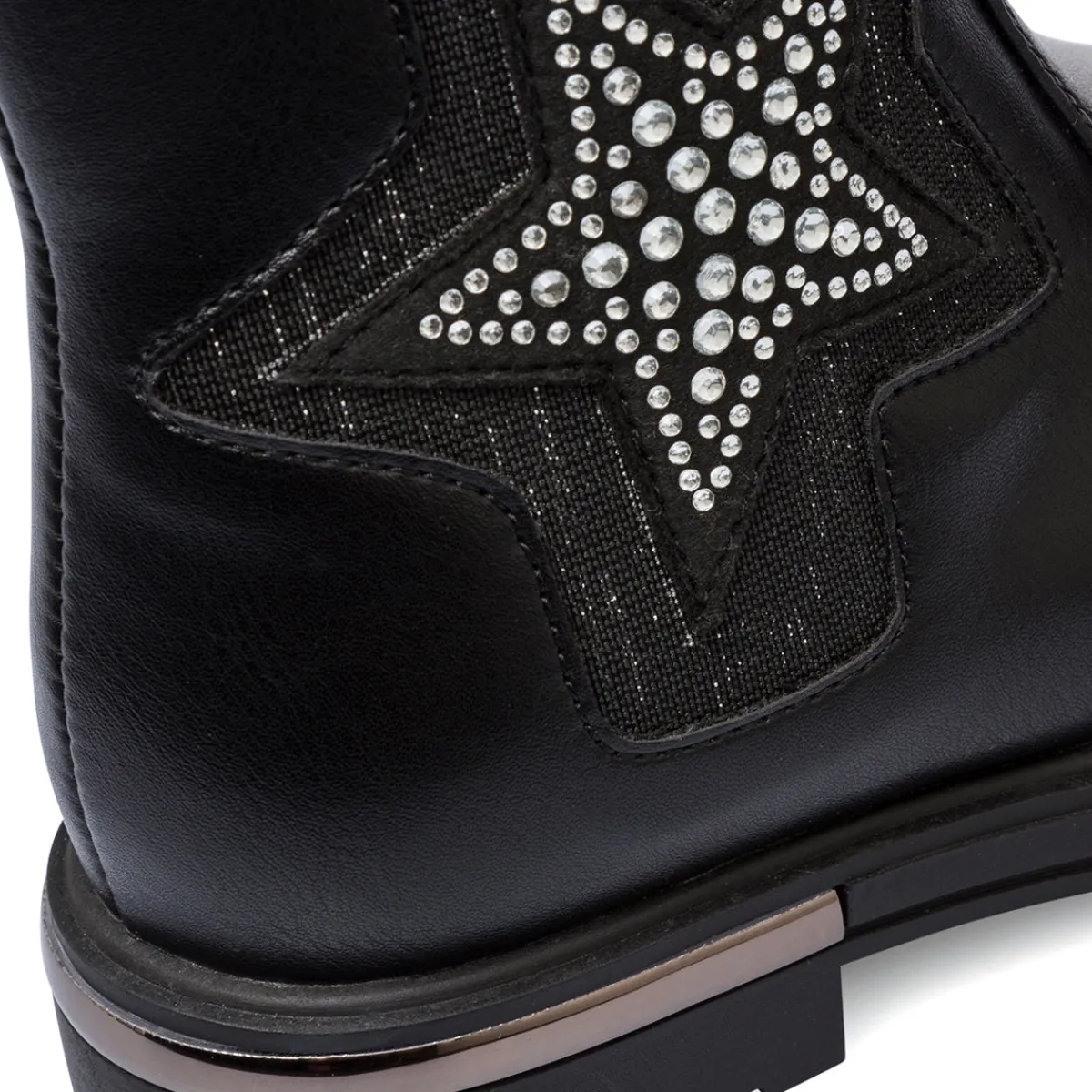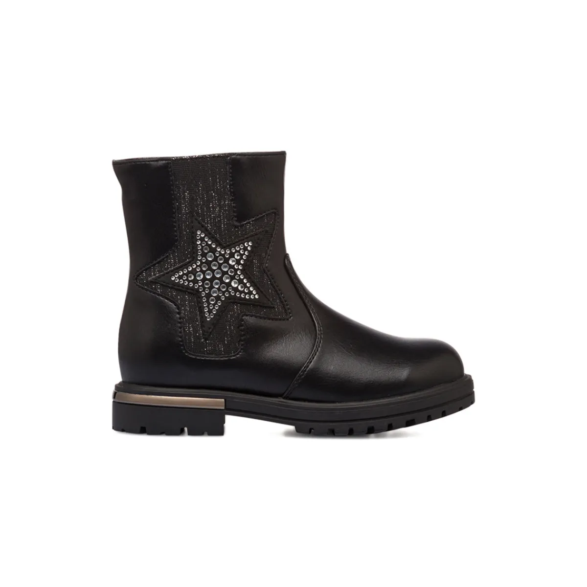 Stivaletti da bambina Le scarpe di Alice in similpelle colore nero, strass a forma di stella laterale, chiusura con zip interna e dettaglio laminato sul tallone.
