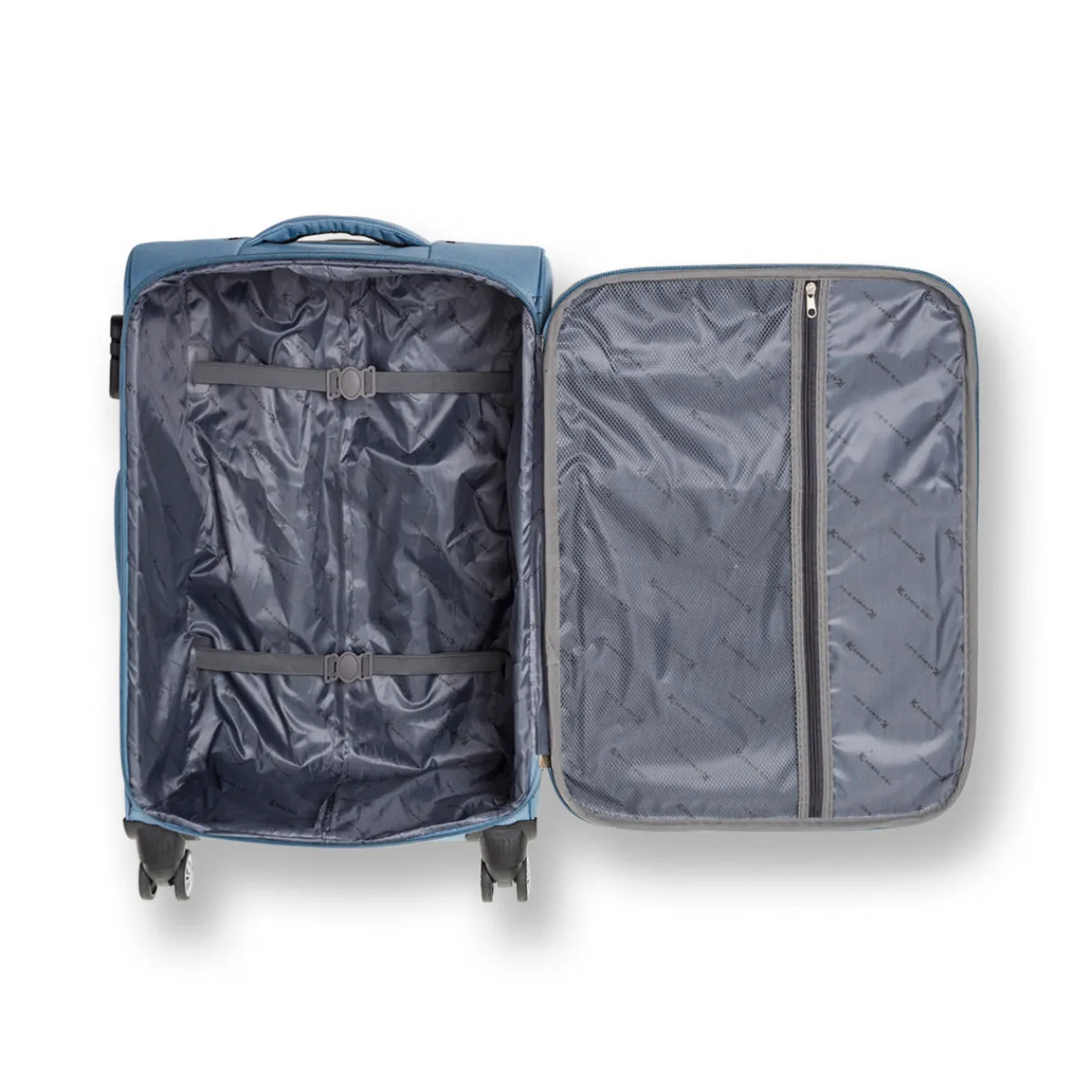 Trolley Bagaglio a mano Romeo Gigli in tessuto colore azzurro, 4 ruote multidirezionali, manico retrattile, chiusura con zip a combinazione, maniglia superiore e laterale integrata, interno foderato, tasche esterne e scomparto principale con fasce ferma abiti.