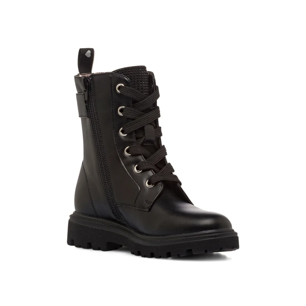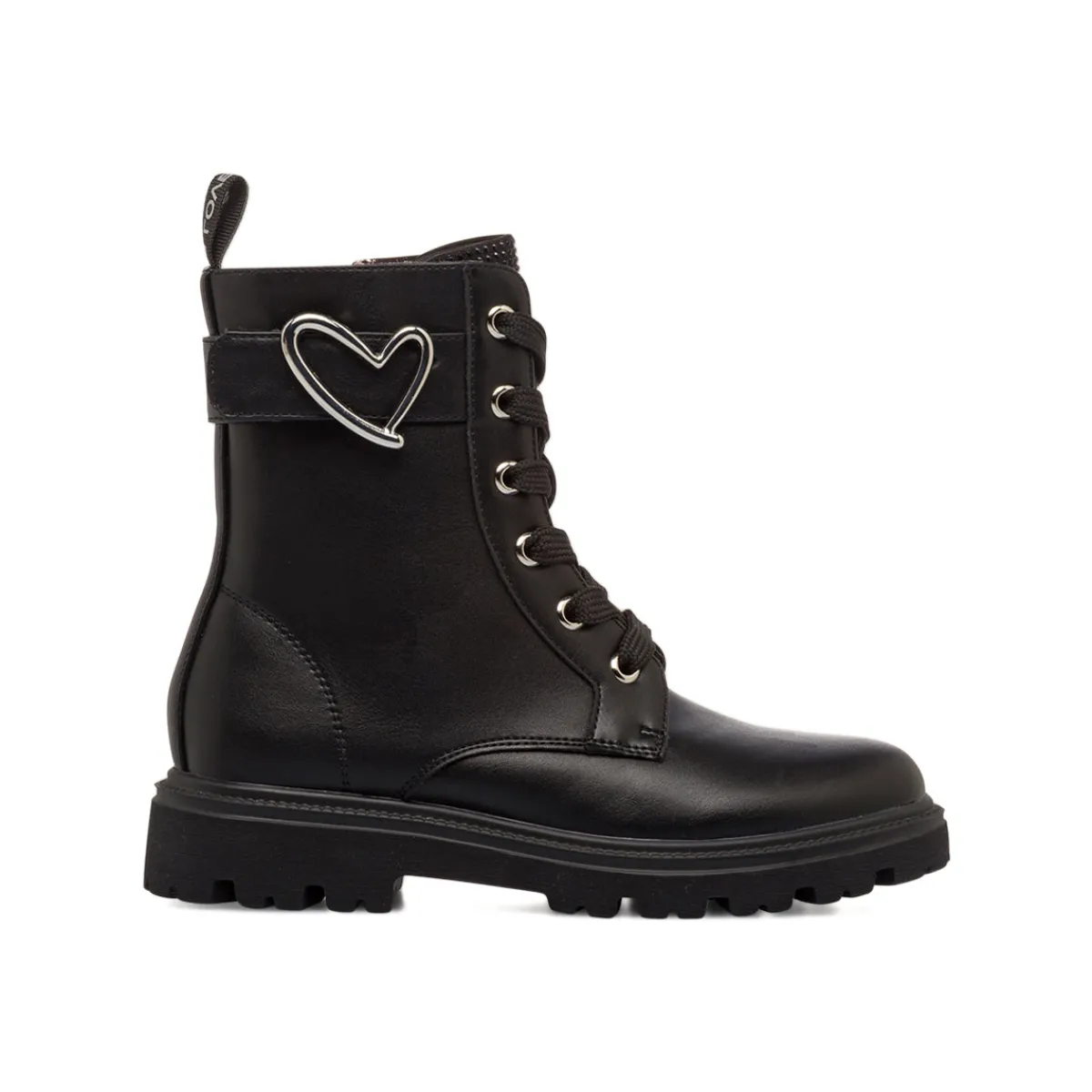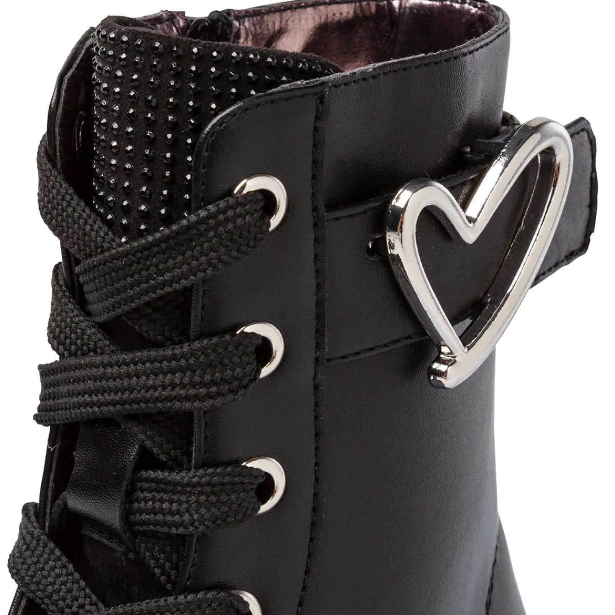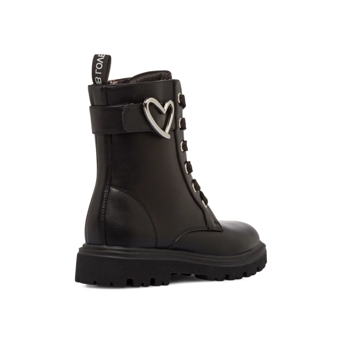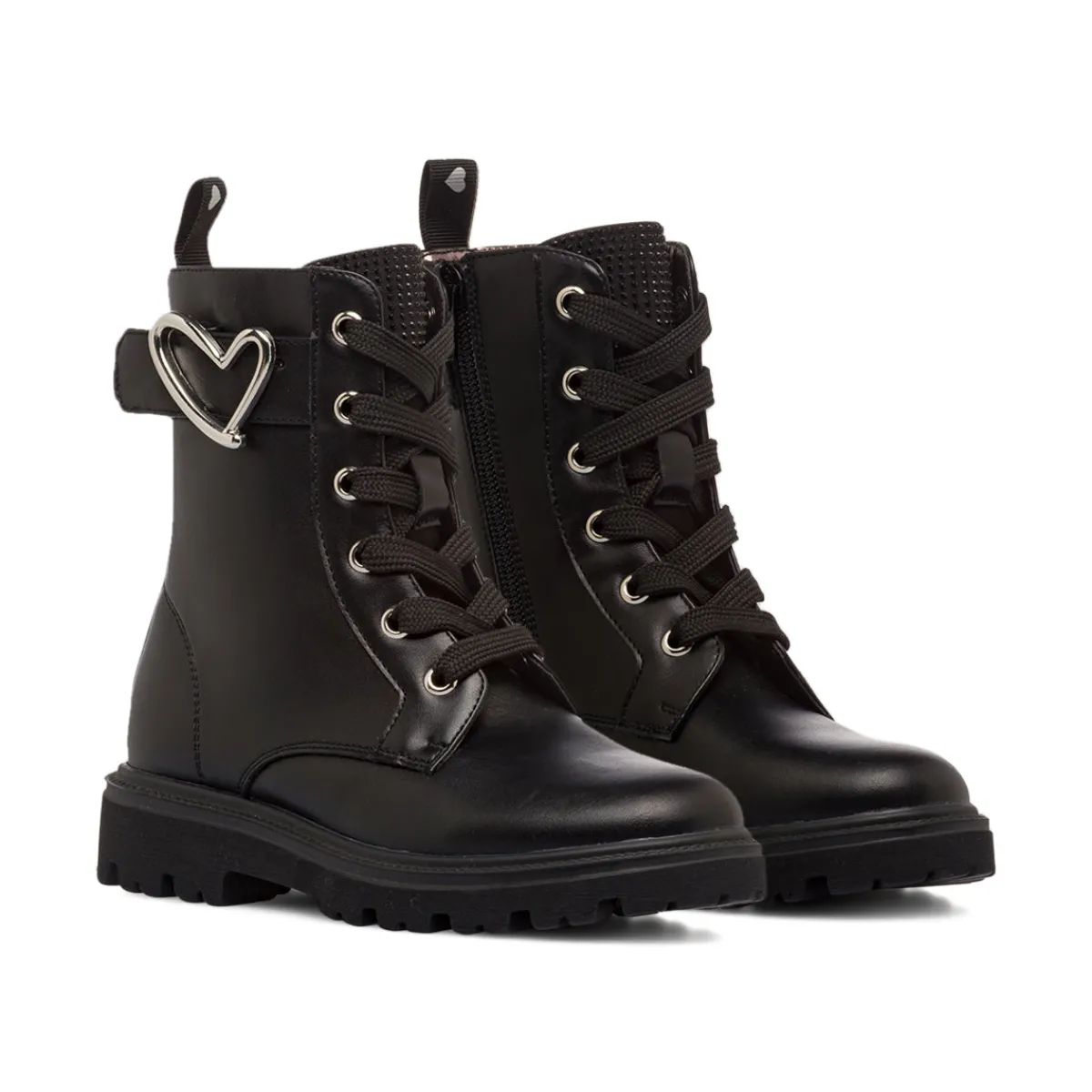 Questi anfibi firmati Laura Biagiotti neri da ragazza sono perfetti per aggiungere un tocco di stile al look di tutti i giorni. Realizzati in similpelle, presentano una chiusura con lacci e una fibbia a forma di cuore, dettaglio che li rende unici e irresistibili. La suola robusta garantisce comfort e stabilità ad ogni passo. La linguetta presenta un tocco chic grazie agli strass. Ideali per la scuola, il tempo libero o le occasioni speciali, questi stivaletti sono un must-have per la stagione.