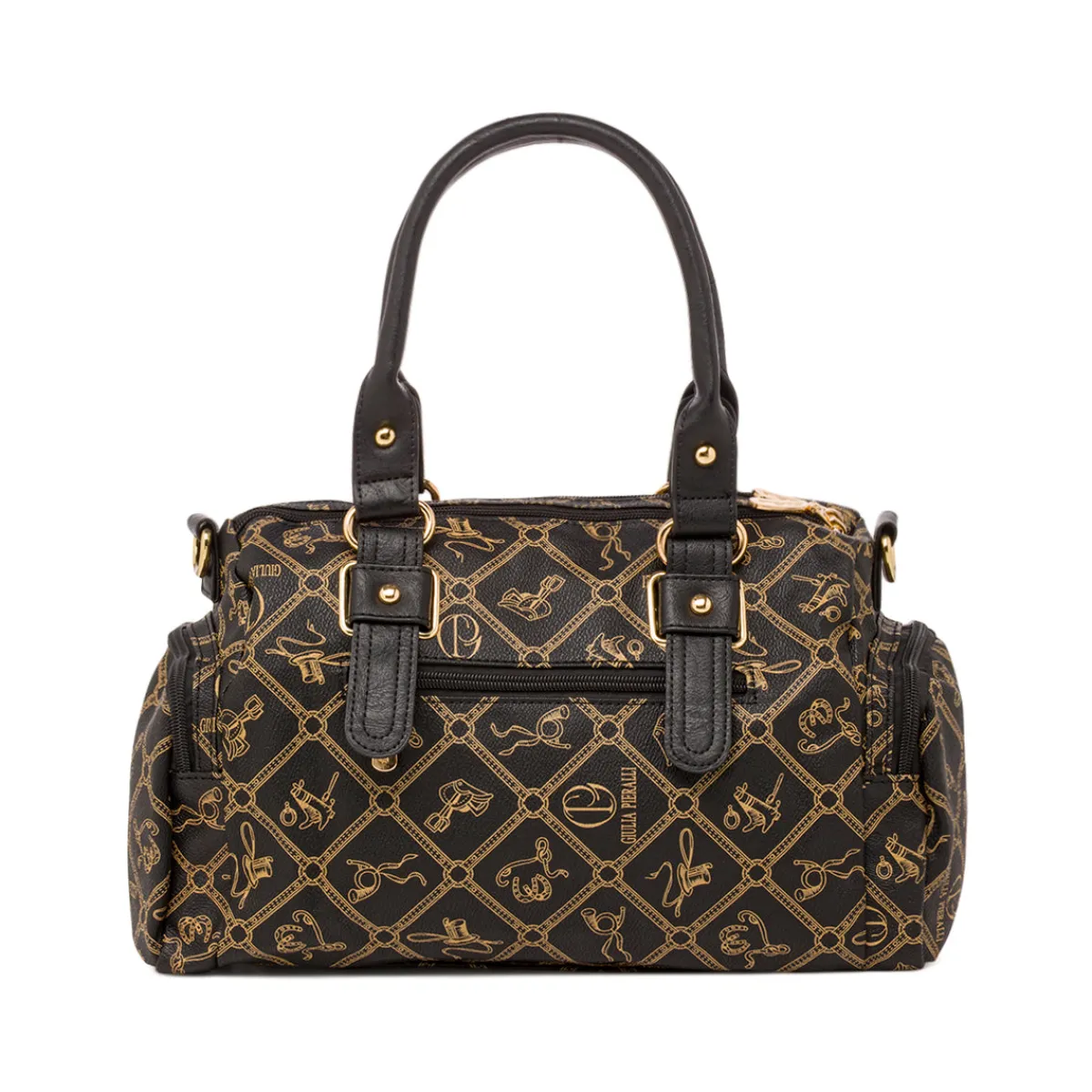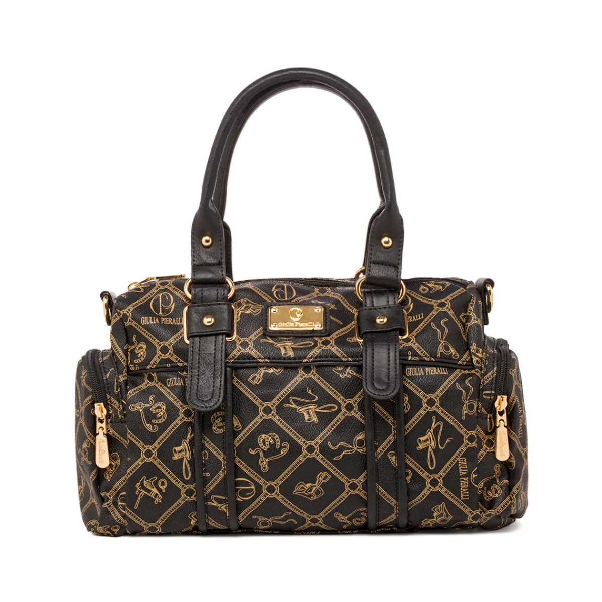 Elegante borsa a mano nera da donna di Giulia Pieralli, caratterizzata da una raffinata stampa con logo dorato. Perfetta per il giorno e la sera, questa borsa presenta dettagli in pelle nera e chiusure con zip. Un accessorio versatile e di stile, ideale per completare i tuoi look più chic.