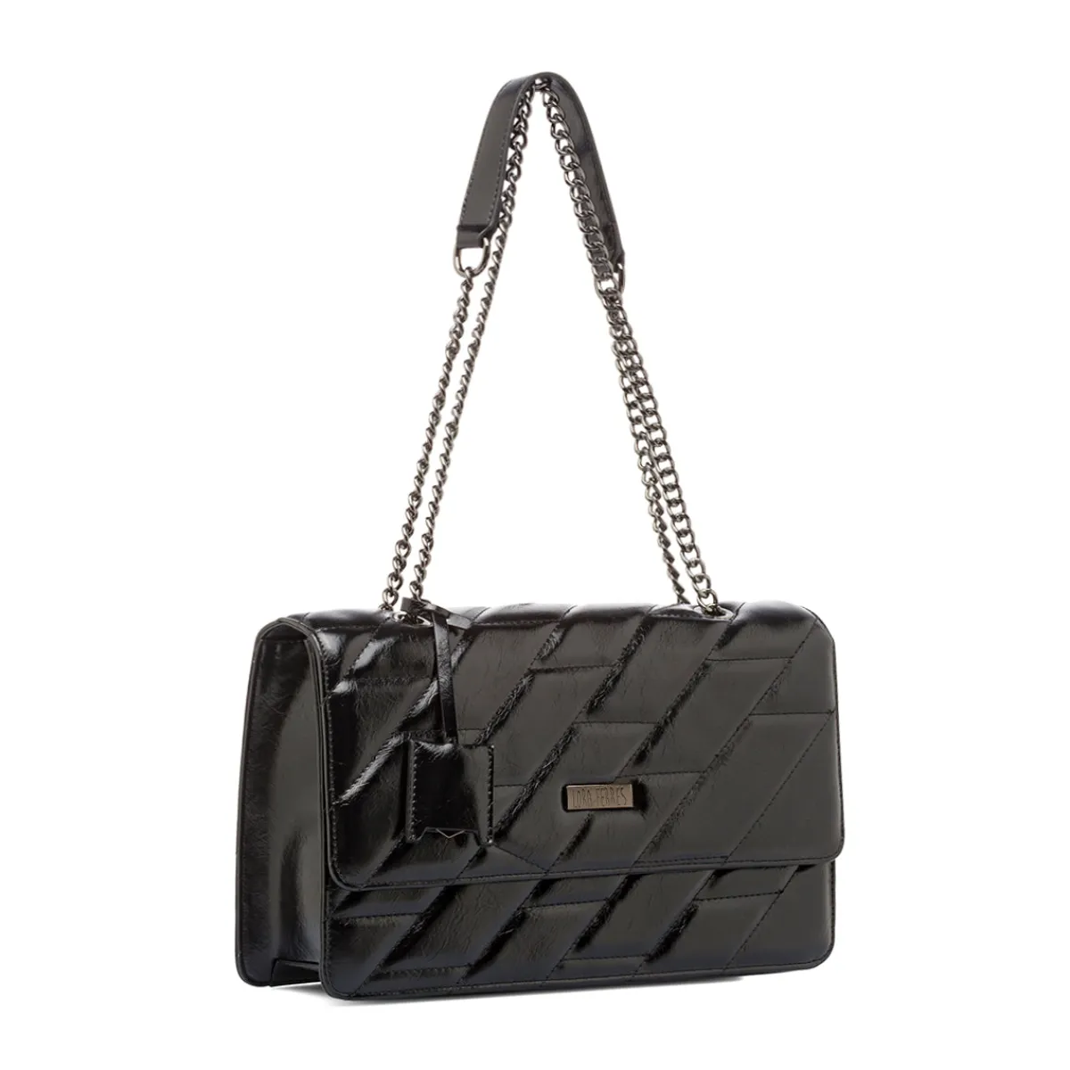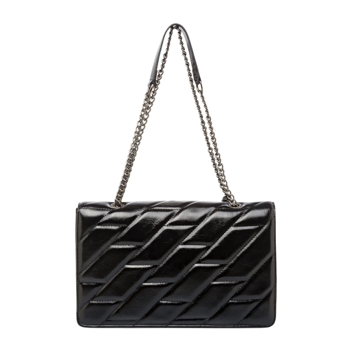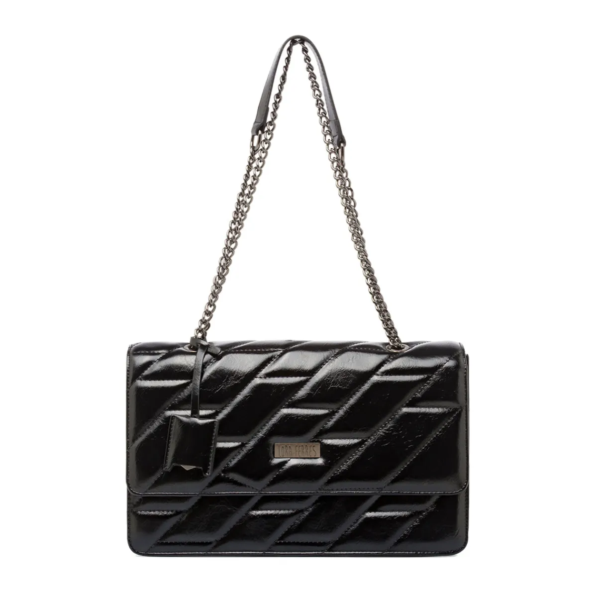 Elegante borsa a spalla nera da donna firmata Lora Ferres. La sua raffinata trama a rombi, la chiusura con patta e il dettaglio del logo metallico la rendono un accessorio perfetto per completare il tuo outfit. La tracolla a catena aggiunge un tocco di glamour e praticità, mentre le dimensioni compatte la rendono ideale per il giorno e la sera. Un must-have per una donna sempre alla moda.
