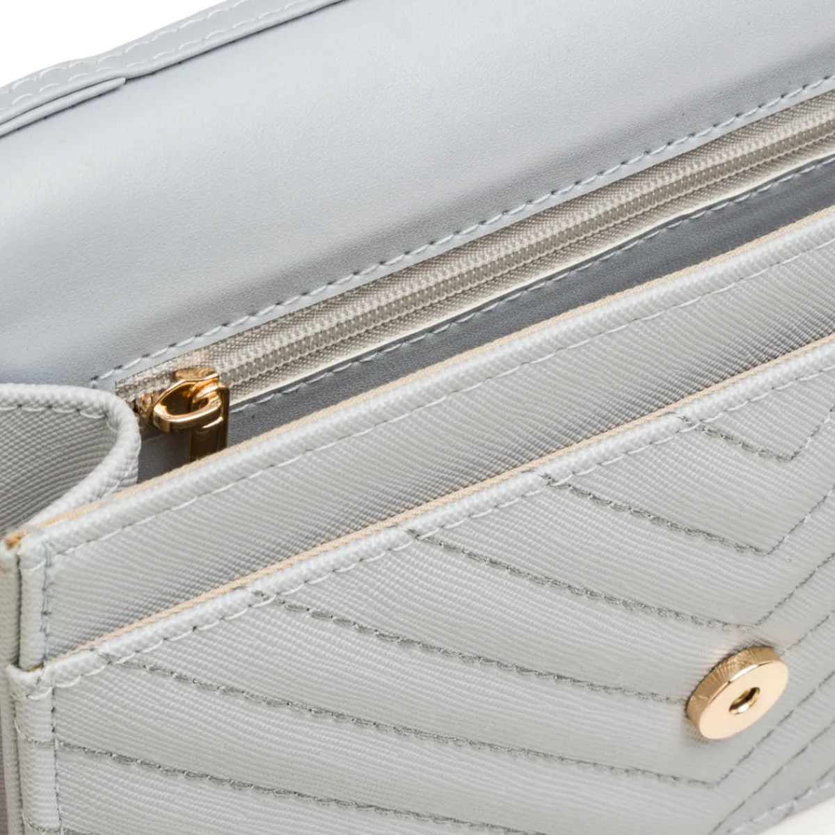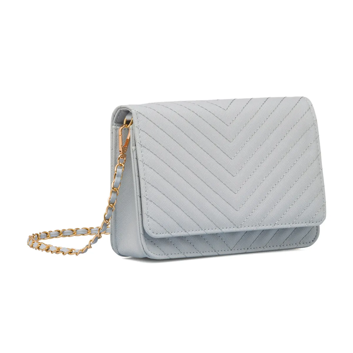 Elegante borsa a tracolla azzurra da donna firmata Lora Ferres. Il suo raffinato design presenta un esclusivo motivo a Chevron impreziosito da cuciture a punto sella. Realizzata in materiale sintetico di qualità, è dotata di una tracolla a catena dorata e di una chiusura a bottone. Perfetta per completare il tuo look quotidiano con un tocco di stile.