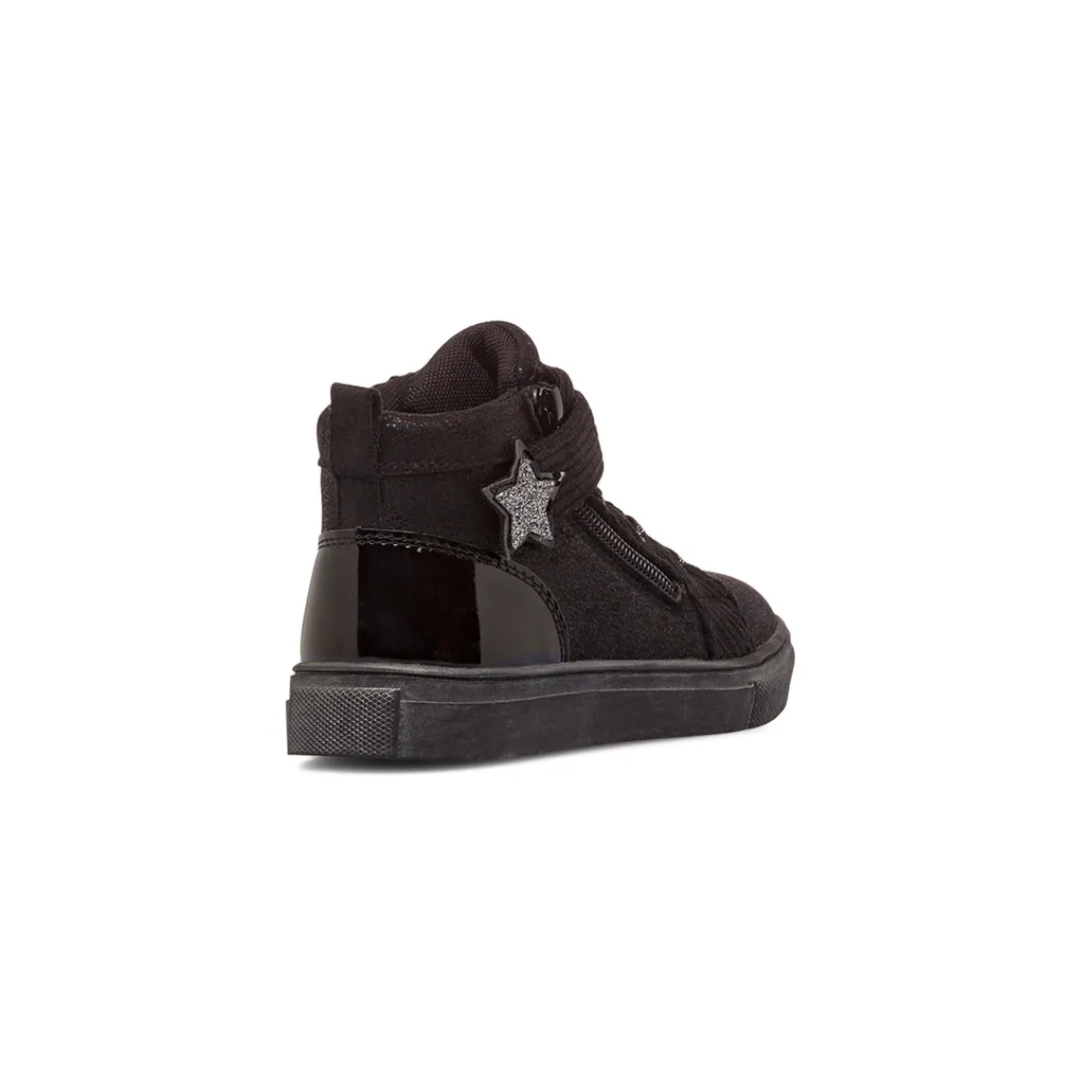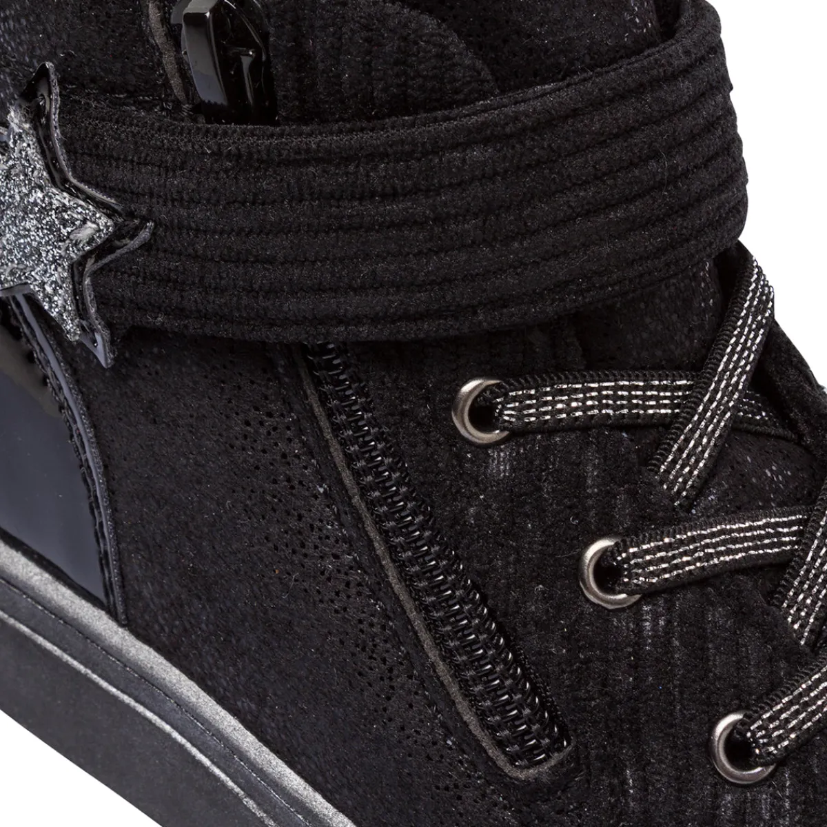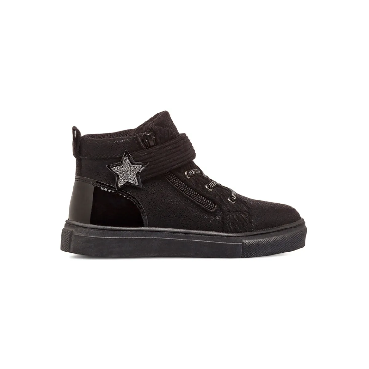 Queste sneakers alte nere da ragazza del brand Le Scarpe di Alice sono perfette per un look casual e trendy. Realizzate con tomaia in tessuto con dettagli glitter e inserti effetto velluto, presentano una chiusura con zip laterale, lacci elastici e cinturino con stella glitterata. La suola in gomma garantisce comfort e aderenza. Ideali per la scuola, il tempo libero o le occasioni speciali. Un tocco di brillantezza per le più giovani fashioniste!