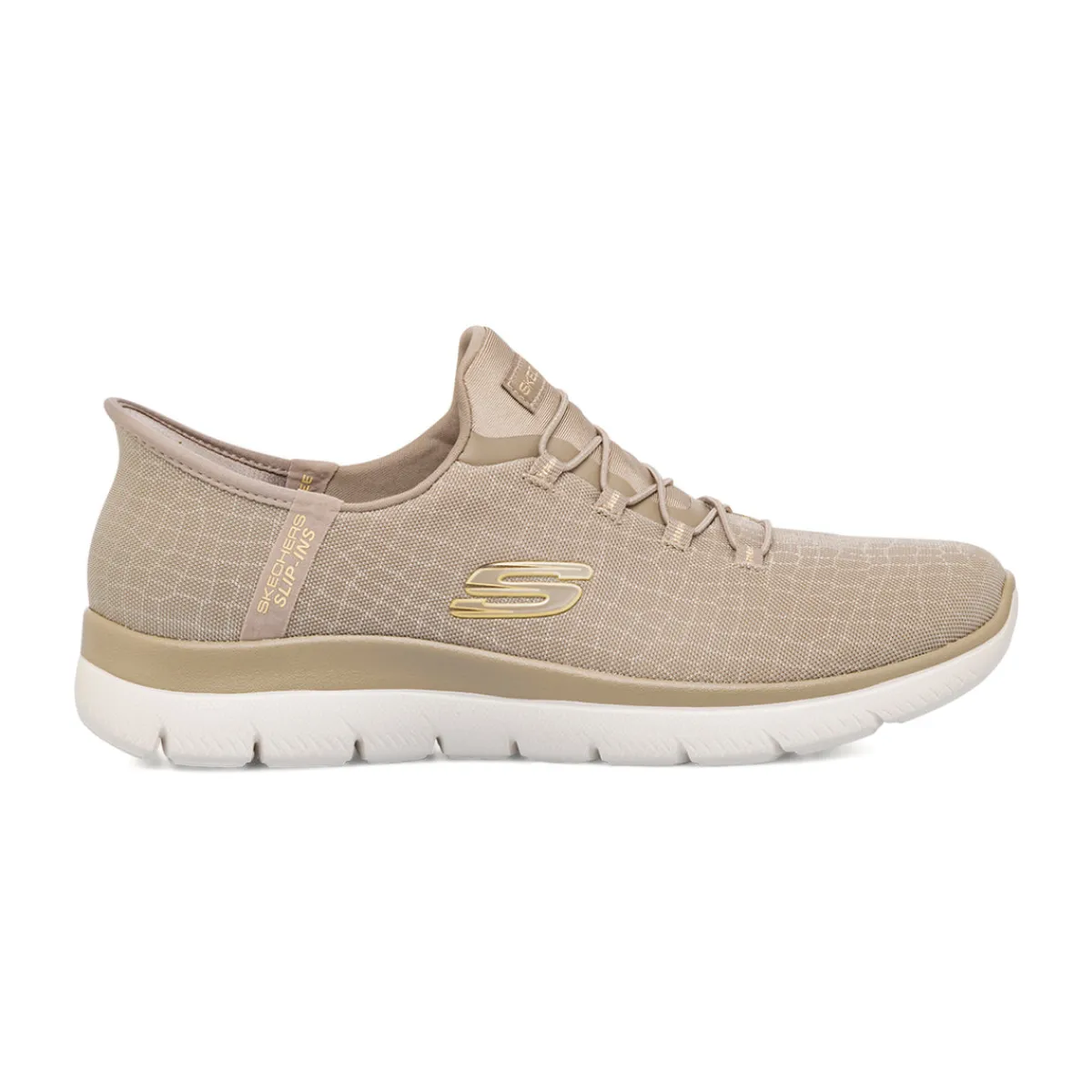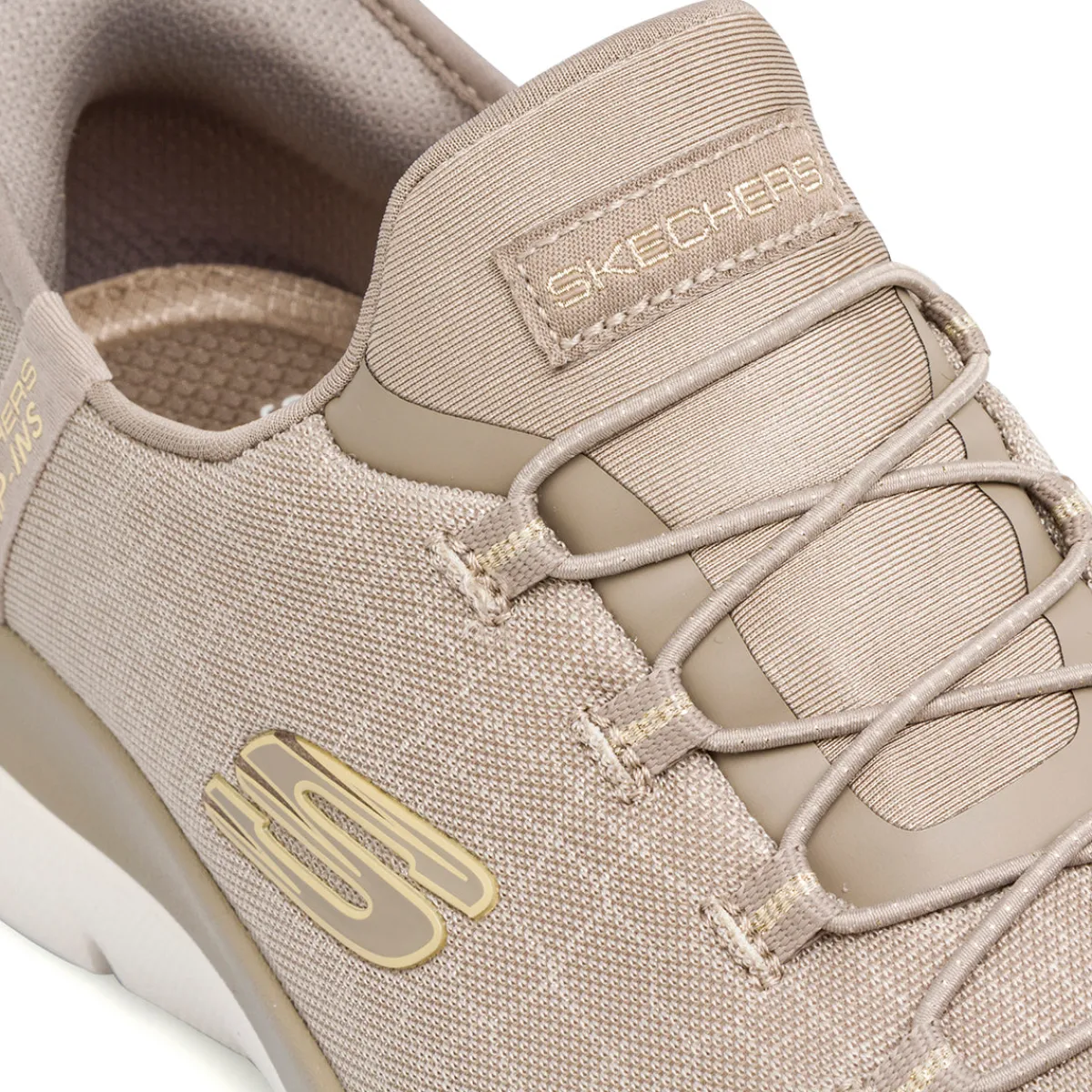 Sneakers slip-on da donna Skechers Summits in tessuto color taupe con inserti oro, lacci elastici e logo. Dotate di soletta con tecnologia memory foam.