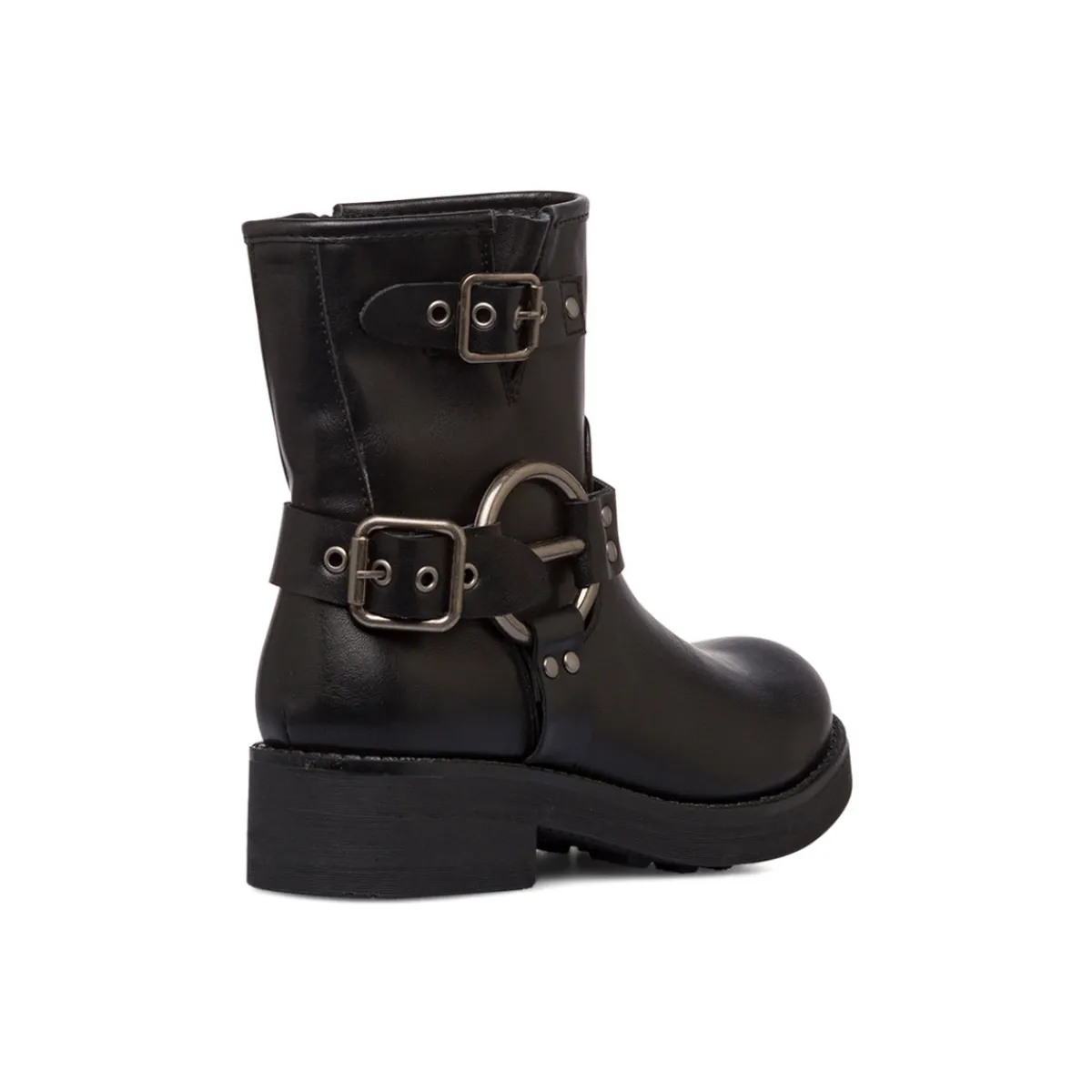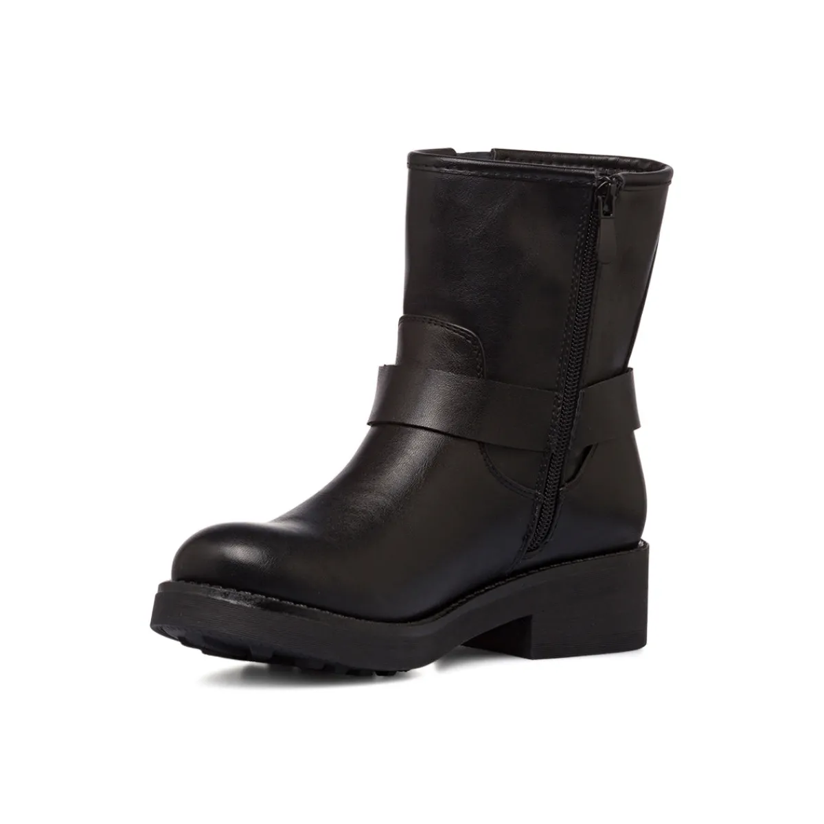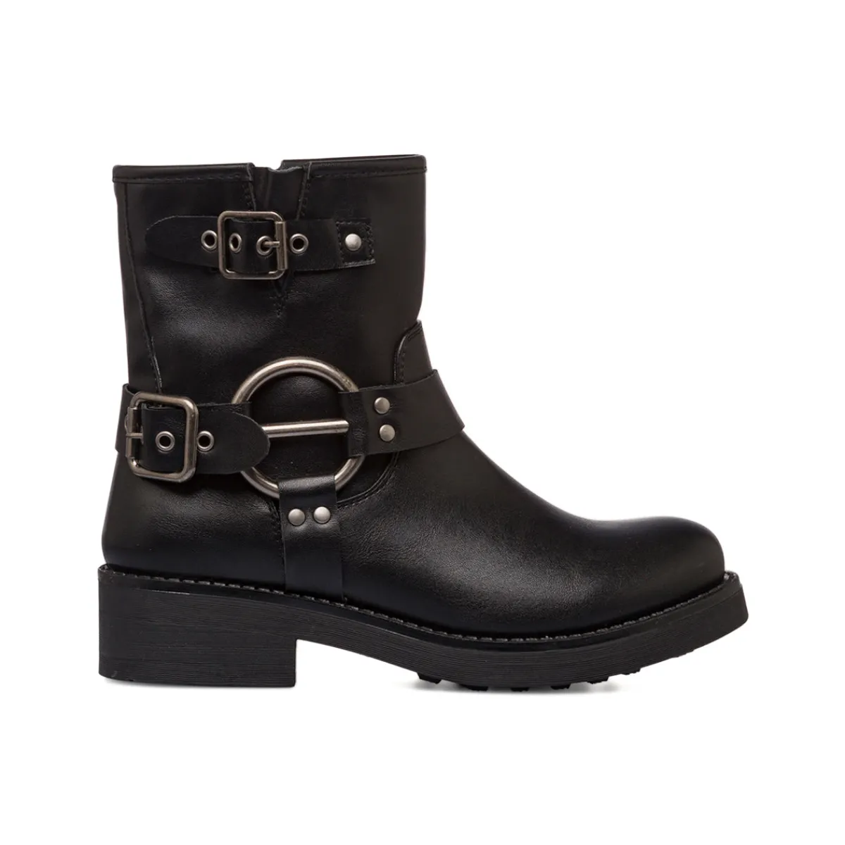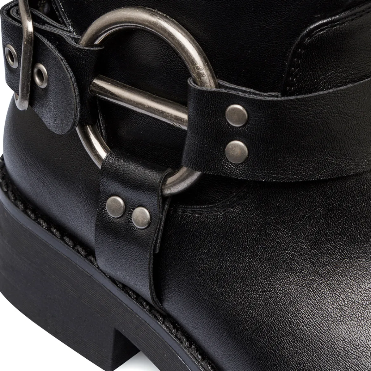 Stivaletti biker da donna neri Lora Ferres con fibbie e chiusura con zip laterale. La tomaia è in similpelle, il rivestimento è in materiale tessile e altro materiale e la suola è in gomma. Il modello è caratterizzato da una fibbia con anello metallico