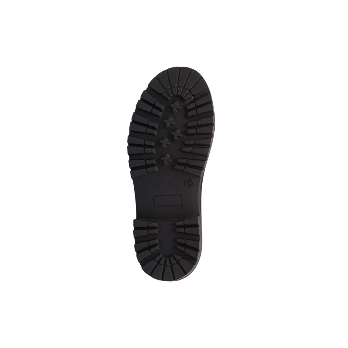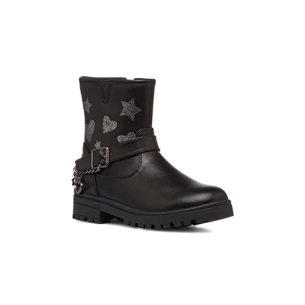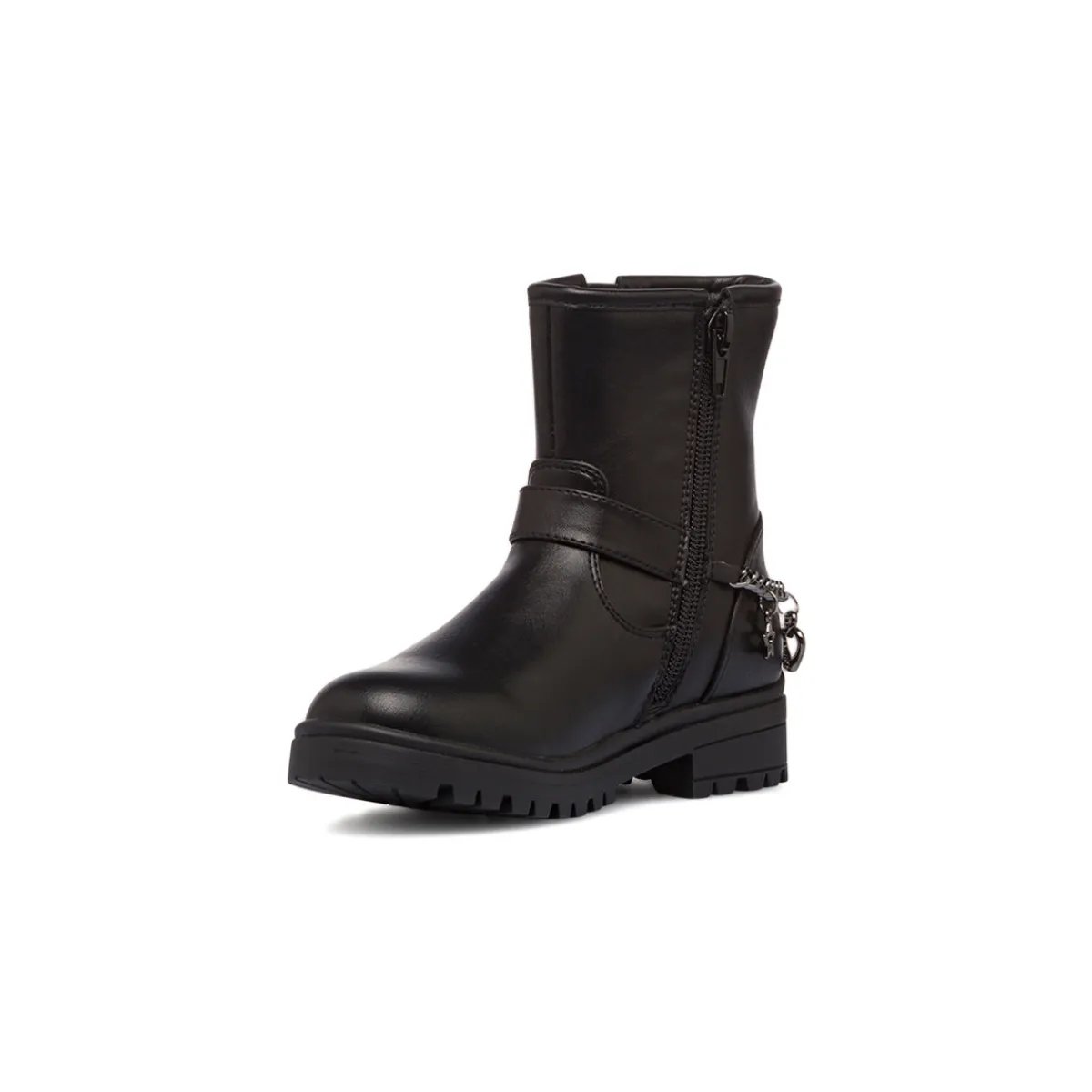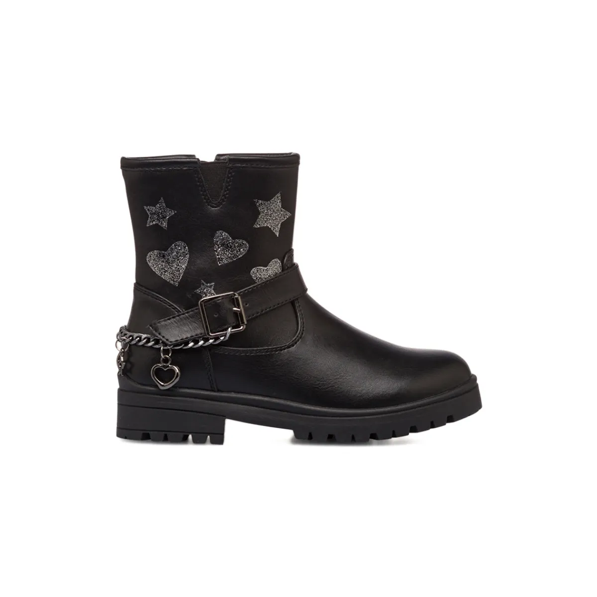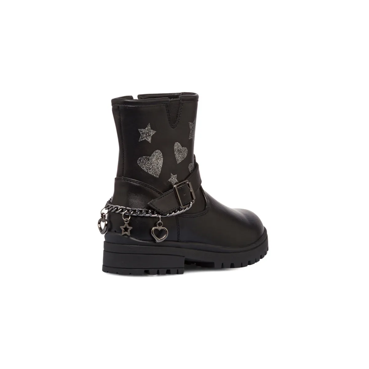 Stivaletti da bambina Le scarpe di Alice in similpelle colore nero, dettaglio glitter, zip laterale e cinturino con catena e fibbia alla caviglia.