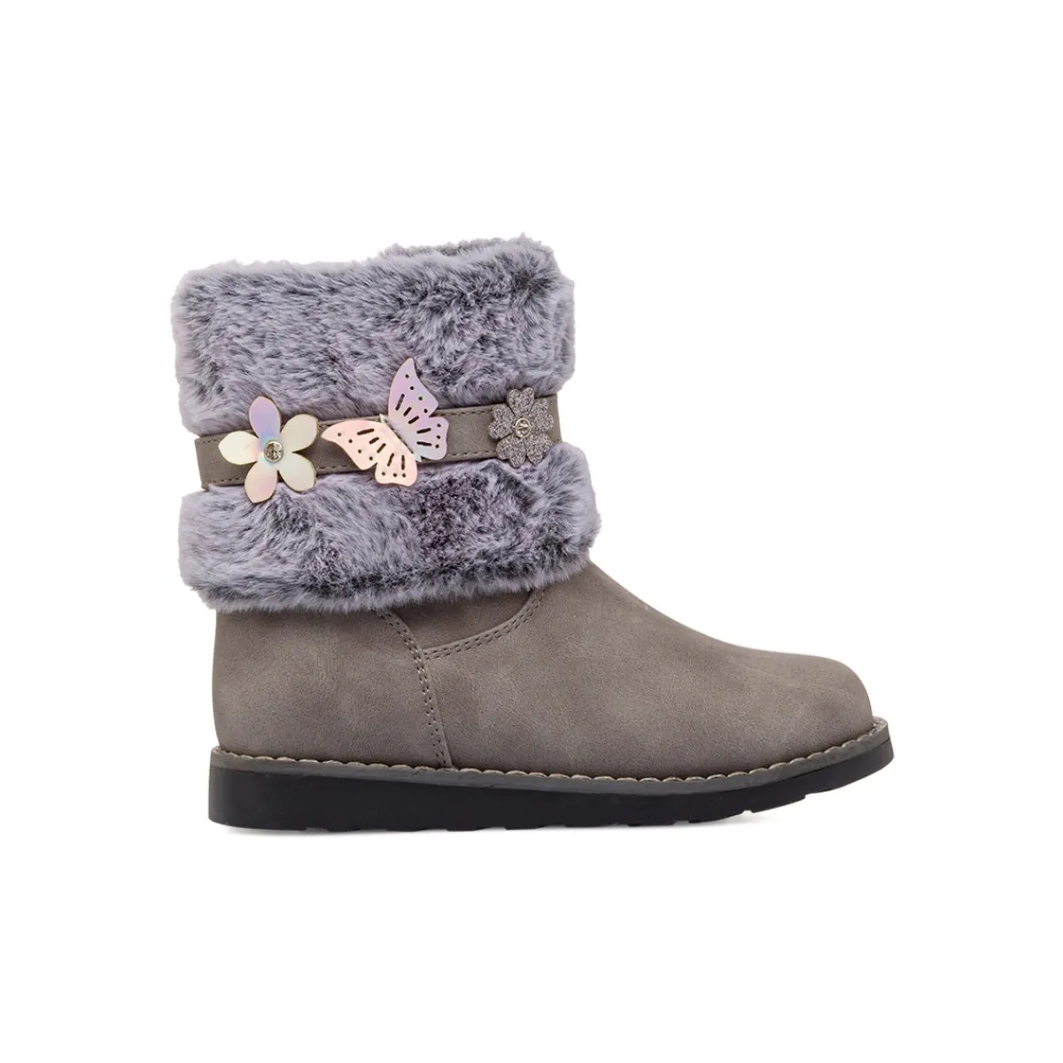 Questi stivaletti grigi da bambina del marchio Le scarpe di Alice sono perfetti per l’inverno. Realizzati con tomaia in similpelle effetto scamosciato, sono impreziositi da un morbido pelo sintetico sul bordo superiore e da dettagli floreali e farfalle, che aggiungono un tocco di magia. La soletta interna è in materiale sintetico per un comfort ottimale. La suola in materiale sintetico assicura una buona aderenza. Ideali per le giornate più fredde, questi stivaletti combinano stile e praticità per le tue piccole.