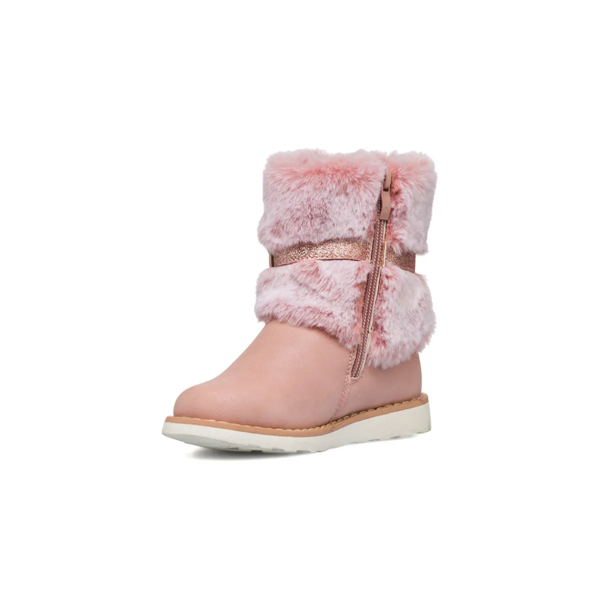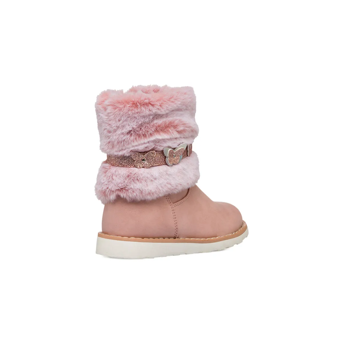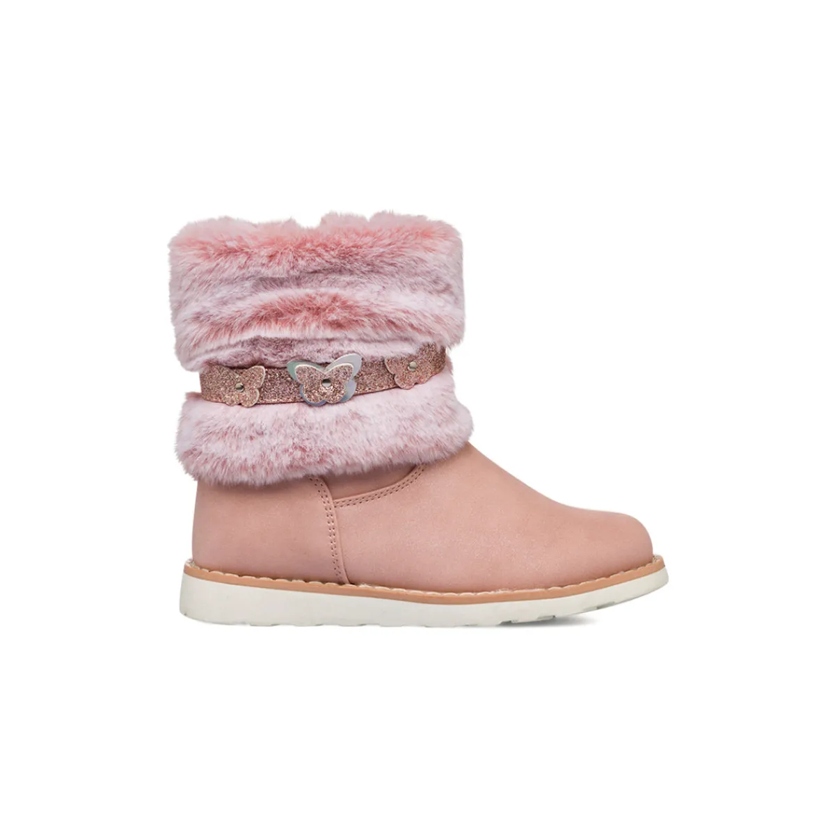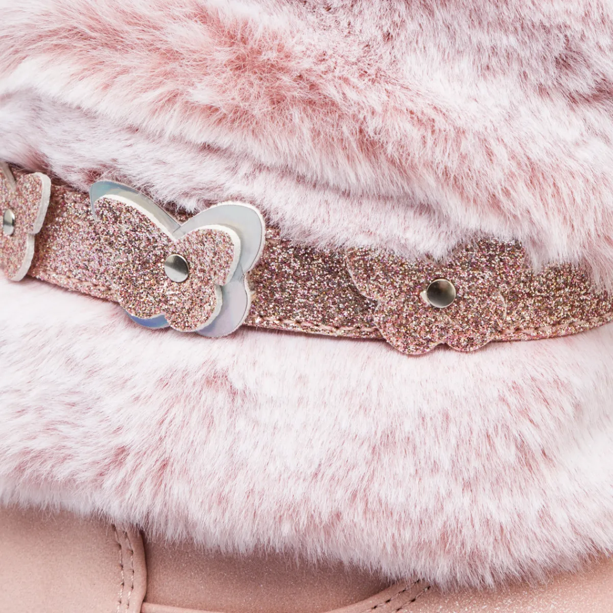 Stivaletti da bambina Le Scarpe di Alice in similpelle rosa con colletto imbottito in finta pelliccia, zip laterale e cinturino glitter con applicazioni di farfalle