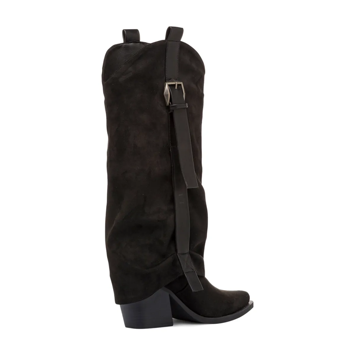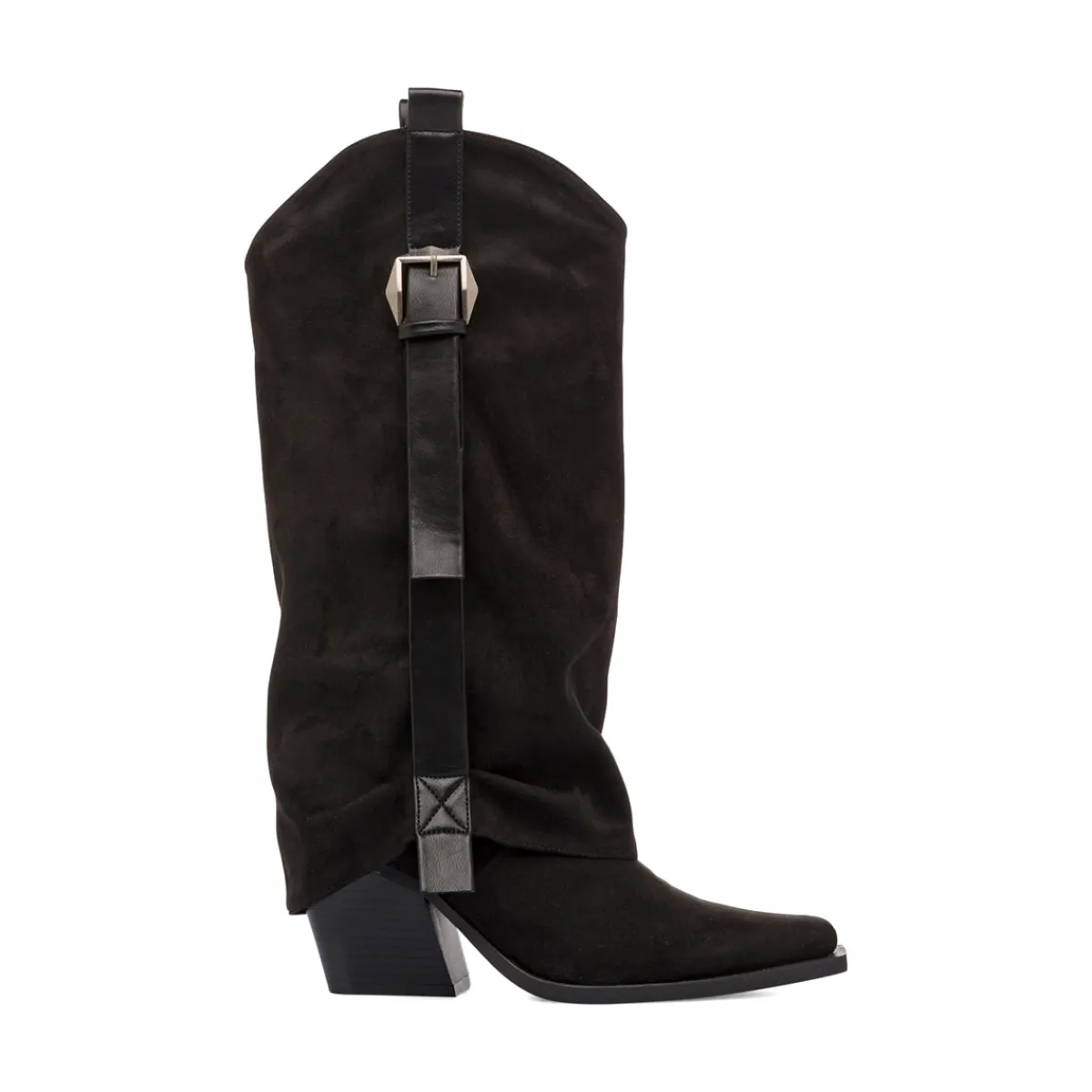 Aggiungi un tocco western al tuo stile con questi stivali texani neri da donna di Lora Ferres. Realizzati in similpelle effetto scamosciato, presentano una fibbia decorativa e un comodo tacco basso. Perfetti per completare i tuoi look casual o per un tocco di originalità. La soletta è in materiale sintetico, garantendo comfort durante tutta la giornata. Ideali per un look grintoso e di tendenza.