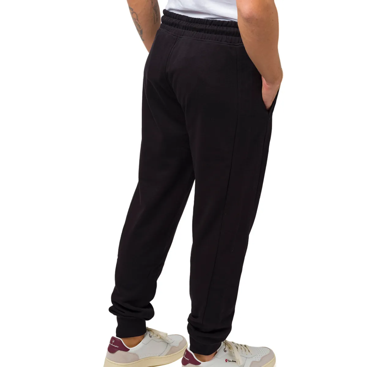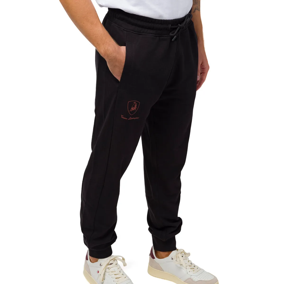 Pantaloni da jogging da uomo Tonino Lamborghini in cotone e poliestere colore nero, logo, tasche esterne e fascia in vita regolabile con lacci.