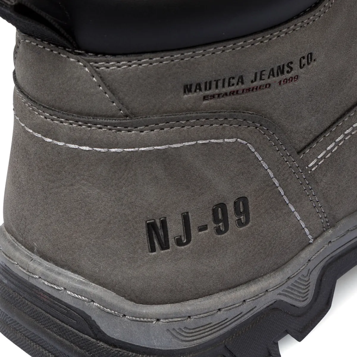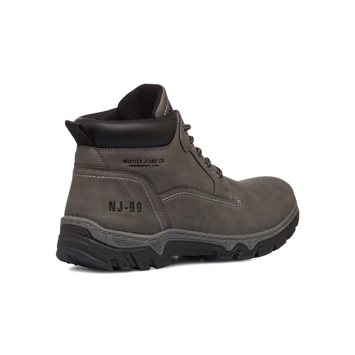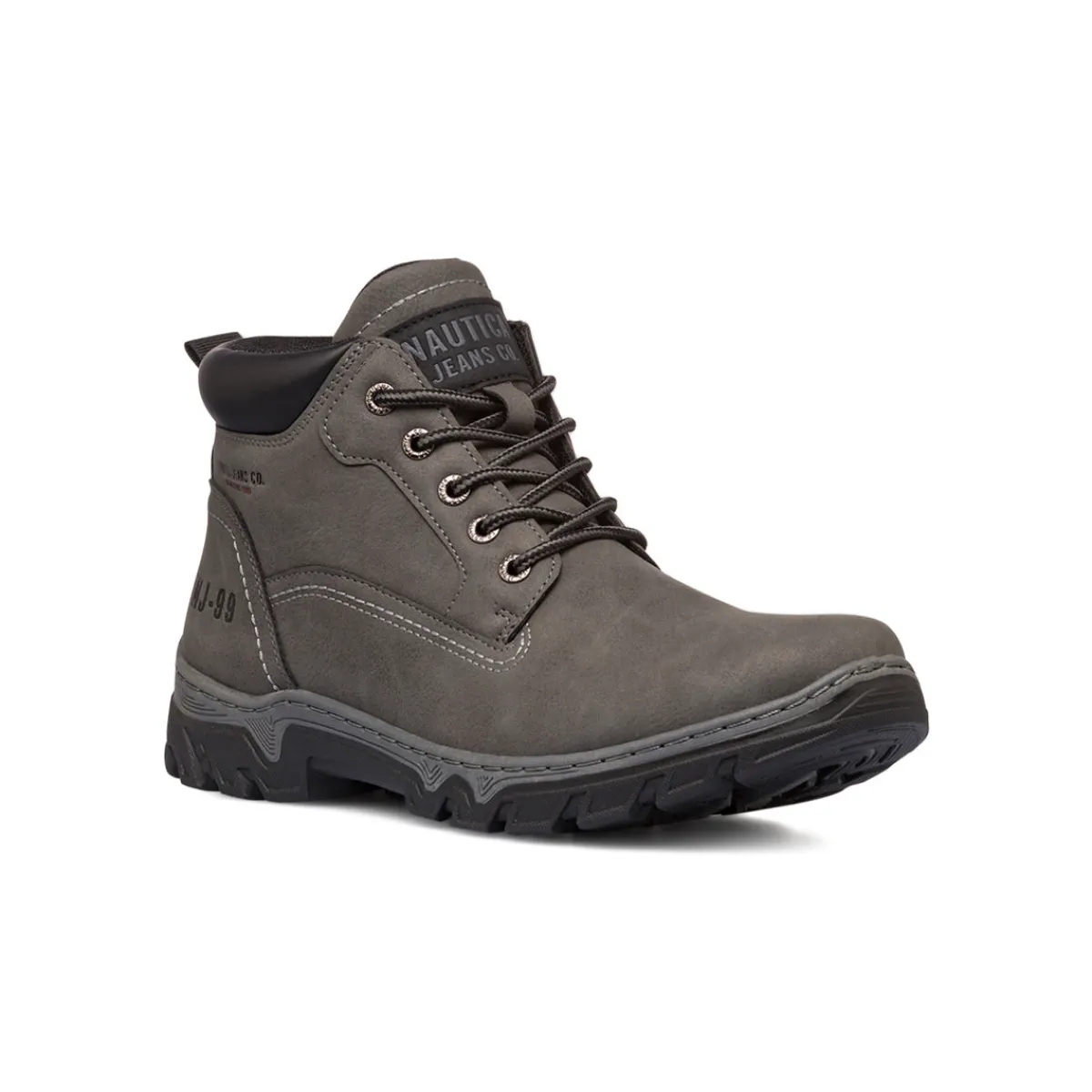 Scarponcini da uomo Nautica Jeans in similpelle grigio con colletto imbottito nero, tirante sul retro, lacci bicolore, occhielli in metallo, cuciture a contrasto e etichetta logo sulla linguetta.