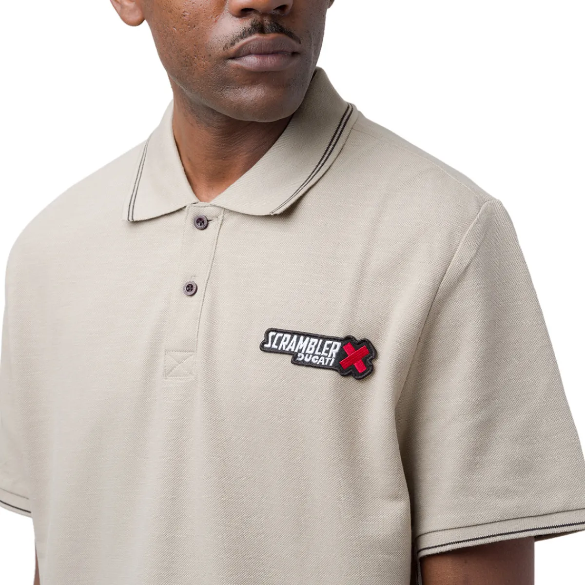 Polo da Uomo firmata Ducati Scrambler, in cotone colore beige, con dettagli neri e grigi sul colletto e logo sul petto.