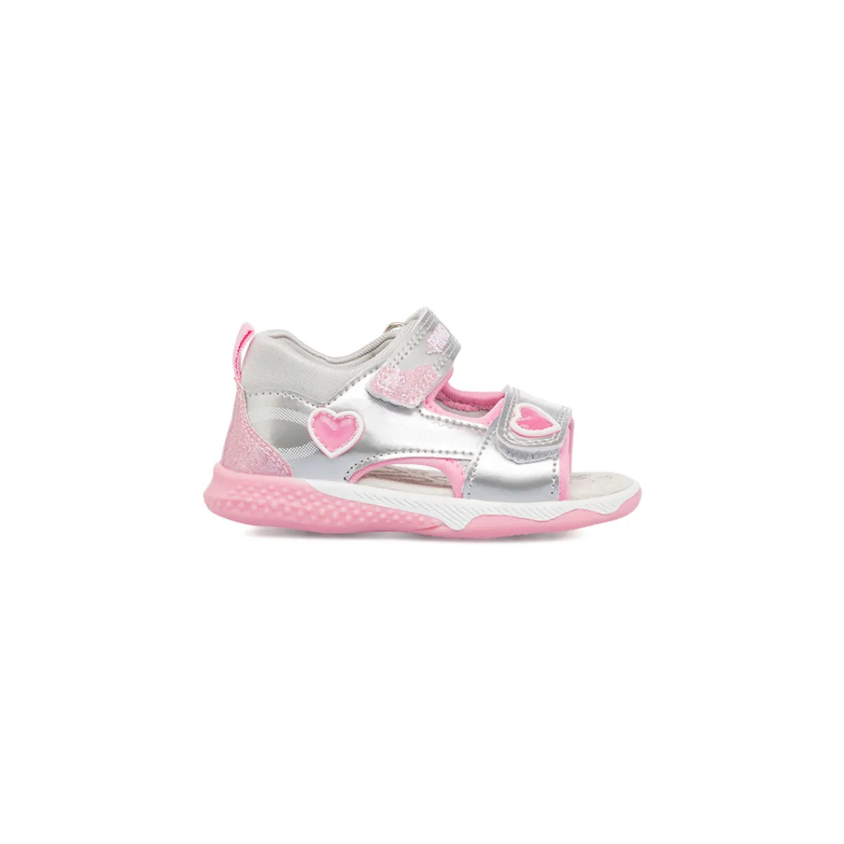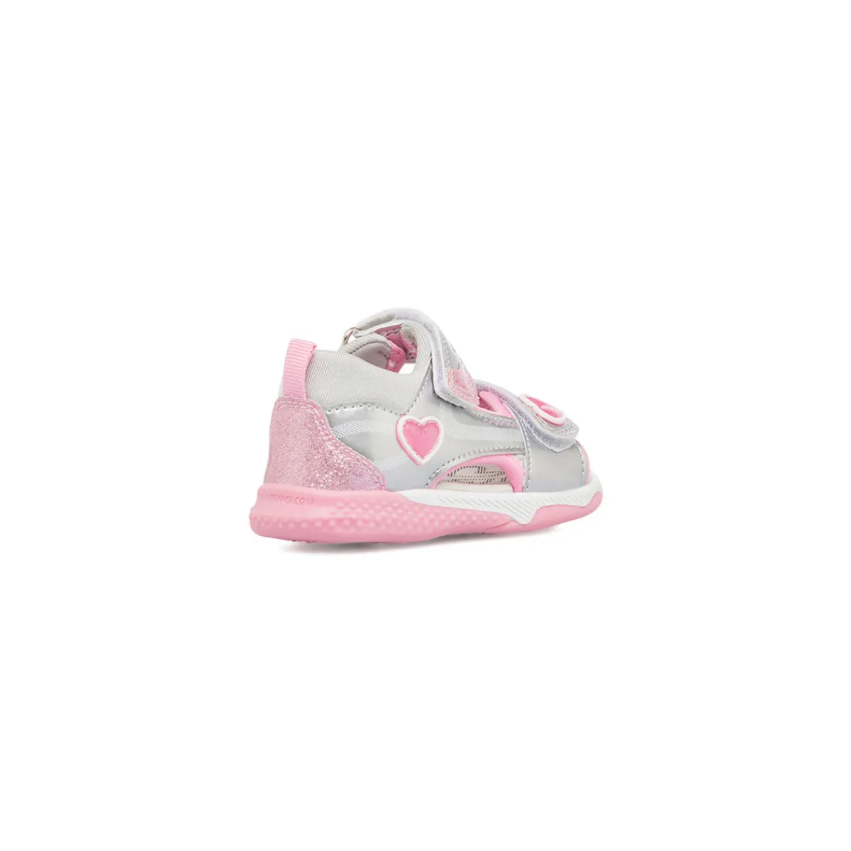 Sandali bambina primi passi Primigi Baby Active con sottopiede in pelle, colore argento e dettagli rosa, doppia regolazione in velcro e tallone chiuso.