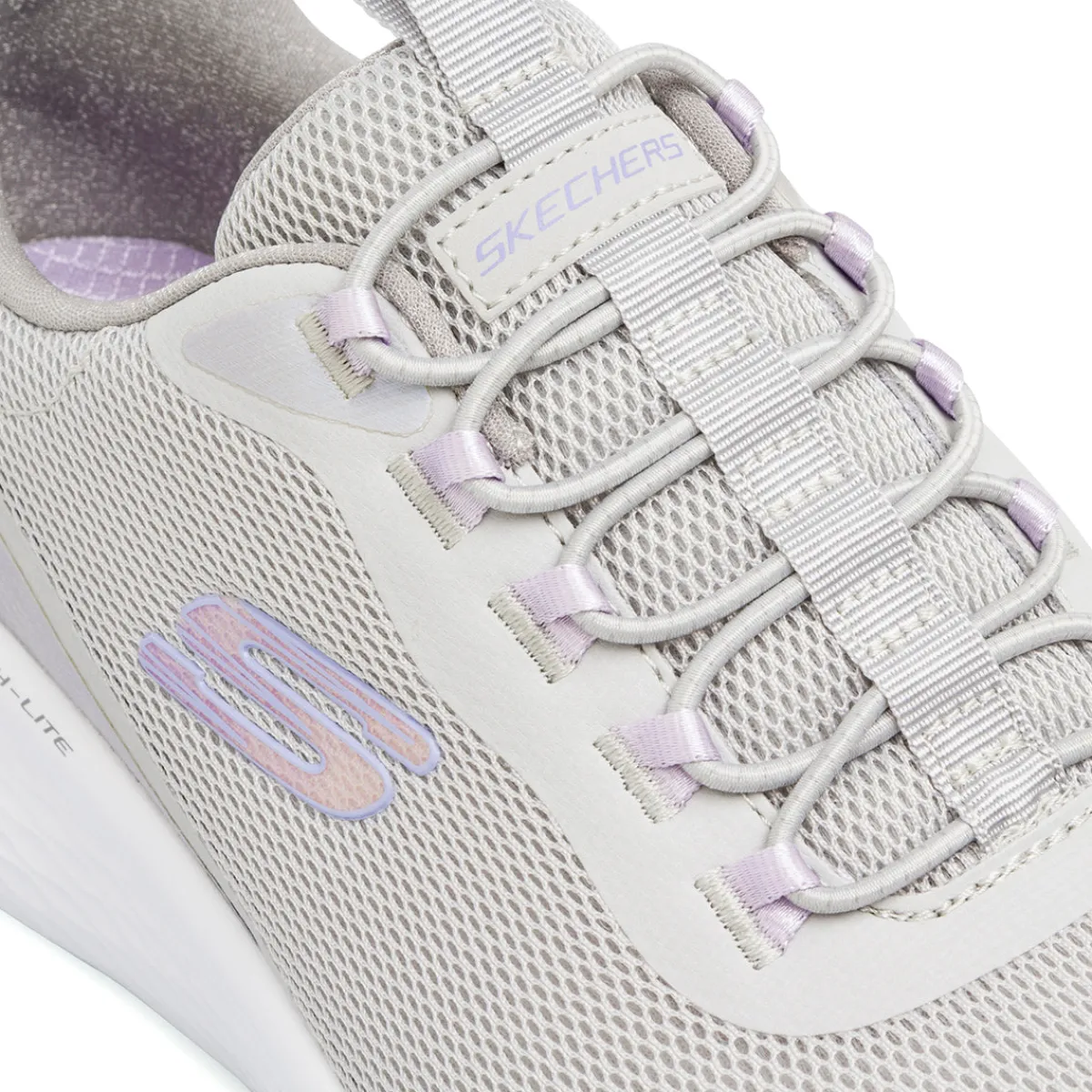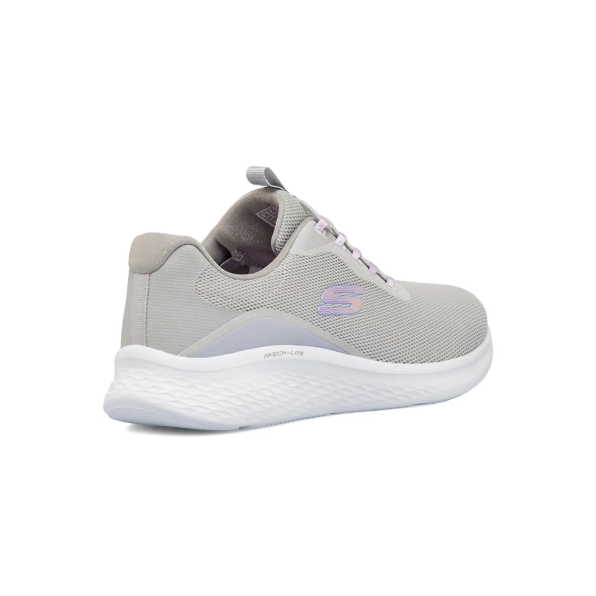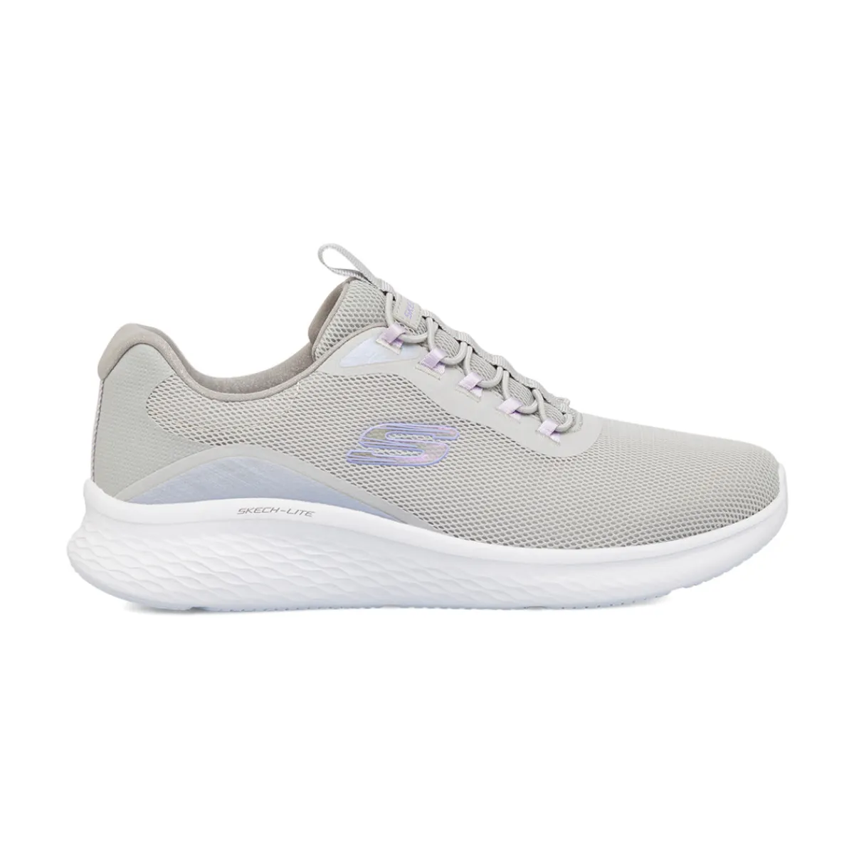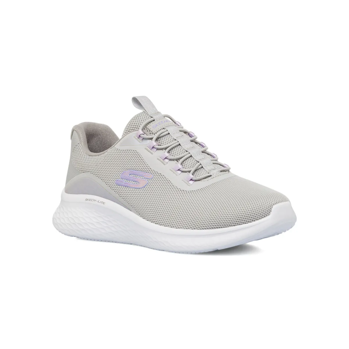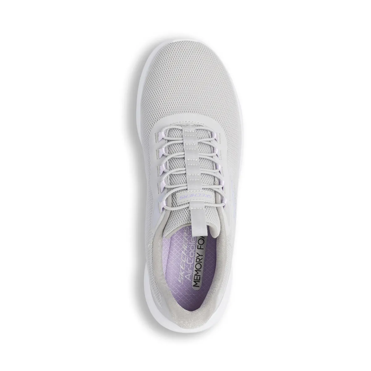 Sneakers slip-on da donna in tessuto mesh colore grigio con inserti lilla, lacci elastici e sottopiede in memory foam, occhielli in tessuto e tirante sulla linguetta .