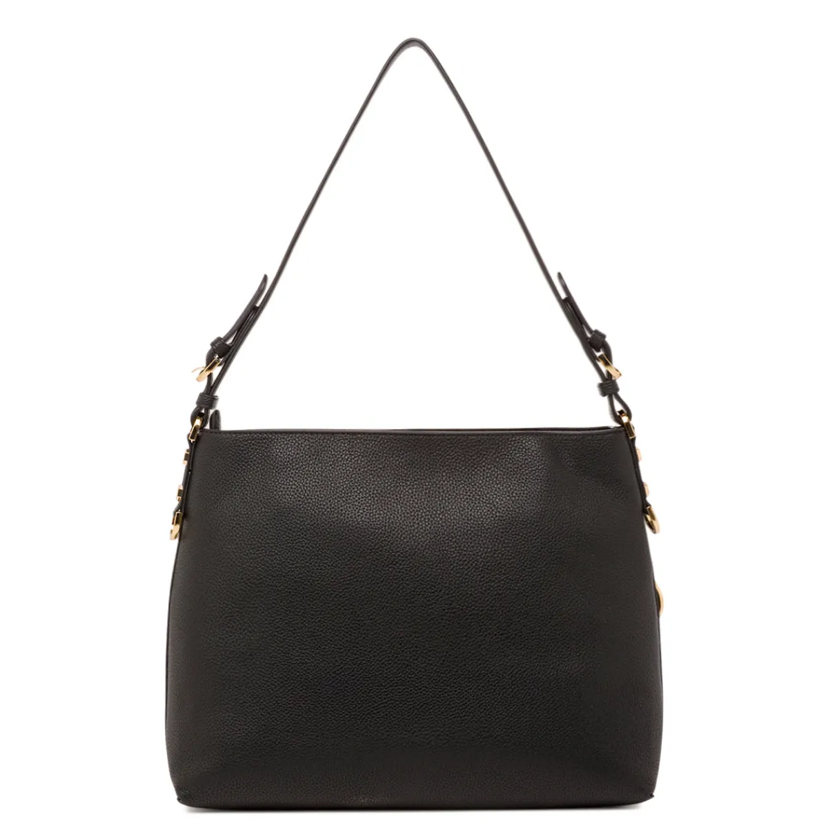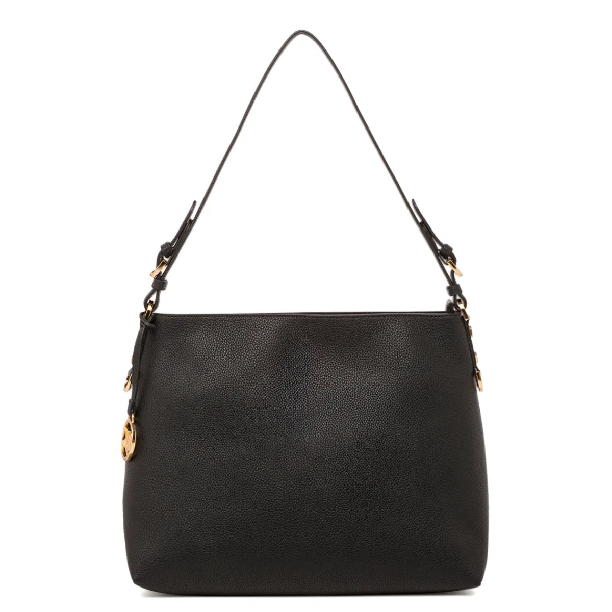 Elegante borsa a mano nera da donna Lumberjack, perfetta per completare il tuo outfit quotidiano. Realizzata in similpelle di ottima qualità, presenta dettagli in metallo color oro e un ciondolo con logo. La sua spaziosità la rende ideale per portare con te tutto l’essenziale. Un accessorio chic e versatile per ogni occasione.