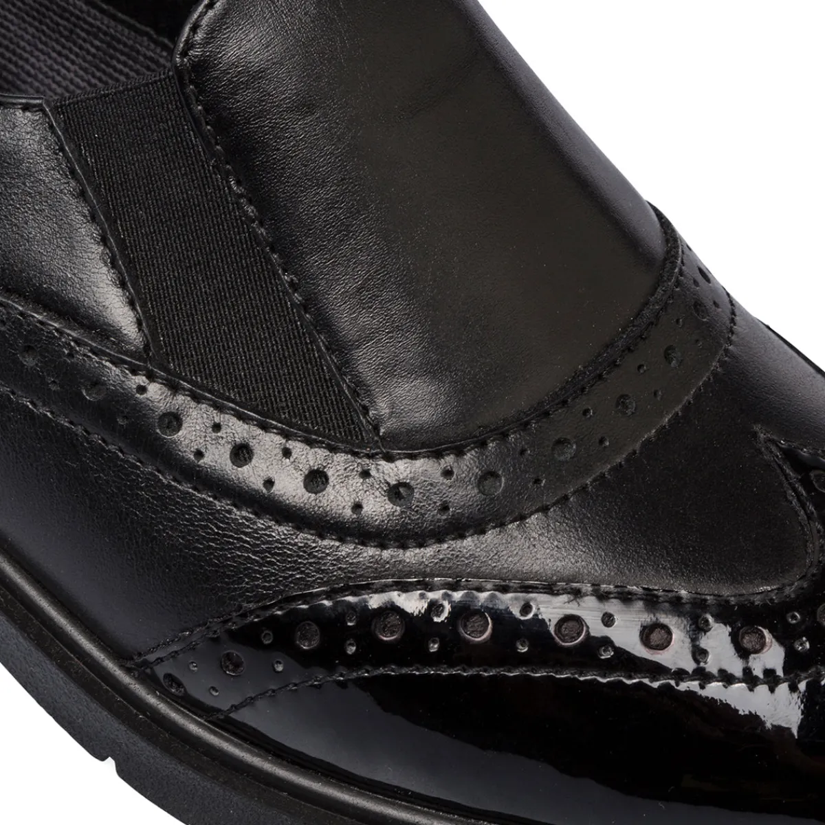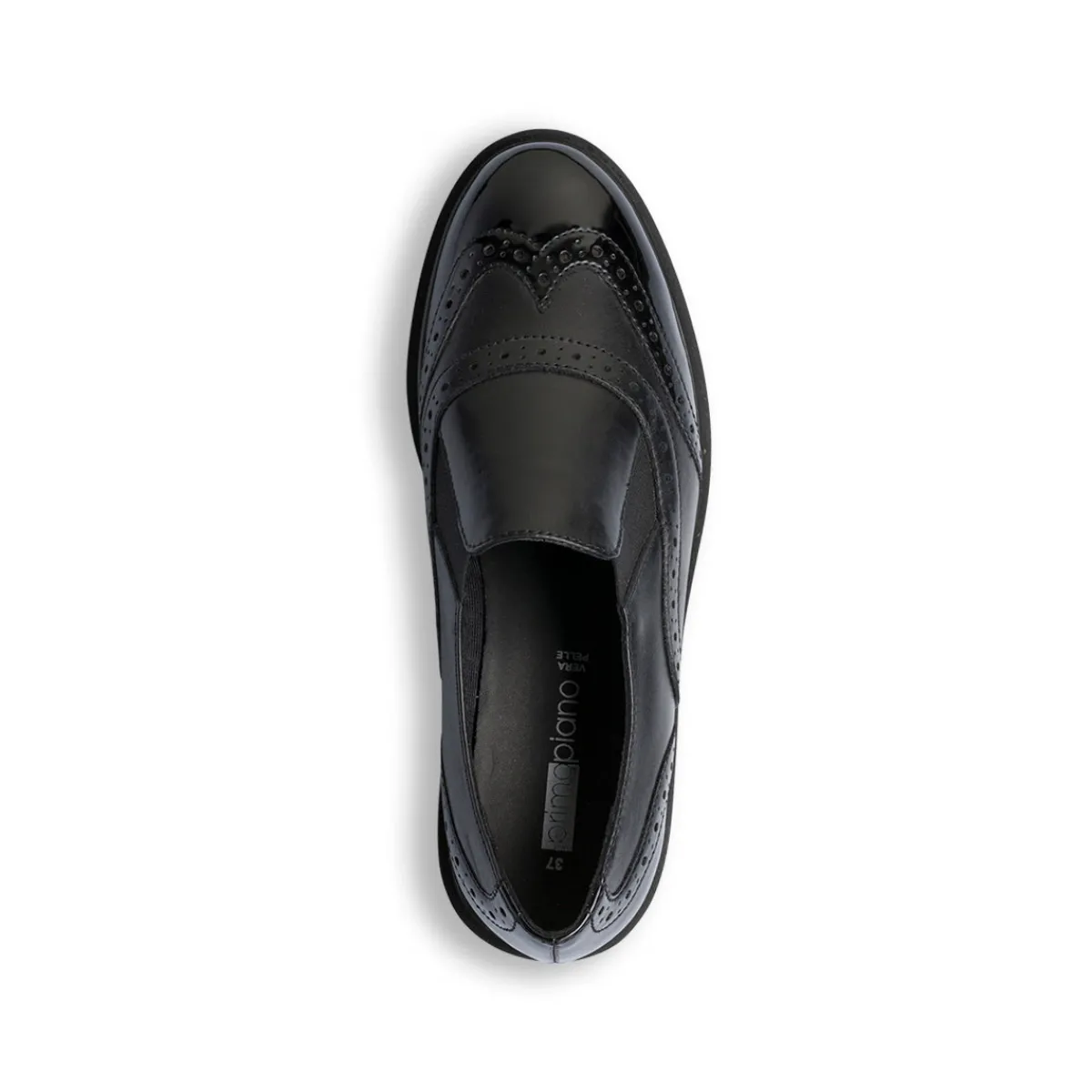 Mocassini slip-on da donna neri in pelle Primopiano con inserti in similpelle. La tomaia è realizzata in pelle e presenta un design elegante e raffinato con dettagli brogue e un inserto elastico sul retro per una calzata comoda. La suola in gomma garantisce un’ottima aderenza al terreno e un comfort prolungato. La fodera interna è in materiale tessile, per una sensazione di morbidezza e traspirabilità. Perfetti per un look casual chic, questi mocassini sono un must-have per ogni donna.