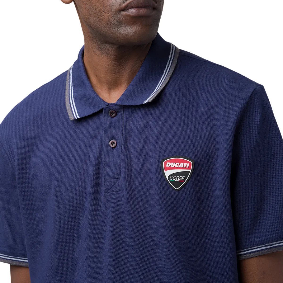 Polo da Uomo firmata Ducati, in cotone colore blu navy, con dettagli neri e grigi sul colletto e logo sul petto.