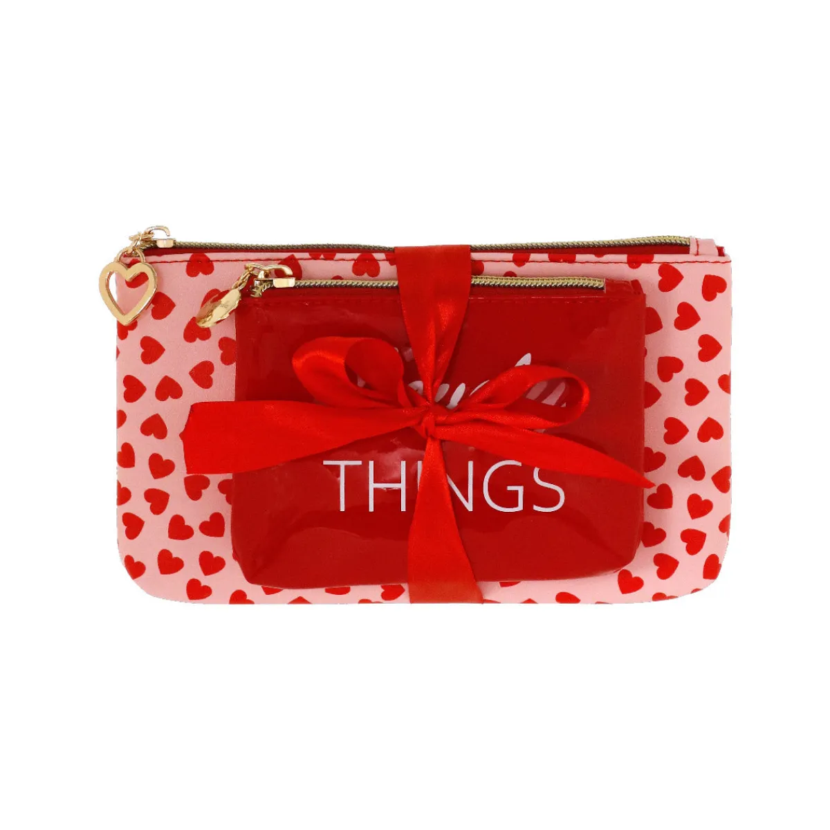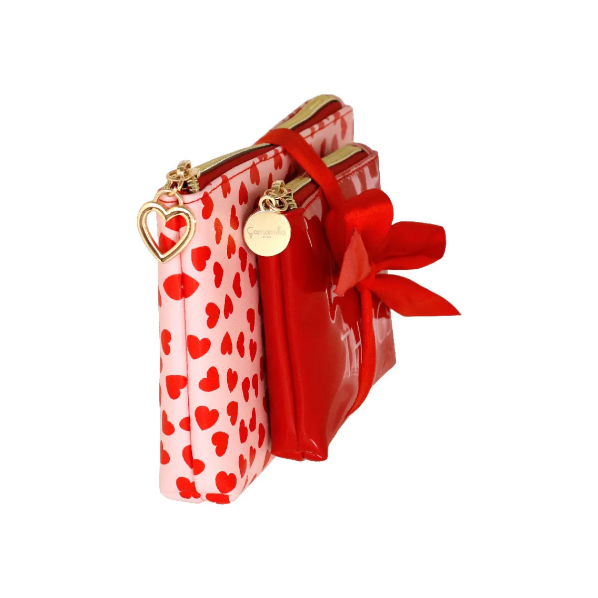 Regala stile e praticità al tuo beauty case con questo set di due trousse Camomilla! La trousse più grande, rosa con stampa cuori rossi, è perfetta per contenere trucchi e accessori più grandi, mentre la più piccola, rossa con scritta LOVELY THINGS, è ideale per i piccoli oggetti indispensabili. Le due trousse, chiuse da zip dorate, sono un accessorio must-have per tutte le amanti del brand Camomilla. Perfette anche come idea regalo.