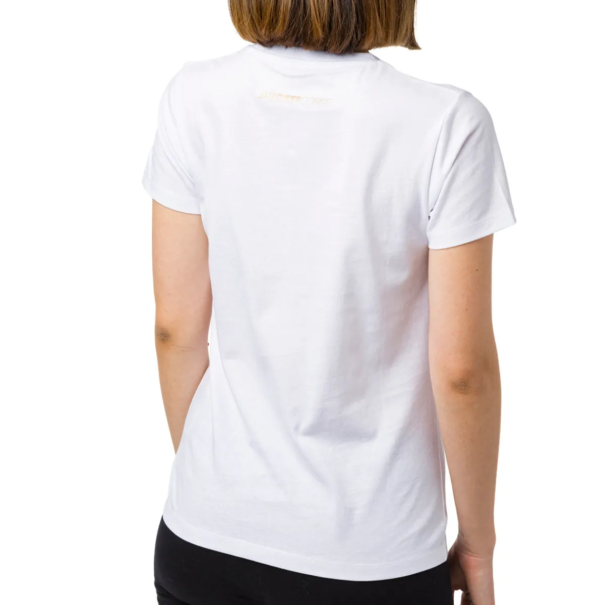 T-shirt da donna in cotone Ducati Corse colore bianco con logo frontale colore oro.