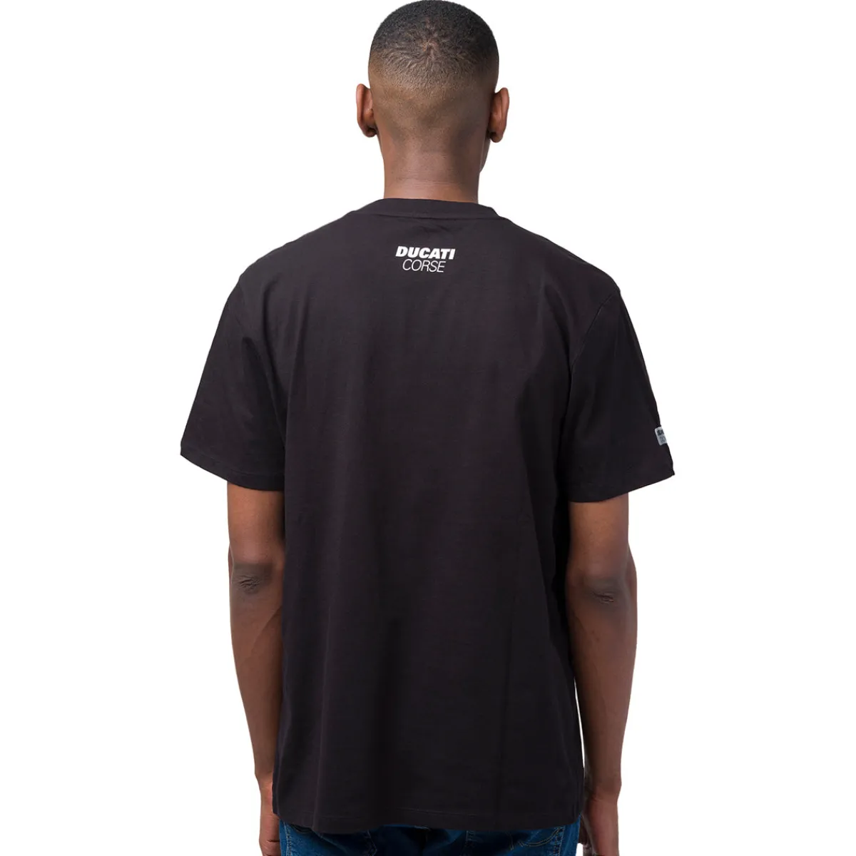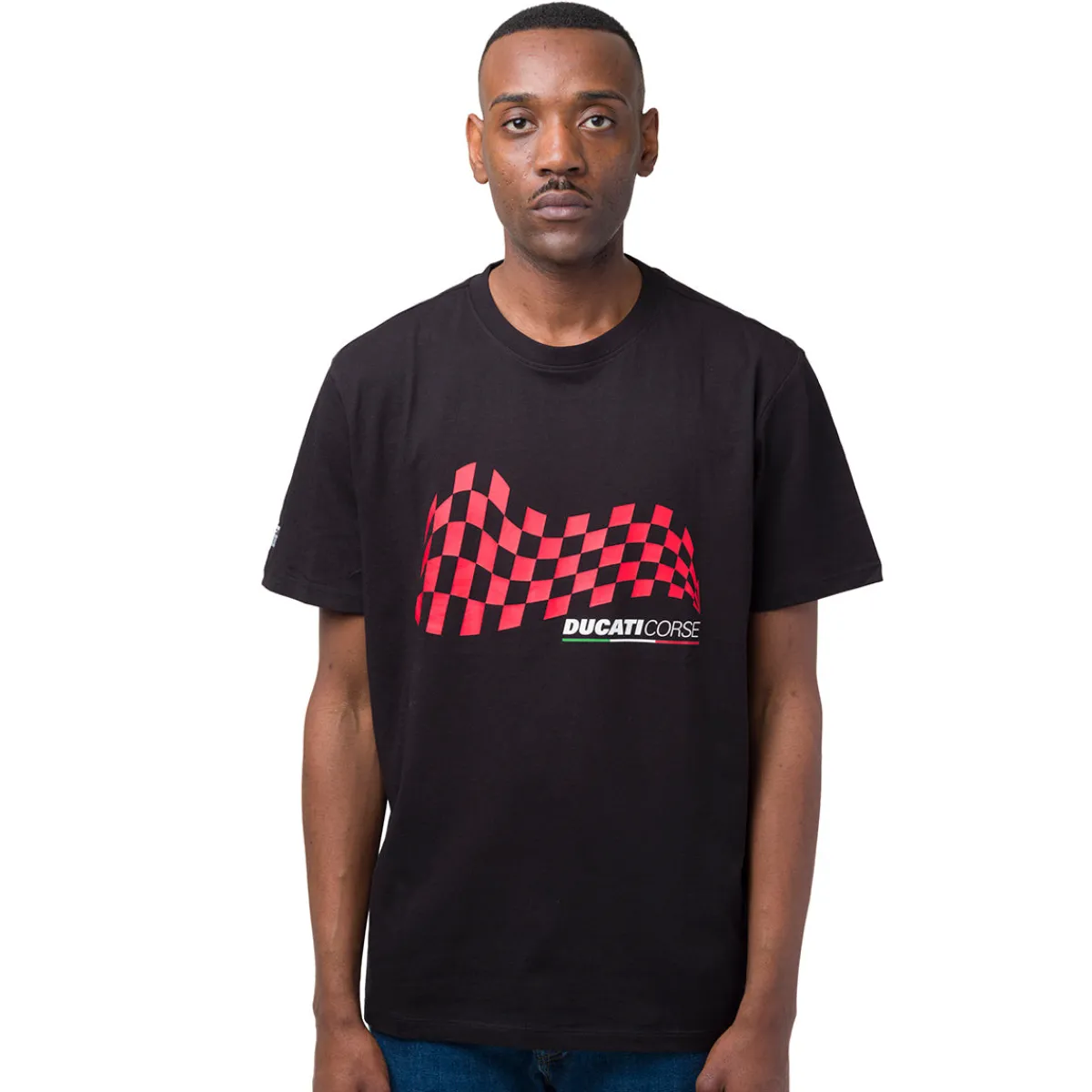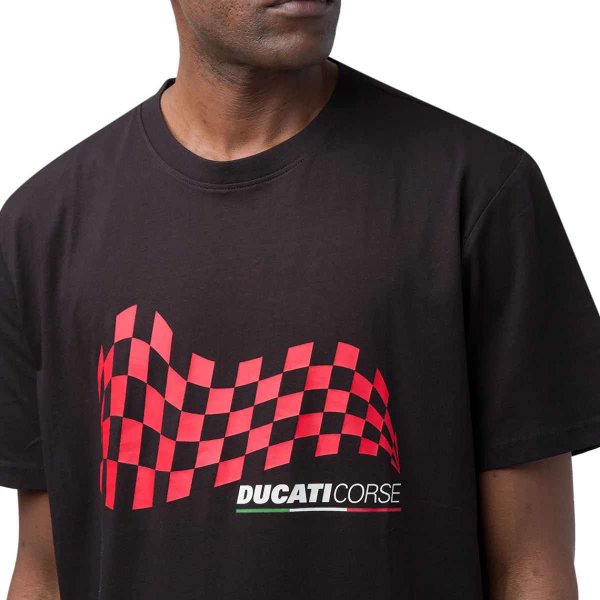 T-shirt da Uomo firmata Ducati Corse, realizzata in cotone colore nero con stampa bandiera frontale rossa e logo.