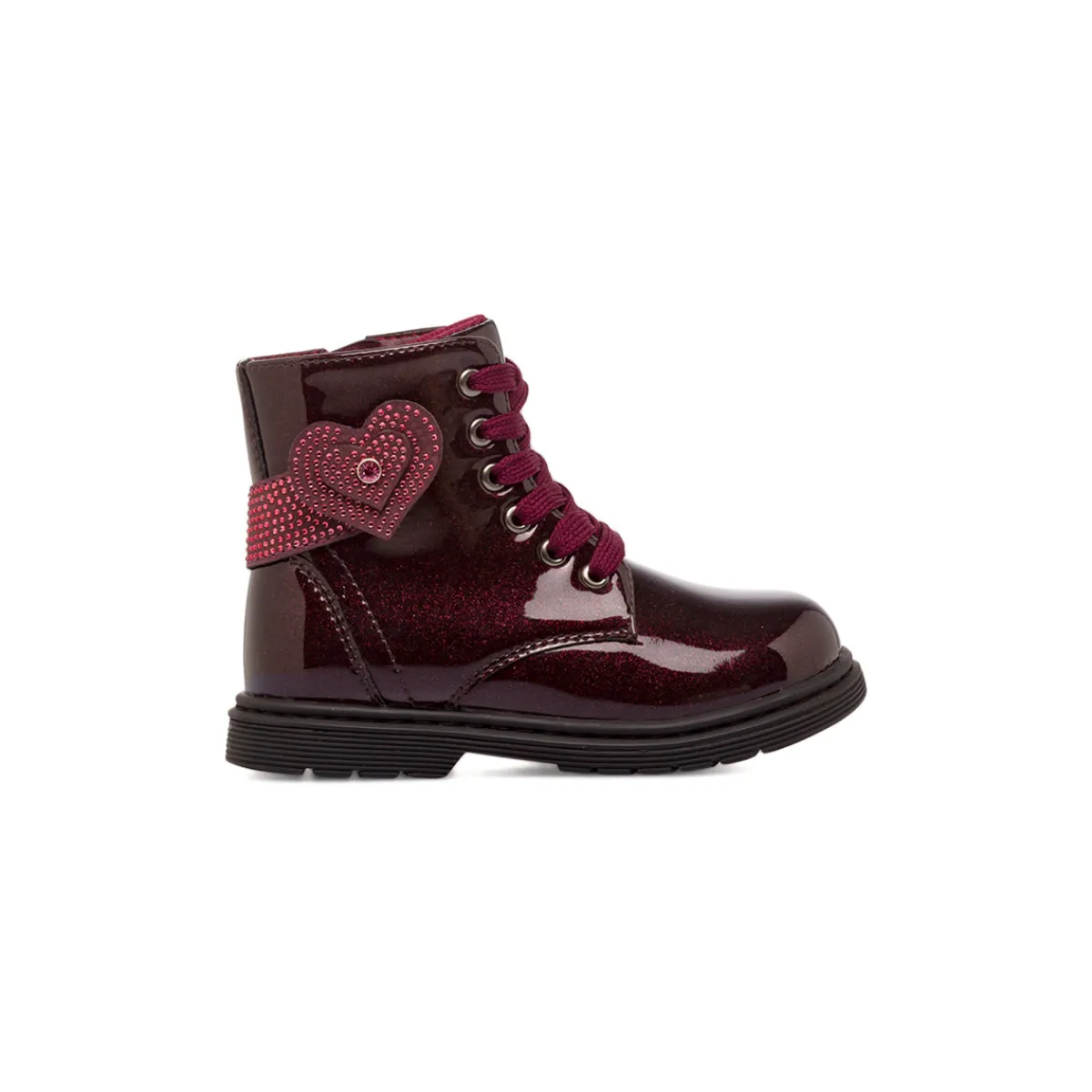 Questi anfibi Dieci Baci bordeaux da bambina sono perfetti per aggiungere un tocco di stile al look invernale della tua piccola. Realizzati in materiale sintetico lucido con effetto glitter, presentano una decorazione di cuori con strass e lacci bordeaux che rendono questi stivaletti unici. Ideali per le occasioni speciali e per essere sempre alla moda.
