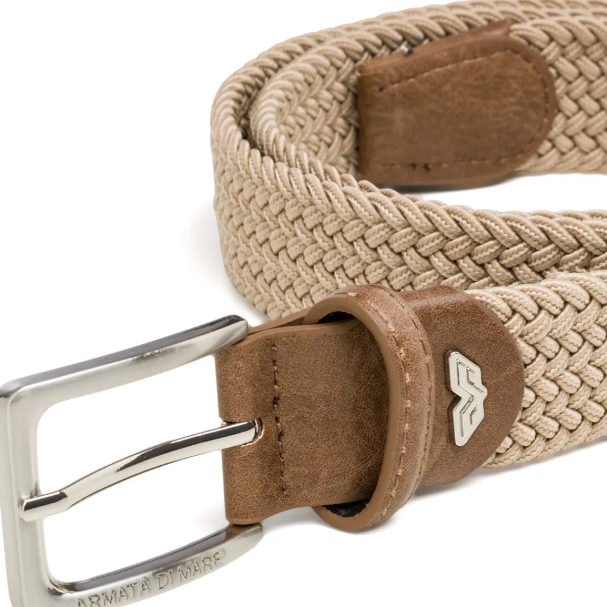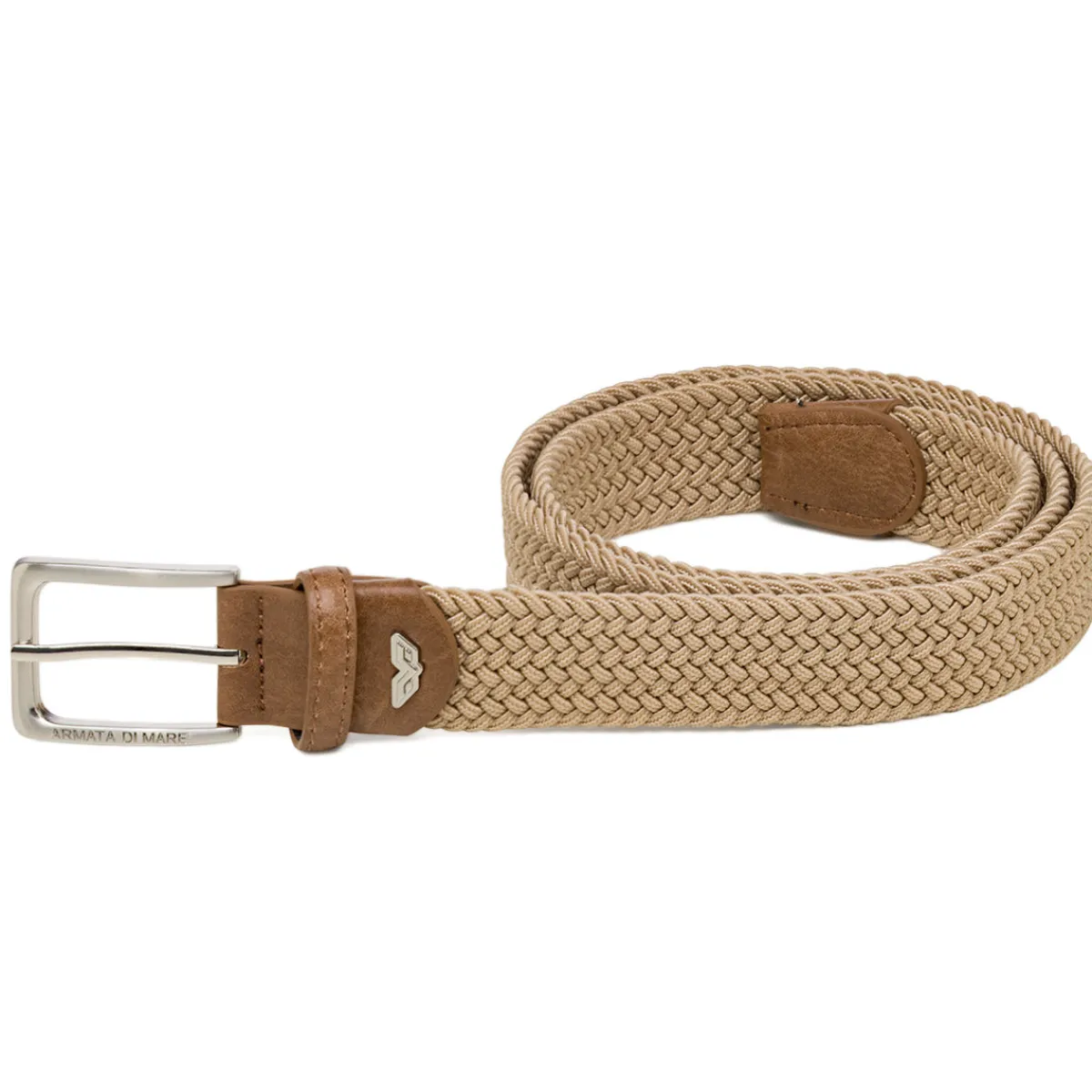 Questa cintura beige da uomo Armata di Mare è un accessorio versatile ed elegante. Realizzata in materiale tessile intrecciato, presenta una fibbia in metallo argentato e dettagli in similpelle marrone. Perfetta per un look casual o più formale, questa cintura è comoda e adatta all’uso quotidiano. Un tocco di stile discreto e raffinato per completare il tuo outfit.