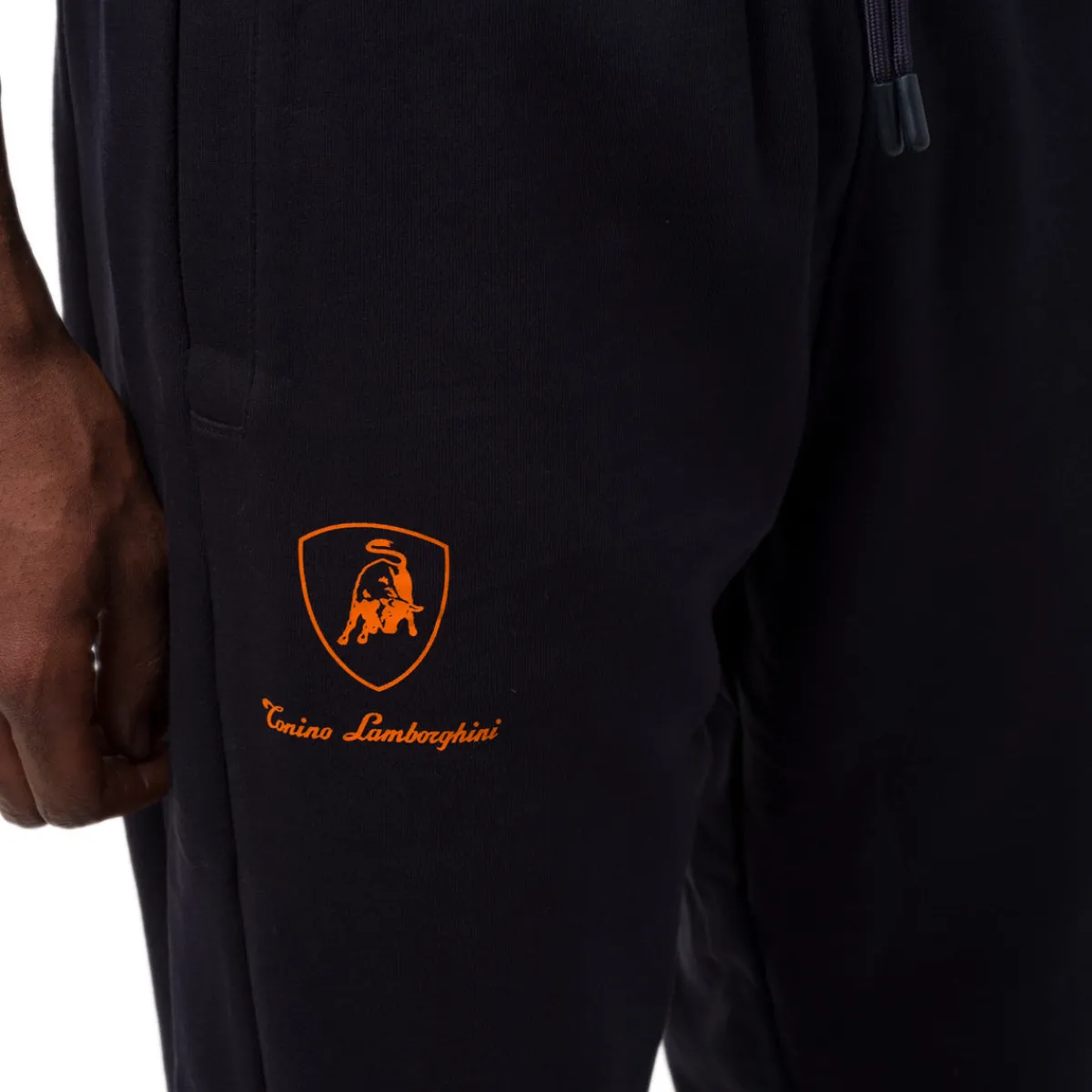 Pantaloni sportivi da uomo Tonino Lamborghini, in cotone colore blu con dettagli arancioni, logo e tasche e vita elasticizzata regolabile.