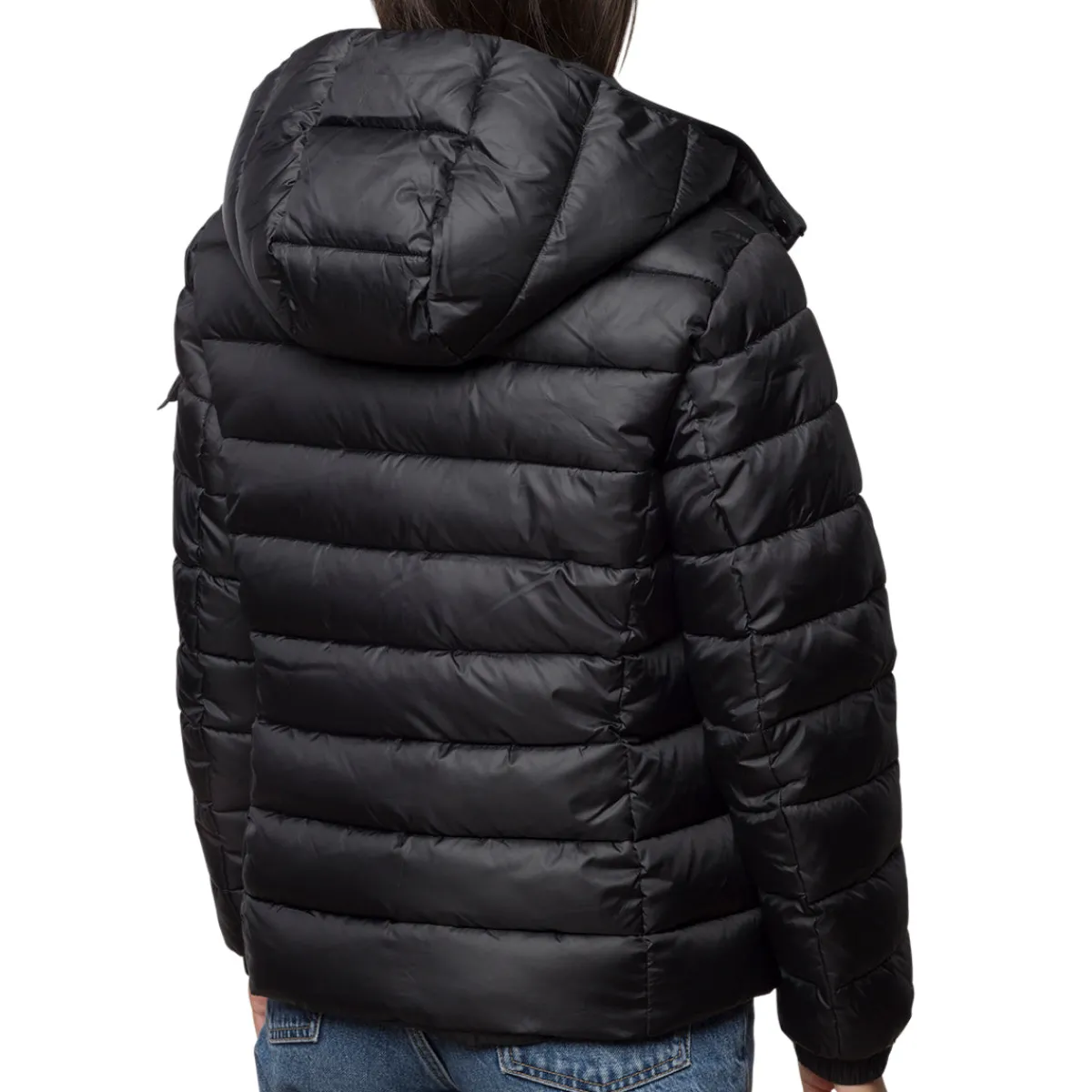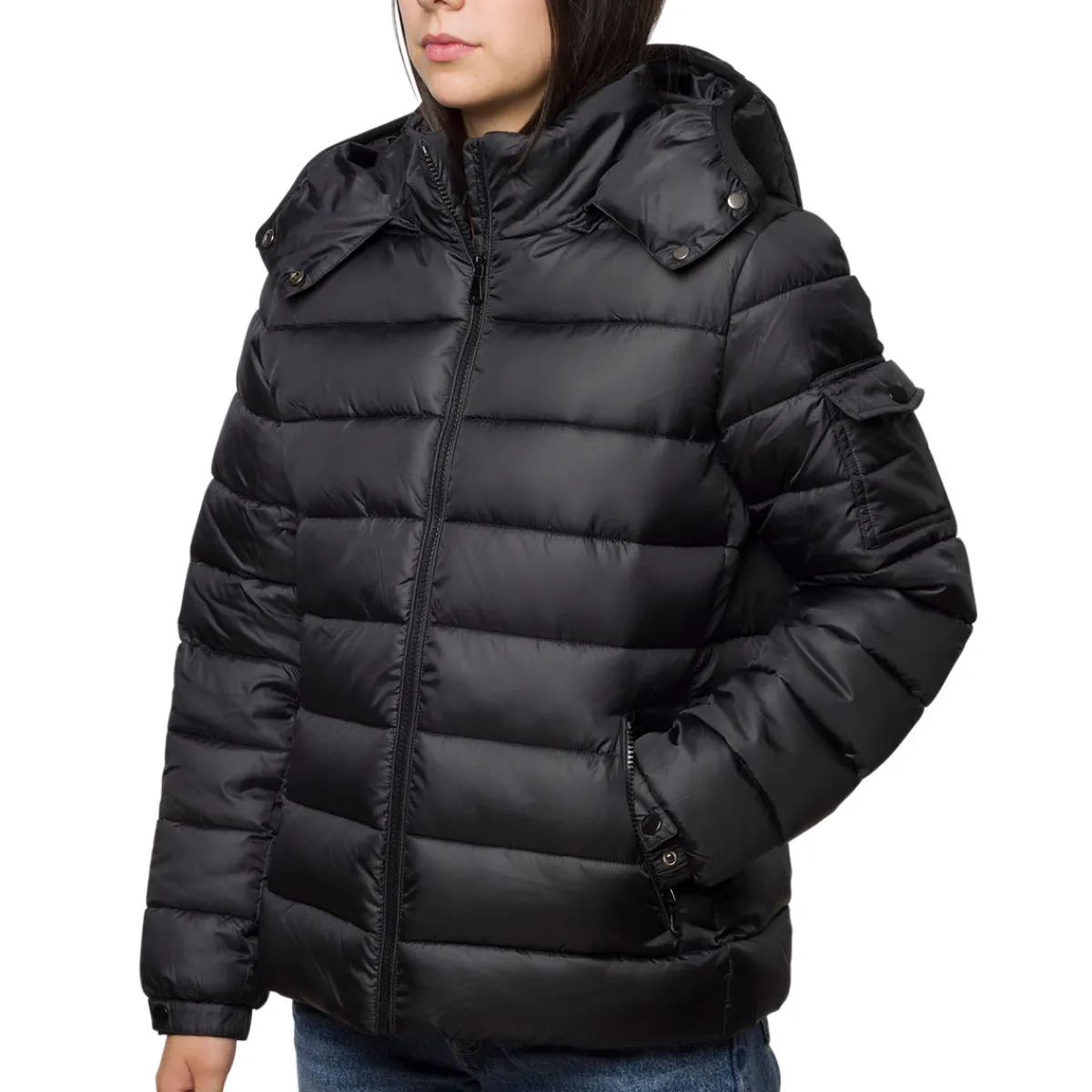 Piumino da donna Lora Ferres colore nero con cappuccio smontabile, colletto alto, chiusura a zip e tasche.